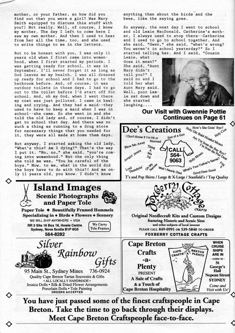 mother, or your father, so how did you find out that you were a girl? Was Mary Smith equipped to discuss this stuff with you?) Not really. Well, of course, I knew my mother. The day I left to come here I saw my own mother. And then I used to hear from her all the time, too, and she used to write things to me in the letters. But to be honest with you, I was only 11 years old when I first came into woman? hood, when I first started my periods. I was getting ready for school, it was in September. I'll never forget it as long as God leaves me my health. I was all dressed up ready for school and I had to go to the bathroom before. And, of course, it was outdoor toilets in those days. I had to go out to the toilet before I'd start off for school. And, oh my God, when I went there my coat was just polluted. I came in bawl? ing and crying. And they had a maid--they used to have to keep a maid when I was in school--she came. So she went in and she told the old lady and, of course, I didn't get to school that day. And there was no such a thing as running to a drug store for necessary things that you needed for it, they were all made at home them days. But anyway, I started asking the old lady, "What's this? Am I dying?" That's the way I put it. "No, no," she said, "you're com? ing into womanhood." But the only thing she told me was, "You be careful of the boys." Now, to me, what in the world did the boys have to do with this?! And me on? ly 11 years old, you know. I didn't know O J Island Images A Scenic Photographs Q' and Paper Tole Paper Tole Beautifully Framed Hummels Specializing in Birds Flowers Scenery WE WILL SHIP ANYWHERE • VISA ' ' RR 3 Site 16 Box 18, Howie Centre Sydney, Nova Scotia BI P 6G5 564-8282 We Carry Tole Frames anything then about the birds and the bees, like the saying goes. So anyway, the next day I went to school and old Lexie MacDonald, Catherine's moth? er, I always used to stop there--Catherine and I used to go to school together. And she said. "Gwen," she said, "what's wrong? You weren't in school yesterday?" So I started telling her. And I said, "Cousin Lexie, what does it mean?" She said, "Aunt Mary didn't tell you?" I said no and I told her what Aunt Mary said. Well, poor Lex? ie sat down and she started laughing.... Our Visit with Gwennie Pottie Continues on Page 61 SiCvtr %ginbow gifts o o 95 Main St., Sydney Mines 736-0924 Quality Cape Breton Tartan Souvenirs & Gifts • ALL LOCALLY HANDMADE • Jessica Dolls • Silk & Dried Flower Arrangements Porcelain Dolls • Tole Painting ORDERS ACCEPTED Dee's Creations I Don't Know If I'm Hit or Son o' ' '"'' vVn, How's She Goin' Bye? . 0 .' S'<' .''' v.<-''' A Ma Jig <...e'' OV 'e.,,,'''''' GoodOeaf Good T's and Pep Shirts / Large & X-Large / Stanfield's / Top Quality Original Needlecraft Kits and Custom Designs featurii' Historic and Scenic Sites and other subjects of local interest PLEASE CALL 849-0991 OR 539-5840 to order FOXBERRY COTTAGE CRAFTS Cape Breton Crafts -a- Plenty PRESENT A Sale of Crafts & a Touch of Cape Breton Hospitality WHEN CRUISE SHIPS ARE IN - come to - St George's Hall Nepean Street SYDNEY Come and Visit with Us! You have just passed some of the finest craftspeople in Cape Breton. Take the time to go back through their displays. Meet Cape Breton Craftspeople face-to-face.