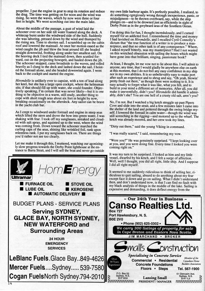 propeller. I put the engine in gear to stop its rotation and reduce the drag. The time was getting on for noon and the wind was rising. So were the waves, which by now were three or four feet in height. We went scorching out into the main lake. About the middle of the passage, a gust of wind laid the schooner over on her side till water foamed along the deck. A whitecap burst under the windward side of the hull. Suddenly she was laboring, pressed down by the wind and thumped by the rising sea. Time to shorten sail. I scrambled up on the cabin roof and lowered the mainsail. At once her motion eased as the wind caught the jib and blew the boat around till she headed straight downwind, frothing along under her smallest sail. On the heaving deck I tied the mainsail down, then scuttled for? ward, out on the projecting bowsprit, and hauled down the jib. The schooner stopped, came broadside to the waves, and rolled heavily as I clung to the deck and lashed down the sail. I hoist? ed the foresail alone, and she headed downwind again. I went back to the cockpit and started the engine. Hirondelle is unlikely ever to capsize, with a ton of lead along her keel, but she has a large open cockpit, where the helmsman sits; if that should fill up with water, she could founder. Objec? tively speaking, I'm certain that was never likely • but it is one thing to be objective in a warm, still study, another thing to cope with short rough seas about six feet in height by now, breaking occasionally on the afterdeck. Any sailor can be brave in the yacht club bar. As I crept to windward under foresail and engine in steep seas which lifted the stem and drove the bow into green water, I was shaking with fear. I took off my sunglasses, streaked and cloud? ed with salt spray, and squinted up to the west, where the wind was coming from. Down toward tfie schooner marched the curling caps of the seas, shining like wrinkled foil, rank upon relentless rank. I put my sunglasses back on. There are things you'd rather not see too clearly. Let me make it through this, I muttered, watching our agonizing? ly slow progress towards the Derby Point lighthouse at tfie en? trance to Barra Strait, and I will sell the boat and never go outside HomEnergy ?? FURNACE OIL ?? STOVE OIL ?? LUBE OIL ?? KEROSENE ?? AUTOMATIC DELIVERY ?? BUDGET PLANS - SERVICE PLANS Serving SYDNEY, GLACE BAY, NORTH SYDNEY, NEW WATERFORD and Surrounding Areas 24 HOUR EMERGENCY SERVICES LeBlanc Fuels.Glace Bay..849-4626 Mercer Fuels....Sydney 539-7580 Cogan FuelsNorth Sydney.794-2010 my own little harbour again. It's perfectly possible, I realized, to do something egregiously wrong through inexperience, panic, or misjudgment • to be thrown overboard, say, while the ship plunges on • and to be drowned just as efficiently in sight of Derby Point as in the greybeard seas of the Southem Cteean. I'm doing this for fun, I thought incredulously, and I cursed myself for an addicted fool. I remembered the time and money I had lavished on Hirondelle, and I recalled Cyril Connolly's dictum that "the true function of a writer is to produce a mas? terpiece, and that no other task is of any consequence." Where, I asked myself bitterly, was my masterpiece? Had I not wasted on this wretched obsession with sailing the hours which might have gone into that brilliant, singing, passionate book? At least, I thought, let me vow not to he about this. I wiU admit to anyone, any time, that I would gladly be anywhere else on earth at this moment, that I do not feel any easy confidence in my ship nor in my own abiUties. It is so unbeUevably easy to make port after such an experience and to shmg and say, "Oh yeah, blowin' pretty fresh out there," as though there were nothing to it. It is easy actually to forget what it was like, what you felt, and to build in your mind a different set of memories. After all, you did make it uneventfully, didn't you? Hirondelle did handle it admir? ably, didn't she? You are one heU of a crasty old salt, aren't you? No, I'm not. But I watched a big ketch straggle up past Pipers Cove and sUde into the strait, and a few minutes later I came into the shelter of the land and pottered through the swing bridge my? self. I lowered the foresail in calm water • though the wind was still screeching in the rigging • 'and motored up to the wharf. The ketch was akeady moored, and her crew took my lines. "Dirty out there," said the young Viking in command. "I was really scared," I said, remembering my vow. "Were you?" He was genuinely surprised. "I kept looking over at you, and you were doing fine. Every time I looked you were coming right on." It was my tum to be surprised. I looked at him and my little vessel, dwarfed by his ketch, and I felt a surge of affection. Well, well I thought, you did all right, little ship. And I suppose I did all right myself. It seemed to me suddenly ridiculous to think of selling her, ri? diculous to quit sailing, absurd to do anything about my fear except face it down and go on sailing. What I didn't understand then, and don't understand now, is that I can find no fault with my black analysis of things in the middle of the lake. SaiUng is expensive and demanding, it does deflect energy from the ~ Our 24th Year in Business ~ Canso Realties Ltd. Box 727 Port Hawkesbury, N. S. BOE 2V0 • Phone (902) 625-0302 • We carry 300 listings of property for sale in Cape Breton and Eastem Nova Scotia. JIM MARCHAND ? BROKER ('' mdb ''KislrMctb/i specializing in Concrete Service '' * Member of the Residential CanadianHome Builders Association Commercial Concrete Foundations Floors • Steps Lansing Small PRESIDENT / MANAGER Tel. 567-1900 51 Glencaim Ave. Sydney, N.S. i B1R1L5 5