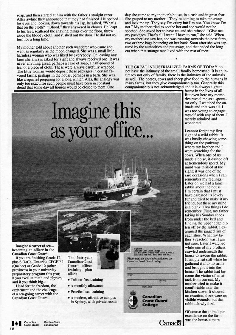 soap, and then started at him with the father's straight razor. After awhile they announced that they had finished. He opened his eyes and looking down towards his lap, he asked, "What's that on the cloth?" "Blood," they answered in choras. He leapt to his feet, scattered the shaving things over the floor, threw aside the bloody cloth, and rushed out the door. He did not re? tum for a long time. My mother told about another such wanderer who came and went as regularly as the moon changed. She was a small Httle harmless woman who was liked by everybody. On leaving any farm she always asked for a gift and always received one. It was never anything great, perhaps a cake of soap, a half-pound of tea, or a piece of cloth. These were always carefully wrapped. The little woman would deposit these packages in certain fa? vored farms, perhaps in the house, perhaps in a bam. She was like a squirrel preparing for a long winter. Alas, the analogy was only too exact, for such people must have been in constant dread that some day all houses would be closed to them. One day she came to my motlier's house, in a rash and in great fear. She gasped to my mother: "They're coming to take me away and lock me up. They say I'm crazy but I'm not. You know I'm not." My mother tried to soothe her and she would not be soothed. She asked her to have tea and she refused. "Give me my packages. That's all I want. I have to run," she said. When my mother last saw her, she was ranning towards the next farm, two or three bags bouncing on her back. Soon after she was cap? tured by the auSiorities and put away, and that ended the long era when that strange race Uved with the rest of men. THE GREAT INDUSTRIALIZED FARMS OF TODAY do not have the intimacy of the small family homestead. It is an in? timacy not only of family, there is the intimacy of the animals as well. The horses, cows and sheep give food to the humans in many farms, but they give companionship too. Generally this companionship is not acknowledged and it is always a great j factor in the lives of all. But even here my memo- Imagine this as your office... Imagine a career at sea... becominjj an olTicor in the Canadian ('oasl Guard. ir vou are finishing (irade 12 plus 0 OAC's (Ontario), CECiKI' (Quebec) or (Irade 12 (oilier provinces) in your university preparatory program this year, if you excel at math and physics, and if you think big... 1 lead for the freedom, tlie excitement and tlie challenge of a sea-going career with the Canadian Coast (iuard. 1*1 The f()ur->ear Ceuiadian Coast Ciuard officer training plan offers: • Tuition-free training • . monthly allowance • Practical sea training • A modern, attractive campus in Sdney, with private rooms %. Canadian Coast Guard College Canada ries reveal me as a specta? tor only. I watched the an? imals and that was all. I was too young to engage myself with any of them. I merely admired and wondered. I cannot forget my first sight of a wild rabbit. It was busily chewing some? thing on the pathway where my brother and I were searching for the cows. When one of us made a noise, it dashed off at tremendous speed. My mind was thrilled at the sight; it was one of the rare occasions when 1 can remember my feelings. Later on we had a tame rabbit about the house. I'm certain that I must have caressed its lovely fur and tried to make it my friend, but there my mind is a blank. Two things 1 do remember. First, my father taking his Sunday shoes from under the bed and finding the upper edge bit? ten off by the rabbit. I ex? amined the jagged rim of each shoe. What my fa? ther's reaction was, I am not sure. Later I watched while one of my brothers crawled underneath the house to rescue the rabbit. It simply sat still while he gathered it into his arms and brought it into the house. The rabbit had be? come the victim of an at? tack from our cat. My mother tried to make it comfortable near the kitchen stove. It showed no reaction, there were no visible wounds, but the rabbit slowly died. Of course the animal par excellence on the farm was the horse, a mare