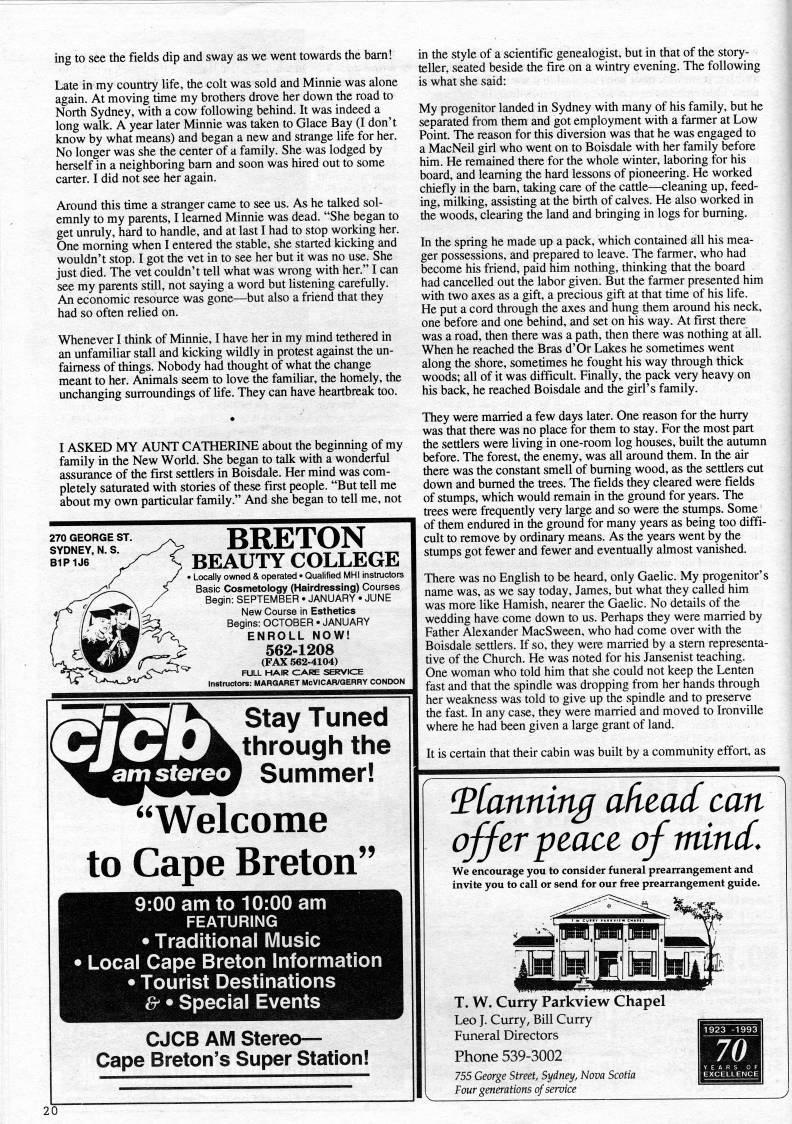 ing to see the fields dip and sway as we went towards the bam! Late in my country life, the colt was sold and Minnie was alone again. At moving time my brothers drove her down the road to North Sydney, with a cow following behind. It was indeed a long walk. A year later Minnie was taken to Glace Bay (I don't know by what means) and began a new and strange life for her. No longer was she the center of a family. She was lodged by herself in a neighboring bam and soon was hired out to some carter. I did not see her again. Around this time a stranger came to see us. As he talked sol? emnly to my parents, I leamed Minnie was dead. "She began to get unraly, hard to handle, and at last I had to stop working her. One moming when I entered the stable, she started kicking and wouldn't stop. I got the vet in to see her but it was no use. She just died. The vet couldn't tell what was wrong with her." I can see my parents still, not saying a word but listening carefully. An economic resource was gone • but also a friend that they had so often relied on. Whenever I think of Minnie, I have her in my mind tethered in an unfamiliar stall and kicking wildly in protest against the un- faimess of things. Nobody had thought of what the change meant to her. Animals seem to love the familiar, the homely, the unchanging surroundings of Ufe. They can have heartbreak too. I ASKED MY AUNT CATHERINE about the beginning of my family in the New World. She began to talk with a wonderful assurance of the first settlers in Boisdale. Her mind was com? pletely saturated with stories of these first people. "But tell me about my own particular family." And she began to tell me, not 270 GEORGE ST. SYDNEY, N. S. B1P1J6 BRETON BEAUTY COLLEGE ?? Locally owned & operated • Qualified MHI instructors Basic Cosmetology (Hairdressing) Courses Begin: SEPTEMBER • JANUARY • JUNE New Course in Esthetics Begins: OCTOBER • JANUARY ENROLL NOW! 562-1208 (FAX 562-4104) FULL HAIR CARE SERVICE Instructors: MARGARET McVICAR/QERRY CONDON Stay Tuned through the Summer! "Welcome to Cape Breton" 9:00 am to 10:00 am FEATURING • Traditional Music Local Cape Breton Information Tourist Destinations ' • Special Events CJCB AM Stereo- Cape Breton's Super Station! in the style of a scientific genealogist, but in that of the story? teller, seated beside the fire on a wintry evening. The following is what she said: My progenitor landed in Sydney with many of his family, but he separated from them and got employment with a farmer at Low Point. The reason for this diversion was that he was engaged to a MacNeil girl who went on to Boisdale with her family before him. He remained there for the whole winter, laboring for his board, and learning the hard lessons of pioneering. He worked chiefly in the bam, taking care of the cattle • cleaning up, feed? ing, milking, assisting at the birth of calves. He also worked in the woods, clearing the land and bringing in logs for burning. In the spring he made up a pack, which contained all his mea? ger possessions, and prepared to leave. The farmer, who had become his friend, paid him nothing, thinking that the board had cancelled out the labor given. But the farmer presented him with two axes as a gift, a precious gift at that time of his life. He put a cord through the axes and hung them around his neck, one before and one behind, and set on his way. At first there was a road, then there was a path, then there was nothing at all. When he reached the Bras d'Or Lakes he sometimes went along the shore, sometimes he fought his way through thick woods; all of it was difficult. Finally, the pack very heavy on his back, he reached Boisdale and the girl's family. They were married a few days later. One reason for the hurry was that there was no place for them to stay. For the most part the settlers were living in one-room log houses, built the autumn before. The forest, the enemy, was all around them. In the air there was the constant smell of buming wood, as the settlers cut down and bumed the trees. The fields they cleared were fields of stumps, which would remain in the ground for years. The trees were frequently very large and so were the stumps. Some of them endured in the ground for many years as being too diffi? cult to remove by ordinary means. As the years went by the stumps got fewer and fewer and eventually almost vanished. There was no English to be heard, only Gaelic. My progenitor's name was, as we say today, James, but what they called him was more like Hamish, nearer the GaeUc. No details of the wedding have come down to us. Perhaps they were married by Father Alexander MacSween, who had come over with the Boisdale settlers. If so, they were married by a stern representa? tive of the Church. He was noted for his Jansenist teaching. One woman who told him that she could not keep the Lenten fast and that the spindle was dropping from her hands through her weakness was told to give up the spindle and to preserve the fast. In any case, they were married and moved to Ironville where he had been given a large grant of land. It is certain that their cabin was built by a community effort, as Tianning ahead can | offer-peace of mind. We encourage you to consider funeral prearrangement and invite you to call or send for our free prearrangement guide. T. W. Curry Parkview Chapel Leo J. Curry, Bill Curry Funeral Directors Phone 539-3002 7b5 George Street, Sydney, Nova Scotia Four generations of service