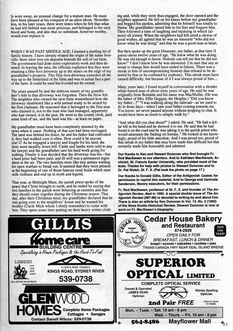 Published by Ronald Caplan on 1994/8/1 (425 reads)ly wore away, an unusual change for a mature man. He must have been pleased at his conquest of an aUen idiom. Neverthe? less, in his later years, there were times when he felt that what he had left behind was more precious, and belonged to his very blood and bone, and also that no substitute, however worthy, would ever replace it. WHEN I WAS PAST MIDDLE AGE, I leamed a startUng bit of family history. I have already related the origin of the name Iron- viUe: there were iron ore deposits beneath the soil of our farm. The govemment had done some exploratory work and then de? sisted. In leaving the area, the officials explained that they were retaining a fifty-foot driveway up to the mines on the edge of my grandfather's property. This fifty-foot driveway extended all the way up to the hinterland of the farm and was in actual fact a part of ihe farm. It could be used but it could not be owned. The years passed by and the dubious nature of my grandfa? ther's title to that driveway was forgotten. Then the blow fell. The neighbor who owned the next farm remembered how the driveway slumbered like a wild animal ready to be seized by the first claimant. He reasoned that it belonged to the first man who claimed it, not to the man who had managed, apparently who had owned, it in the past. He went to the county clerk, paid some kind of tax, and the land was his • at least on paper. My grandfather must have been completely stunned by the news when it came. Nothing of that sort had been envisaged. The land was behind his fence, he and his father had cultivated it, they had walked over it often. How could it be anyone else's? As he engaged a lawyer and fought for his land, the farm went steadily down hill. Cattle and lambs were sold to pay the lawyer and the grandfather saw his hard work going for nothing. Finally it was decided that the driveway was his • but a hard price had been paid, and ill-will was a permanent ingre? dient in the air. The two families were like tiny armies waiting for open warfare to break out. It seemed that they were present at the beginning of one of those famous mral feuds which start with violence and end up in myth and legend. That year, at Midnight Mass, the parish priest spoke of the peace that Christ brought to earth, and he ended by saying that two families in the parish were behaving as enemies and that they should come together during the Christmas season. That day, after their Christmas meal, my grandfather declared that he was going over to the neighbors' house and he wanted his brother (Uncle Mick whom I dimly remember) to come with him. They spent some time putting on their heavy winter cloth- GILLIS 'ibmecare • ?iBUILDING CENTRE""" wmmwi I CALL us FOR AN ESTIMATE FLOOR & ROOF TRUSSES KINGS ROAD, SYDNEY RIVER 539-0738 GLENWODD HOMES ' Complete Home Packages Cottages • Garages Contact Darren Wilcox: 539-0738 ing and, while they were thus engaged, the door opened and the neighbor appeared. He fell on his knees before my grandfather and begged his pardon, admitting that he himself was totally to blame. My grandfather raised him to his feet and forgave him. Then followed a time of laughing and rejoicing in which (al? most) all joined. When the neighbors had left amid a choms of good wishes, all agreed that he was an innocent "who did not know what he was doing" and that he was a good man at heart. But then spoke up the great Dissenter, my father, at that tune (I guess) about twelve years of age. "He knew what he was doing. He was old enough to know. Nobody can teU me that he did not know!" I don't know how he was answered. I'm sure that any at? tempt to change him would have ended in failure. There was a streak in him of uncompromising honesty that refused to be de? terred by fear or be confused by sophistry. This streak must have caused difficulty, but because of it I was always proud of him.... Many years later, I found myself in conversation with a slender white-haired man of about sixty years of age. He said he was originaUy from Boisdale and his name was MacMuUin. (He was the father of Mrs. Effie Duggan, the Heights.) "Did you know my father...?" "I was walking along the railroad • as we used to do in those days • when I saw your father coming towards me. You know, we never passed anyone without stopping to chat. It would have been an insult to simply waUc by." "And what did you chat about?" I asked. He said, "He had a dol? lar bUl in his hand and he showed it to me. He said that he had found it on the road and he was taking it to the parish priest who would announce the finding on Sunday." He looked at me know? ingly, proud of his little anecdote. And I was proud too, proud of that streak in my father that may have made him difficult but that certainly made him honorable and admired. Our thanks to Ken and Stewart Donovan who first brought Fr. Rod MacSween to our attention. And to Kathleen MacKenzie, Ar? chivist, St. Francis Xavier University, who provided most of the texts. Thanks for help with photos to Stewart Donovan and to Dr. Pat Walsh, St. F. X. (Pat took the photo on page 17.) Our thanks to Donald Gillis, Editor of the Antigonish Casket, for permission to reprint this material. And to George and Gertrude Sanderson, literary executors, for their permissions. Fr. Rod MacSween, professor at St. F. X. and founder of The An? tigonish Review, died in 1990. A special double issue of The An? tigonish Review {#87-BB) is devoted to writing by and about him. There is also an article by Ken Donovan in Vol. 13, No. 2 (1993) of the Nova Scotia Historical Review. Stewart Donovan is now at work on Fr. MacSween's biography. Cedar House Bakery and Restaurant 674-2929 OPEN DAILY FOR BREAKFAST, LUNCH & DINNER bread • scones • oatcakes • cookies • pies TFIANS-CANADA HWY NEAR SEAL ISUND BRIDGE "'U'- SUPERIOR OPTICAL LIMITED COMPLETE OPTICAL SERVICE ' n l Shirley Sparling Optician Owned & Operated JAMES DEAN O