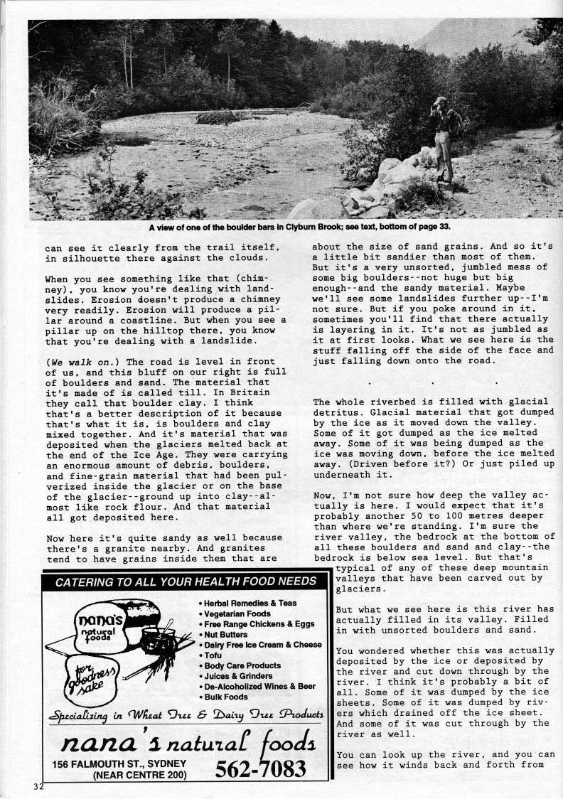 Published by Ronald Caplan on 1994/8/1 (245 reads);';;'._ A view of one of the boulder bars in Clyburn Brook; see text, bottom of page 33. can see it clearly from the trail itself, in silhouette there against the clouds. When you see something like that (chim? ney) , you know you're dealing with land? slides. Erosion doesn't produce a chimney very readily. Erosion will produce a pil? lar around a coastline. But when you see a pillar up on the hilltop there, you know that you're dealing with a landslide. (We walk on.) The road is level in front of us, and this bluff on our right is full of boulders and sand. The material that it's made of is called till. In Britain they call that boulder clay. I think that's a better description of it because that's what it is, is boulders and clay mixed together. And it's material that was deposited when the glaciers melted back at the end of the Ice Age. They were carrying an enormous amount of debris, boulders, and fine-grain material that had been pul? verized inside the glacier or on the base of the glacier--ground up into clay--al? most like rock flour. And that material all got deposited here. Now here it's quite sandy as well because there's a granite nearby. And granites tend to have grains inside them that are CATERING TO ALL YOUR HEALTH FOOD NEEDS about the size of sand grains. And so it's a little bit sandier than most of them. But it's a very unsorted, jumbled mess of some big boulders--not huge but big enough--and the sandy material. Maybe we'll see some landslides further up--I'm not sure. But if you poke around in it, sometimes you'll find that there actually is layering in it. It's not as jumbled as it at first looks. What we see here is the stuff falling off the side of the face and just falling down onto the road. The whole riverbed is filled with glacial detritus. Glacial material that got dumped by the ice as it moved down the valley. Some of it got dumped as the ice melted away. Some of it was being dumped as the ice was moving down, before the ice melted away. (Driven before it?) Or just piled up underneath it. Now, I'm not sure how deep the valley ac? tually is here. I would expect that it's probably another 50 to 100 metres deeper than where we're standing. I'm sure the river valley, the bedrock at the bottom of all these boulders and sand and clay--the bedrock is below sea level. But that's typical of any of these deep mountain valleys that have been carved out by glaciers. • Herbal Remedies & Teas • Vegetarian Foods • Free Range Chiclcens & Eggs • Nut Butters • Dairy Free Ice Cream & Cheese • Tofu • Body Care Products • Juices & Grinders • De-Alcoholized Wines & Beer • Buli( Foods tSti??cLa&2Lnq in 'W'ai 't • ? & U'aiztf 'i • ? 0oJucii J2CLJ2CL 1 natuxaL fooai 156 FALMOUTH ST., SYDNEY CiC' 'Ad (NEAR CENTRE 200) 'DX" / UO%J But what we see here is this river has actually filled in its valley. Filled in with unsorted boulders and sand. You wondered whether this was actually deposited by the ice or deposited by the river and cut down through by the river. I think it's probably a bit of all. Some of it was dumped by the ice sheets. Some of it was dumped by riv? ers which drained off the ice sheet. And some of it was cut through by the river as well. You can look up the river, and you can see how it winds back and forth from