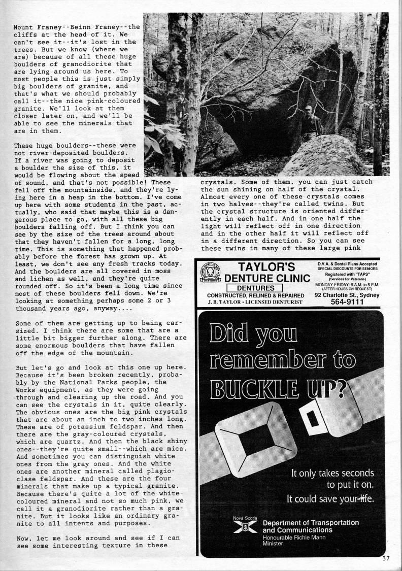 Published by Ronald Caplan on 1994/8/1 (241 reads)Mount Franey--Beinn Franey--the cliffs at the head of it. We can't see it--it's lost in the trees. But we know (where we are) because of all these huge boulders of granodiorite that are lying around us here. To most people this is just simply big boulders of granite, and that's what we should probably call it--the nice pink-coloured granite. We'll look at them closer later on, and we'll be able to see the minerals that are in them. These huge boulders--these were not river-deposited boulders. If a river was going to deposit a boulder the size of this, it would be flowing about the speed of sound, and that's not possible! These fell off the mountainside, and they're ly? ing here in a heap in the bottom. I've come up here with some students in the past, ac? tually, who said that maybe this is a dan? gerous place to go, with all these big boulders falling off. But I think you can see by the size of the trees around about that they haven't fallen for a long, long time. This is something that happened prob? ably before the forest has grown up. At least, we don't see any fresh tracks today. And the boulders are all covered in moss and lichen as well, and they're quite rounded off. So it's been a long time since most of these boulders fell down. We're looking at something perhaps some 2 or 3 thousand years ago, anjrway. . . . Some of them are getting up to being car- sized. I think there are some that are a little bit bigger further along. There are some enormous boulders that have fallen off the edge of the mountain. But let's go and look at this one up here. Because it's been broken recently, proba? bly by the National Parks people, the Works equipment, as they were going through and clearing up the road. And you can see the crystals in it, quite clearly. The obvious ones are the big pink crystals that are about an inch to two inches long. These are of potassium feldspar. And then there are the gray-coloured crystals, which are quartz. And then the black shiny ones--they're quite small--which are mica. And sometimes you can distinguish white ones from the gray ones. And the white ones are another mineral called plagio- clase feldspar. And these are the four minerals that make up a typical granite. Because there's quite a lot of the white- coloured mineral and not so much pink, we call it a granodiorite rather than a gra? nite. But it looks like an ordinary gra? nite to all intents and purposes. Now, let me look around and see if I can see some interesting texture in these crystals. Some of them, you can just catch the sun shining on half of the crystal. Almost every one of these crystals comes in two halves--they're called twins. But the crystal structure is oriented differ? ently in each half. And in one half the light will reflect off in one direction and in the other half it will reflect off in a different direction. So you can see these twins in many of these large pink TAYLOR'S ' DENTURE CLINIC I DENTURES ] CONSTRUCTED, RELINED & REPAIRED J. B. TAYLOR • LICENSED DENTURIST D.V.A. & Dental Plans Accepted SPECIAL DISCOUNTS FOR SENIORS Registered with "TAPS" (Services for Veterans) MONDAY-FRIDAY: 9 A.M. to 5 P.M. (AFTER HOURS ON REQUEST) 92 Charlotte St., Sydney 564-9111 It only takes seconds to put it on. It could save your-We. 'r',. Department of Transportation ''' and Communications