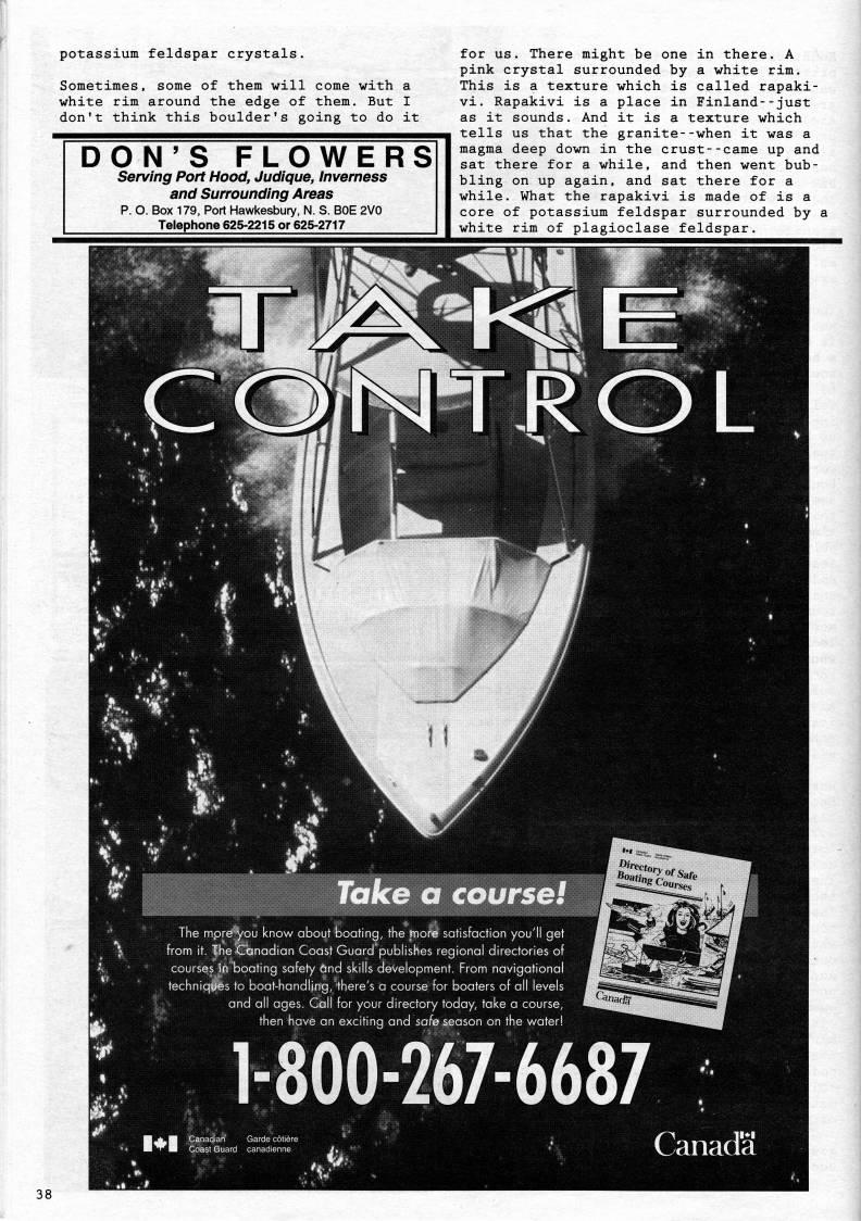 Published by Ronald Caplan on 1994/8/1 (250 reads)potassium feldspar crystals. Sometimes, some of them will come with a white rim around the edge of them. But I don't think this boulder's going to do it DON'S FLOWERS Serving Port Hood, Judique, Inverness and Surrounding Areas p. O. Box 179, Port Hawkesbury, N. 8. BOE 2V0 Telephone 625-2215 or 625-2717 for us. There might be one in there. A pink crystal surrounded by a white rim. This is a texture which is called rapaki- vi. Rapakivi is a place in Finland--just as it sounds. And it is a texture which tells us that the granite--when it was a magma deep down in the crust--came up and sat there for a while, and then went bub? bling on up again, and sat there for a while. What the rapakivi is made of is a core of potassium feldspar surrounded by a white rim of plagioclase feldspar.