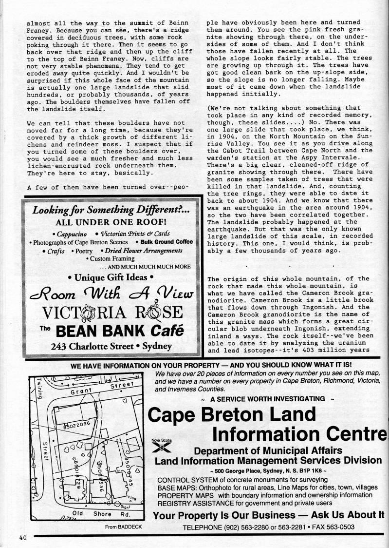 Published by Ronald Caplan on 1994/8/1 (232 reads)almost all the way to the summit of Beinn Franey. Because you can see, there's a ridge covered in deciduous trees, with some rock poking through it there. Then it seems to go back over that ridge and then up the cliff to the top of Beinn Franey. Now, cliffs are not very stable phenomena. They tend to get eroded away quite quickly. And I wouldn't be surprised if this whole face of the mountain is actually one large landslide that slid hundreds, or probably thousands, of years ago. The boulders themselves have fallen off the landslide itself. We can tell that these boulders have not moved far for a long time, because they're covered by a thick growth of different li? chens and reindeer moss. I suspect that if you turned some of these boulders over, you would see a much fresher and much less lichen-encrusted rock underneath them. They're here to stay, basically. A few of them have been turned over--peo- Lookingfor Something Different?... ALL UNDER ONE ROOF! • Cappucino • 1/ictorian (Prints df Cards • Photographs of Cape Breton Scenes • Bulk Ground Coffee • Crafts 'Poetry • Dried Flotver Arrangements • Custom Framing ... AND MUCH MUCH MUCH MORE • Unique Gift Ideas • VICTORIA R'SE "' BEAN BANK Cafe 243 Charlotte Street • Sydney pie have obviously been here and turned them around. You see the pink fresh gra? nite showing through there, on the under? sides of some of them. And I don't think those have fallen recently at all. The whole slope looks fairly stable. The trees are growing up through it. The trees have got good clean bark on the up-slope side, so the slope is no longer falling. Maybe most of it came down when the landslide happened initially. (We're not talking about something that took place in any kind of recorded memory, though, these slides....) No. There was one large slide that took place, we think, in 1904, on the North Mountain on the Sun? rise Valley. You see it as you drive along the Cabot Trail between Cape North and the warden's station at the Aspy Intervale. There's a big clear, cleaned-off ridge of granite showing through there. There have been some samples taken of trees that were killed in that landslide. And, counting the tree rings, they were able to date it back to about 1904. And we know that there was an earthquake in the area around 1904, so the two have been correlated together. The landslide probably happened at the earthquake. But that was the only known large landslide of this scale, in recorded history. This one, I would think, is prob? ably a few thousands of years ago. The origin of this whole mountain, of the rock that made this whole mountain, is what we have called the Cameron Brook gra? nodiorite. Cameron Brook is a little brook that flows down through Ingonish. And the Cameron Brook granodiorite is the name of this granite mass which forms a great cir? cular blob underneath Ingonish, extending inland a ways. The rock itself--we've been able to date it by analyzing the uranium and lead isotopes--it's 403 million years WE HAVE INFORMATION ON YOUR PROPERTY • AND YOU SHOULD KNOW WHAT IT IS! We have over 20 pieces of information on every number you see on this map, and we have a number on every property in Cape Breton, Richmond. Victoria, and invemess Counties. ~ A SERVICE WORTH INVESTIGATING ~ Cape Breton Land Information Central From BADDECK Department of Municipal Affairs Land Information Management Services Division ~ 500 George Place, Sydney, N. S. B1P 1K6 ~ CONTROL SYSTEM of concrete monuments for surveying BASE MAPS: Orthophoto for rural areas, Line Maps for cities, town, villages PROPERTY MAPS with boundary information and ownership information REGISTRY ASSISTANCE for government and private users Your Property Is Our Business • Ask Us About It TELEPHONE (902) 563-2280 or 563-2281 • FAX 563-0503