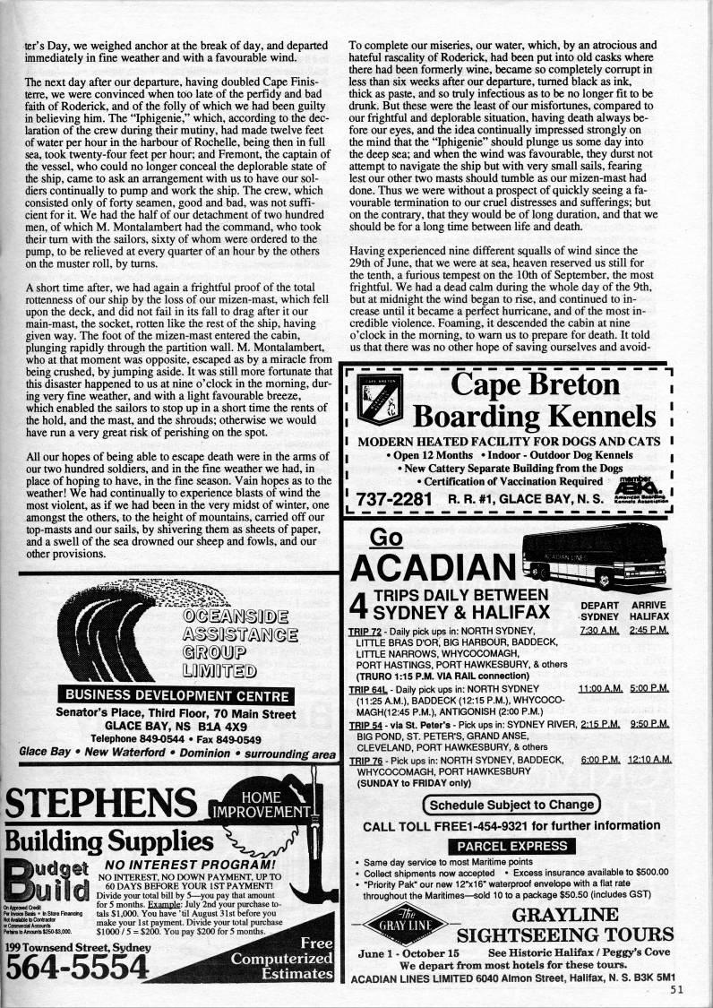 ter's Day, we weighed anchor at the break of day, and departed immediately in fine weather and with a favourable wind. The next day after our departure, having doubled Cape Finis- terre, we were convinced when too late of the perfidy and bad faith of Roderick, and of the folly of which we had been guilty in believing him. The "Iphigenie," which, according to the dec? laration of the crew during Sieir mutiny, had made twelve feet of water per hour in the harbour of Rochelle, being then in full sea, took twenty-four feet per hour; and Fremont, the captain of the vessel, who could no longer conceal the deplorable state of the ship, came to ask an arrangement with us to have our sol? diers continually to pump and work the ship. The crew, which consisted only of forty seamen, good and bad, was not suffi? cient for it. We had the half of our detachment of two hundred men, of which M. Montalambert had the command, who took their tum with the sailors, sixty of whom were ordered to the pump, to be relieved at every quarter of an hour by the others on the muster roll, by tums. A short time after, we had again a frightful proof of the total rottenness of our ship by the loss of our mizen-mast, which fell upon the deck, and did not fail in its fall to drag after it our main-mast, the socket, rotten like the rest of the ship, having given way. The foot of the mizen-mast entered the cabin, plunging rapidly through the partition wall. M. Montalambert, who at that moment was opposite, escaped as by a miracle from being cmshed, by jumping aside. It was still more fortunate that this disaster happened to us at nine o'clock in the moming, dur? ing very fine weather, and with a Ught favourable breeze, which enabled the sailors to stop up in a short time the rents of the hold, and the mast, and the shrouds; otherwise we would have mn a very great risk of perishing on the spot. All our hopes of being able to escape death were in the arms of our two hundred soldiers, and in the fine weather we had, in place of hoping to have, in the fine season. Vain hopes as to the weather! We had continually to experience blasts of wind the most violent, as if we had been in the very midst of winter, one amongst the others, to the height of mountains, carried off our top-masts and our sails, by shivering them as sheets of paper, and a swell of the sea drowned our sheep and fowls, and our other provisions. I5''?> BUSINESS DEVELOPMENT CENTRE Senator's Place, Third Floor, 70 Main Street GLACE BAY, NS BIA 4X9 Telephone 849'544 • Fax 849'549 Glace Bay • New Waterford • Dominion • surrounding area STEPHENS Building Supplies 01 udget uild P? Invoice Basis • In Store RnancJng NolAvalaUetoConlractw Polains to Amounts t2SO-$3,000. NO INTEREST PROGRAMl NO INTEREST, NO DOWN PAYMENT, UP TO 60 DAYS BEFORE YOUR 1ST PAYMENT! Divide your total bill by 5 • you pay that amount for 5 montiis. Example: July 2nd your purchase to? tals $1,000. You have 'til August 31st before you make your 1st payment. Divide your total purchase $1000 / 5 = $200. You pay $200 for 5 months. 199 Townsend Street, Sydney 564-5554. Free Computerized Estimates To complete our miseries, our water, which, by an atrocious and hateful rascality of Roderick, had been put into old casks where there had been formerly wine, became so completely cormpt in less than six weeks after our departure, tumed black as ink, thick as paste, and so truly infectious as to be no longer fit to be dmnk. But these were the least of our misfortunes, compared to our frightful and deplorable situation, having death always be? fore our eyes, and the idea continually impressed strongly on the mind diat the "Iphigenie" should plunge us some day into the deep sea; and when the wind was favourable, they durst not attempt to navigate the ship but with very small sails, fearing lest our other two masts should tumble as our mizen-mast had done. Thus we were without a prospect of quickly seeing a fa? vourable termination to our cmel distresses and sufferings; but on the contrary, that they would be of long duration, and that we should be for a long time between life and death. Having experienced nine different squalls of wind since the 29th of June, that we were at sea, heaven reserved us still for the tenth, a furious tempest on the 10th of September, the most frightful. We had a dead calm during the whole day of the 9th, but at midnight the wind began to rise, and continued to in? crease until it became a perfect hurricane, and of the most in? credible violence. Foaming, it descended the cabin at nine o'clock in the moming, to wam us to prepare for death. It told us that there was no other hope of saving ourselves and avoid- Cape Breton Boarding Kennels MODERN HEATED FACILITY FOR DOGS AND CATS • Open 12 Months • Indoor - Outdoor Dog Kennels • New Cattery Separate Building from the Dogs • Certification of Vaccination Required 737-2281 R. R. #1, GLACE BAY, N. S. Go ACADIAN 4 TRIPS DAILY BETWEEN SYDNEY & HALIFAX TRIP 72 - Daily pick ups in: NORTH SYDNEY, LITTLE BRAS D'OR. BIG HARBOUR, BADDECK, LITTLE NARROWS, WHYCOCOMAGH. PORT HASTINGS, PORT HAWKESBURY, & others (TRURO 1:15 P.M. VIA RAIL connection) TRIP 64L - Daily pick ups in: NORTH SYDNEY (11:25 A.M.), BADDECK (12:15 P.M.), WHYCOCO- MAGH(12:45 P.M.), ANTIGONISH (2:00 P.M.) TRIP 54 - via St. Peter's - Pick ups in: SYDNEY RIVER, 2:15 P.M. BIG POND, ST. PETER'S, GRAND ANSE, CLEVELAND, PORT HAWKESBURY, & others IEIPI6 - Pick ups in: NORTH SYDNEY, BADDECK, 6:00 P.M. 12:10 A.M. WHYCOCOMAGH, PORT HAWKESBURY (SUNDAY to FRIDAY only) DEPART ARRIVE SYDNEY HAUFAX 7:30 A.M. 2:45 P.M. 11:00 A.M. 5:00 P.M. 9:50 P.M. G [schedule Subject to Change) CALL TOLL FREE1-454-9321 for further information • Same day service to most Maritime points • Collect shipments now accepted • Excess insurance available to $500.00 • "Priority Pak" our new 12"x16" waterproof envelope with a flat rate throughoujt'the Maritimes • sold 10 to a package $50.50 (includ