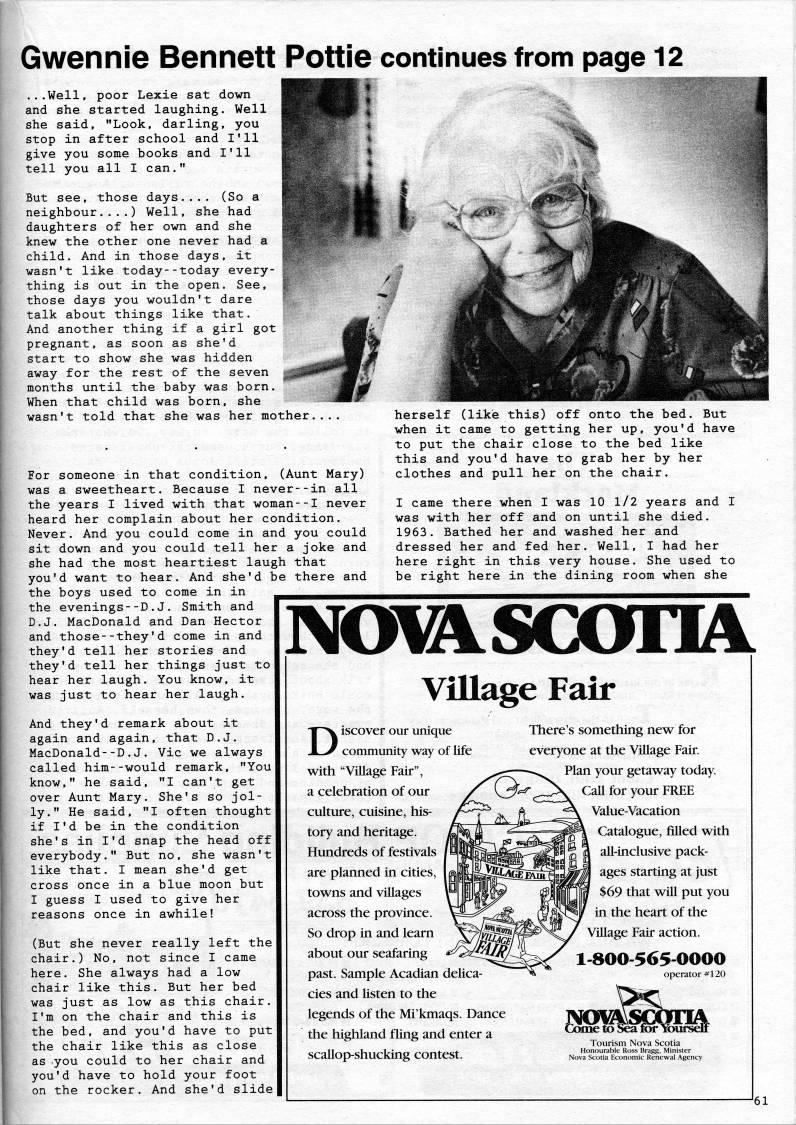 Gwennie Bennett Pottie continues from page 12 ...Well, poor Lexie sat down and she started laughing. Well she said, "Look, darling, you stop in after school and I'll give you some books and I'll tell you all I can." But see, those days.... (So a neighbour....) Well, she had daughters of her ovm and she knew the other one never had a child. And in those days, it wasn't like today--today every? thing is out in the open. See, those days you wouldn't dare talk about things like that. And another thing if a girl got pregnant, as soon as she'd start to show she was hidden away for the rest of the seven months until the baby was born. When that child was born, she wasn't told that she was her mother.. For someone in that condition, (Aunt Mary) was a sweetheart. Because I never--in all the years I lived with that woman--I never heard her complain about her condition. Never. And you could come in and you could sit down and you could tell her a joke and she had the most heartiest laugh that you'd want to hear. And she'd be there and the boys used to come in in the evenings--D.J. Smith and D.J. MacDonald and Dan Hector and those--they'd come in and they'd tell her stories and they'd tell her things just to hear her laugh. You know, it was just to hear her laugh. And they'd remark about it again and again, that D.J. MacDonald--D.J. Vic we always called him--would remark, "You know," he said, "I can't get over Aunt Mary. She's so jol? ly." He said, "I often thought if I'd be in the condition she's in I'd snap the head off everybody." But no, she wasn't like that. I mean she'd get cross once in a blue moon but I guess I used to give her reasons once in awhile! (But she never really left the chair.) No, not since I came here. She always had a low chair like this. But her bed was just as low as this chair. I'm on the chair and this is the bed, and you'd have to put the chair like this as close as you could to her chair and you'd have to hold your foot on the rocker. And she'd slide herself (like this) off onto the bed. But when it came to getting her up, you'd have to put the chair close to the bed like this and you'd have to grab her by her clothes and pull her on the chair. I came there when I was 10 1/2 years and I was with her off and on until she died. 1963. Bathed her and washed her and dressed her and fed her. Well, I had her here right in this very house. She used to be right here in the dining room when she NOI'SGOnA Village Fair Discover our unique community way of life with "Village Fair", a celebration of our culture, cuisine, his? tory and heritage. Hundreds of festivals are planned in cities, towns and villages across the province. So drop in and learn about our seafaring past. Sample Acadian delica? cies and listen to the legends of the Mi'kmaqs. Dance the highland fling and enter a scallop-shucking contest. There's something new for everyone at the Village Fair. Plan your getaway today. CaU for your FREE Value-Vacation Catalogue, filled with all-inclusive pack? ages starting at just $69 that will put you in the heart of the Village Fair action. 1-800-565-0000 operator #120 Tounsm Nova Scotia Honourable Ross Bragg, Minister Nova Scotia Economic Renewal Agency