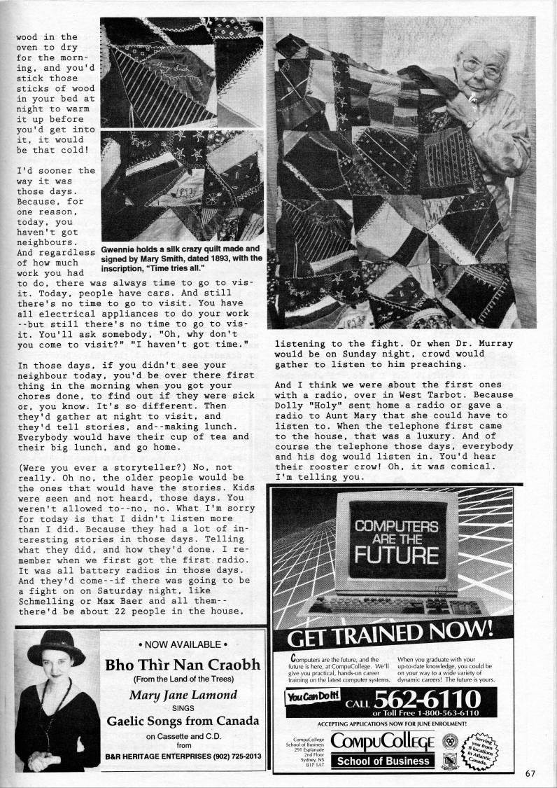 Published by Ronald Caplan on 1994/8/1 (131 reads)wood in the oven to dry for the morn? ing, and you'd ) stick those sticks of wood in your bed at night to warm it up before you'd get into it. it would be that cold! I'd sooner the way it was those days. Because, for one reason, today, you haven't got neighbours. And regardless Gwennie holds a silk crazy quilt made and of how much signed by Mary Smith, dated 1893, with the work you had !"s<'"Ptio". "Time tries all." to do, there was always time to go to vis? it. Today, people have cars. And still there's no time to go to visit. You have all electrical appliances to do your work --but still there's no time to go to vis? it. You'll ask somebody, "Oh. why don't you come to visit?" "I haven't got time." In those days, if you didn't see your neighbour today, you'd be over there first thing in the morning when you got your chores done, to find out if they were sick or, you know. It's so different. Then they'd gather at night to visit, and they'd tell stories, and--making lunch. Everybody would have their cup of tea and their big lunch, and go home. (Were you ever a storyteller?) No, not really. Oh no, the older people would be the ones that would have the stories. Kids were seen and not heard, those days. You weren't allowed to--no, no. What I'm sorry for today is that I didn't listen more than I did. Because they had a lot of in? teresting stories in those days. Telling what they did, and how they'd done. I re? member when we first got the first,radio. It was all battery radios in those days. And they'd come--if there was going to be a fight on on Saturday night, like Schmelling or Max Baer and all them-- there'd be about 22 people in the house. • NOW AVAILABLE • Bho Thir Nan Craobh (From the Land of the Trees) Mary Jane Lamond SINGS Gaelic Songs from Canada on Cassette and CD. from B&R; HERITAGE ENTERPRISES (902) 725-2013 listening to the fight. Or when Dr. Murray would be on Sunday night, crowd would gather to listen to him preaching. And I think we were about the first ones with a radio, over in West Tarbot. Because Dolly "Holy" sent home a radio or gave a radio to Aunt Mary that she could have to listen to. When the telephone first came to the house, that was a luxury. And of course the telephone those days, everybody and his dog would listen in. You'd hear their rooster crow! Oh, it was comical. I'm telling you. mypuTER ARE THEl FUTURl Oomputers are the future, and the When you graduate with your future is here, at CompuCollege. We'll up-to-date knowledge, you could be give you practical, hands-on career on your way to a wide variety of training on the latest computer systems, dynamic careers! The future is yours. 562-6110 ACCEPTING APPLICATrONS NOW FOR JUNE ENROLMENT! s CoMpuCollEqE i ??: