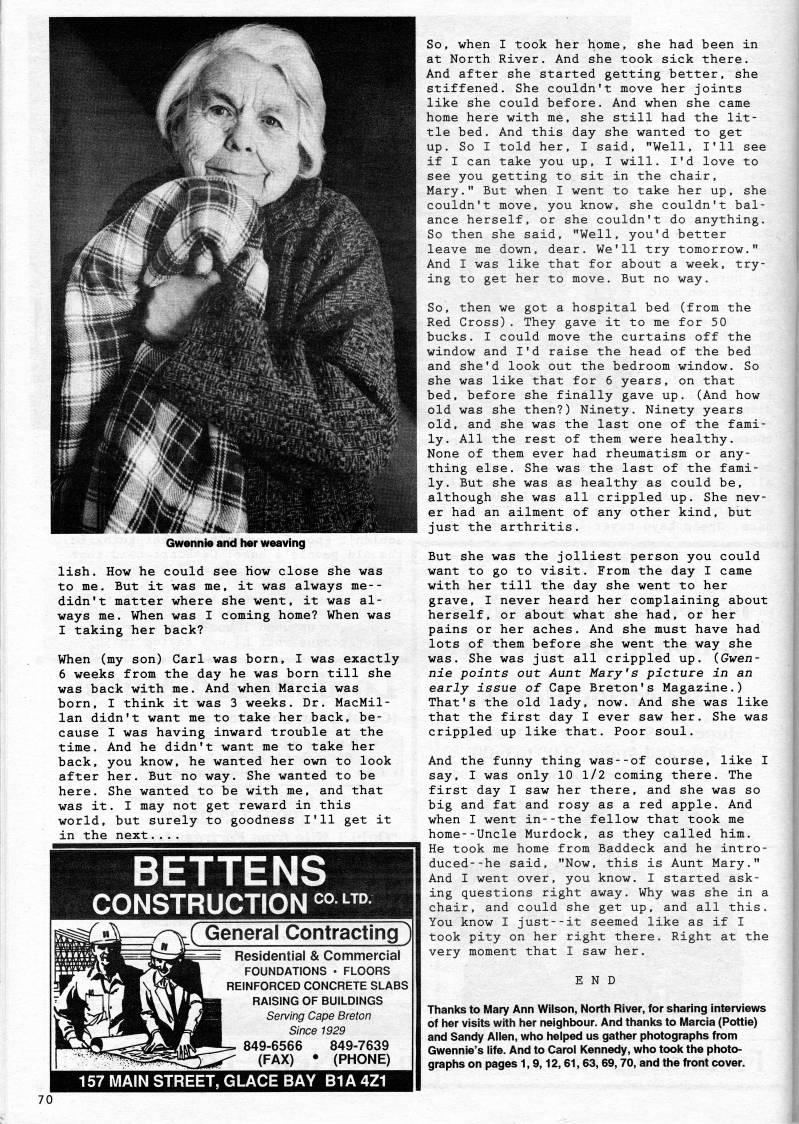 Published by Ronald Caplan on 1994/8/1 (134 reads)Gwennie and her weaving lish. How he could see how close she was to me. But it was me, it was always me-- didn't matter where she went, it was al? ways me. When was I coming home? When was I taking her back? When (my son) Carl was born, I was exactly 6 weeks from the day he was born till she was back with me. And when Marcia was born, I think it was 3 weeks. Dr. MacMil? lan didn't want me to take her back, be? cause I was having inward trouble at the time. And he didn't want me to take her back, you know, he wanted her own to look after her. But no way. She wanted to be here. She wanted to be with me, and that was it. I may not get reward in this world, but surely to goodness I'll get it in the next.... BETTENS CONSTRUCTION ?'''? ( General Contracting' ' Residential & Commercial FOUNDATIONS • FLOORS REINFORCED CONCRETE SLABS RAISING OF BUILDINGS Serving Cape Breton Since 1929 849-6566 849-7639 (FAX) • (PHONE) 157 MAIN STREET, GLACE BAY B1A4Z1 So, when I took her home, she had been in at North River. And she took sick there. And after she started getting better, she stiffened. She couldn't move her joints like she could before. And when she came home here with me, she still had the lit? tle bed. And this day she wanted to get up. So I told her, I said, "Well. I'll see if I can take you up, I will. I'd love to see you getting to sit in the chair, Mary." But when I went to take her up, she couldn't move, you know, she couldn't bal? ance herself, or she couldn't do anything. So then she said, "Well, you'd better leave me down, dear. We'll try tomorrow." And I was like that for about a week, try? ing to get her to move. But no way. So, then we got a hospital bed (from the Red Cross). They gave it to me for 50 bucks. I could move the curtains off the window and I'd raise the head of the bed and she'd look out the bedroom window. So she was like that for 6 years, on that bed, before she finally gave up. (And how old was she then?) Ninety. Ninety years old, and she was the last one of the fami? ly. All the rest of them were healthy. None of them ever had rheumatism or any? thing else. She was the last of the fami? ly. But she was as healthy as could be, although she was all crippled up. She nev? er had an ailment of any other kind, but just the arthritis. But she was the jolliest person you could want to go to visit. From the day I came with her till the day she went to her grave, I never heard her complaining about herself, or about what she had, or her pains or her aches. And she must have had lots of them before she went the way she was. She was just all crippled up. (Gwen? nie points out Aunt Mary's picture in an early issue of Cape Breton's Magazine.) That's the old lady, now. And she was like that the first day I ever saw her. She was crippled up like that. Poor soul. And the funny thing was--of course, like I say, I was only 10 1/2 coming there. The first day I saw her there, and she was so big and fat and rosy as a red apple. And when I went in--the fellow that took me home--Uncle Murdock, as they called him. He took me home from Baddeck and he intro? duced- -he said, "Now, this is Aunt Mary." And I went over, you know. I started ask? ing questions right away. Why was she in a chair, and could she get up, and all this. You know I just--it seemed like as if I took pity on her right there. Right at the very moment that I saw her. END Thanl(s to Mary Ann Wilson, North River, for sharing interviews of her visits with her neighbour. And thanl(s to Marcia (Pottie) and Sandy Allen, who helped us gather photographs from Gwennie's life. And to Carol Kennedy, who toolc the photo? graphs on pages 1,9,12,61,63,69,70, and the front cover.