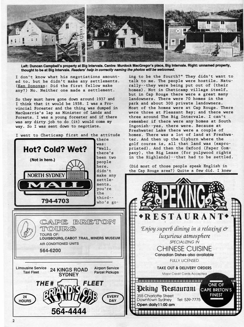 Left: Duncan Campbell's property at Big Intervale. Centre: Murdock MacGregor's place, Big intervale. Right: unnamed property, thought to be at Big Intervale. Readers' help in correctly naming the photos will be welcomed. 1 don't know what his negotiations amount? ed to, but he didn't make any settlements. (Ken Donovan: Did the first fellow make any?) No. Neither one made a settlement. So they must have gone down around 1937 and I think that it would be 1938. I was a Pro? vincial Forester and the thing was dumped in MacQuarrie's lap as Minister of Lands and Forests. I was a young forester and if there was any dirty job to do (it) would come my way. So I was sent down to negotiate. Hot? Cold? Wet?