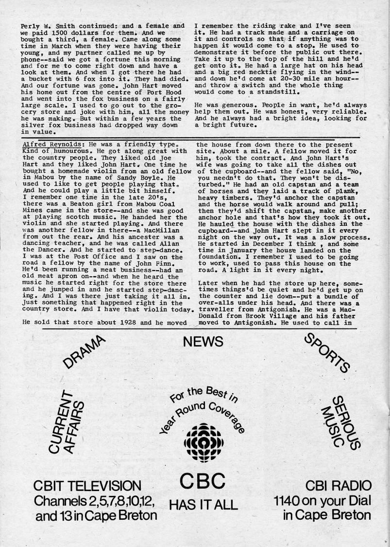 Published by Ronald Caplan on 1976/12/1 (401 reads)Perly W. Smith continued: and a female and we paid 1500 dollars for them. And we bought a third, a female. Came along some time in March when they were having their young, and my partner called me up by phone • said we got a fortune this morning and for me to come right down and have a look at them. And when I got there he had a bucket with 6 fox into it. They had died. And our fortune was gone. John Hart moved his home out from the centre of Port Hood and went into the fox business on a fairly large scale. I used to go out to the gro? cery store and joke with him, all the money he was making. But within a few years the silver fox business had dropped way down in value. I remember the riding rake and I've seen it. He had a track made and a carriage on it and controls so that if anything was to happen it would come to a stop. He used to demonstrate it before the public out there. Take it up to the top of the hill and he'd get onto ito He had a large hat on his head and a big red necktie flying in the wind • and down he'd come at 20-30 mile an hour • and throw a switch and the whole thing would come to a standstill. He was generous. People in want, he'd always help them out. He was honest, very reliable. And he always had a bright idea, looking for a bright future. Alfred Reynolds: He was a friendly typCo Kind of humourous. He got along great with the country people. They liked old Joe Hart and they liked John Hart* One time he bought a homemade violin from an old fellow in Mabou by the name of Sandy Boyle. He used to like to get people playing that*. And he could play a little bit himself. I remember one time in the late 20's, there was a Beaton girl from Mabou Coal Mines came in the store • and she was good at playing scotch music. He handed her the violin and she started playing. And there was another fellow in there • a MacMillan from out the rear. And his ancester was a dancing teacher, and he was called Allan the Dancer. And he started to step-dance. I was at the Post Office and I saw on the road a fellow by the name of John Finn. He'd been running a meat business • had an old meat apron on • and when he heard the music he started right for the store there and he jumped in and he started step-danc? ing. And I was there just taking it all in. Just something that happened right in the country store. And I have that violin today. He sold that store about 1928 and he moved the house from down there to the present site. About a mile. A fellow moved it for him, took the contract. And John Hart's wife was going to take all the dishes out of the cupboard • and the fellow said, "No, you needn't do that. They won't be dis? turbed." He had an old capstan and a team of horses and they laid a track of plank, heavy timbers. They'd anchor the capstan and the horse would walk around and pull; then they'd shift the capstan, make another anchor hole and that's how they took it out. He hauled the house with the dishes in the cupboard • and John Hart slept in it every night on the way out. It was a slow process. He started in December I think , and iso'me time in January the house landed on the foundation. I remember I used to be going to work, used to pass this house on the road. A light in it every night. Later when he had the store up here, some? times things'd be quiet and he'd get up on the counter and lie down • put a bundle of over-alls under his head. And there was a traveller from Antigonish. He was a Mac? Donald from Brook Village and his father moved to Antigonish. He used to call in .<''' .# NEWS '> VCi Q % ' V?? CBITTELEVISION Channels 2,5,7,8,10,12, and 13 in Cape Breton CBC HAS IT ALL CBI RADIO 1140on your Dial in Cape Breton