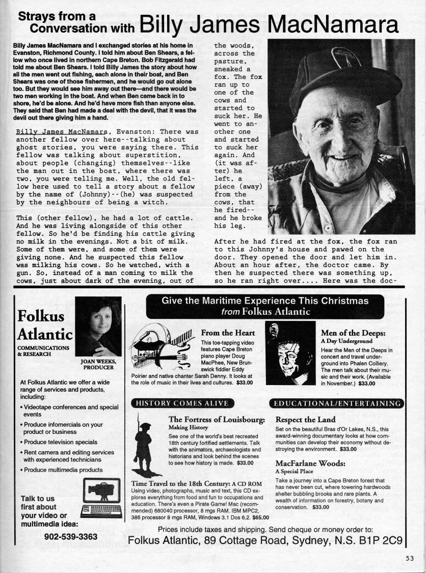 strays from a Conversation with Billy JaiTies MacNaiTiara Billy James MacNamara and I exchanged stories at his home in Evanston, Richmond County. I told him about Ben Shears, a fel? low who once lived in northern Cape Breton. Bob Fitzgerald had told me about Ben Shears. I told Billy James the story about how all the men went out fishing, each alone in their boat, and Ben Shears was one of those fishermen, and he would go out alone too. But they would see him away out there • and there would be two men working In the boat. And when Ben came back in to shore, he'd be alone. And he'd have more fish than anyone else. They said that Ben had made a deal with the devil, that it was the devil out there giving him a hand. Billv James MacNamara. Evanston: There was another fellow over here--talking about ghost stories, you were saying there. This fellow was talking about superstition, about people (changing) themselves--like the man out in the boat, where there was two, you were telling me. Well, the old fel? low here used to tell a story about a fellow by the name of (Johnny)--(he) was suspected by the neighbours of being a witch. This (other fellow), he had a lot of cattle. And he was living alongside of this other fellow. So he'd be finding his cattle giving no milk in the evenings. Not a bit of milk. Some of them were, and some of them were giving none. And he suspected this fellow was milking his cows. So he watched, with a gun. So, instead of a man coming to milk the cows, just about dark of the evening, out of the woods, across the pasture, sneaked a fox. The fox ran up to one of the cows and started to suck her. He went to an? other one and started to suck her again. And (it was af? ter) he left, a piece (away) from the cows, that he fired-- and he broke his leg. After he had fired at the fox, the fox ran to this Johnny's house and pawed on the door. They opened the door and let him in. About an hour after, the doctor came. By then he suspected there was something up, so he ran right over.... Here was the doc- Folkus Atlantic COMMUNICATIONS & RESEARCH JOAN WEEKS, PRODUCER At Folkus Atlantic we offer a wide range of services and products, including: • Videotape conferences and special events • Produce infomercials on your product or business • Produce television specials • Rent camera and editing sen/ices with experienced technicians • Produce multimedia products Talk to us first about your video or multimedia idea: ? Give the Maritime Experience This Christmas from Folkus Atlantic From the Heart This toe-tapping video features Cape Breton piano player Doug MacPhee, New Brun? swick fiddler Eddy Poirier and native chanter Sarah Denny. It looks at the role of music in their lives and cultures. $33.00 HISTORY COMES ALIVE Men of the Deeps: A Day Underground Hear the Men of the Deeps in concert and travel under? ground into Phalen Colliery. The men talk about their mu? sic and their work. (Available in November.) $33.00 EDUCATIONAL/ENTERTAINING The Fortress of Louishourg: Making History See one of the world's best recreated 18th century fortified settlements. Talk with the animators, archaeologists and historians and look behind the scenes to see how history is made. $33.00 Time Travel to the ISth Century: A CD ROM Using video, photographs, music and text, this CD ex? plores everything from food and fun to occupations and education. There's even a Pirate Game! Mac (recom? mended) 680040 processor, 8 mgs RAM. IBM MPC2, 386 processor 8 mgs RAM, Windows 3.1 Dos 6.2. $65.00 Respect the Land Set on the beautiful Bras d'Or Lakes, N.S., this award-winning documentary looks at how com? munities can develop their economy without de? stroying the environment. $33.00 MacFarlane Woods: A Special Place Take a journey into a Cape Breton forest that has never been cut, where towering hardwoods shelter bubbling brooks and rare plants. A wealth of information on forestry, botany and conservation. $33.00 902-539-3363 Prices include taxes and shipping. Send cheque or money order to: Folkus Atlantic, 89 Cottage Road, Sydney, N.S. B1P 2C9