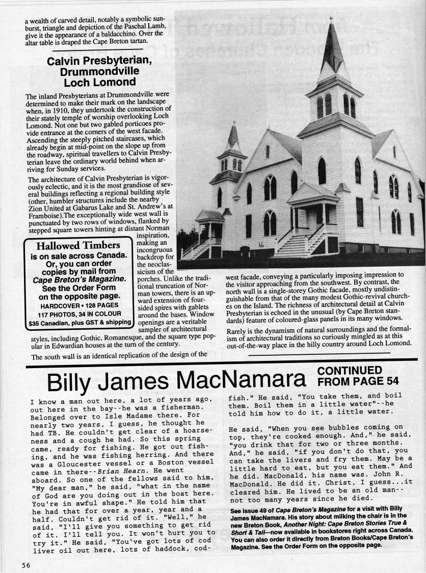 Published by Ronald Caplan on 1995/8/1 (339 reads)a wealth of carved detail, notably a symbolic sun? burst, triangle and depiction of the Paschal Lamb, give it the appearance of a baldacchino. Over the altar table is draped the Cape Breton tartan. Calvin Presbyterian, Drummondville Loch Lomond The inland Presbyterians at Drummondville were determined to make their mark on the landscape when, in 1910, they undertook the construction of their stately temple of worship overlooking Loch Lomond. Not one but two gabled porticoes pro? vide entrance at the comers of the west facade. Ascending the steeply pitched staircases, which already begin at mid-point on the slope up from the roadway, spiritual travellers to Calvin Presby? terian leave the ordinary world behind when ar? riving for Sunday services. The architecture of Calvin Presbyterian is vigor? ously eclectic, and it is the most grandiose of sev? eral buildings reflecting a regional building style (other, humbler structures include the nearby Zion United at Gabarus Lake and St. Andrew's at Framboise).The exceptionally wide west wall is punctuated by two rows of windows, flanked by stepped square towers hinting at distant Norman inspiration. making an incongruous backdrop for the neoclas- sicism of the porches. Unlike the tradi? tional truncation of Nor? man towers, there is an up? ward extension of four- sided spires with gablets around the bases. Window openings are a veritable sampler of architectural styles, including Gothic, Romanesque, and the square type pop? ular in Edwardian houses at the tum of the century. The south wall is an identical replication of the design of the Hallowed Timbers is on sale across Canada. Or, you can order copies by mail from Cape Breton's Magazine. See the Order Form on the opposite page. HARDCOVER • 128 PAGES 117 PHOTOS, 34 IN COLOUR $35 Canadian, plus GST & shipping west facade, conveying a particularly imposing impression to the visitor approaching from the southwest. By contrast, the north wall is a single-storey Gothic facade, mostly undistin- guishable from that of the many modest Gothic-revival church? es on the Island. The richness of architectural detail at Calvin Presbyterian is echoed in the unusual (by Cape Breton stan? dards) feature of coloured-glass panels in its many windows. Rarely is the dynamism of natural surroundings and the formal? ism of architectural traditions so curiously mingled as at this out-of-the-way place in the hilly country around Loch Lomond. Billy James MacNamara ''SS'pXI'es* I know a man out here, a lot of years ago, out here in the bay--he was a fisherman. Belonged over to Isle Madame there. For nearly two years, I guess, he thought he had TB. He couldn't get clear of a hoarse? ness and a cough he had. So this spring came, ready for fishing. He got out fish? ing, and he was fishing herring. And there was a Gloucester vessel or a Boston vessel came in there--Brian Hearn. He went aboard. So one of the fellows said to him, "My dear man," he said, "what in the name of God are you doing out in the boat here. You're in awful shape." He told him that he had that for over a year, year and a half. Couldn't get rid of it. "Well," he said, "I'll give you something to get rid of it. I'll tell you. It won't hurt you to try it." He said, "You've got lots of cod liver oil out here, lots of haddock, cod? fish." He said, "You take them, and boil them. Boil them in a little water"--he told him how to do it, a little water. He said, "When you see bubbles coming on top, they're cooked enough. And," he said, "you drink that for two or three months. And," he said, "if you don't do that, you can take the livers and fry them. May be a little hard to eat, but you eat them." And he did. MacDonald, his name was. John R. MacDonald. He did it. Christ, I guess...it cleared him. He lived to be an old man-- not too many years since he died. See Issue 49 of Cape Breton's Magazine for a visit with Billy James MacNamara. His story about milking the chair is in the new Breton Book, Another Night: Cape Breton Stories True & Short & Tall • now available in bookstores right across Canada. You can also order it directly from Breton Books/Cape Breton's Magazine. See the Order Form on the opposite page. 56