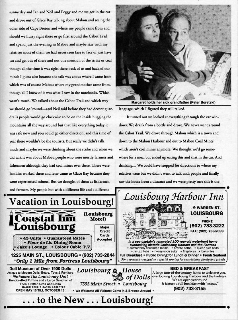 sunny day and Ian and NeU and Pe'y and me we got in the car and drove out of Glace Bay talking about Mabou and seeing the other side of Cape Breton and where my people came from and should we hurry right there or go first around the Cabot Trail and spend just the evening in Mabou and maybe stay with my relatives most of them we had never seen face to face or just have tea and 't out of there and not one mention of the strike or coal though all the time it was right there back of us and back of our minds I guess also because the talk was about where I came from which was of course Mabou where my grandmother came from, though all I knew of it was what I saw in the notebooks. Which wasn't much. We talked about the Cabot Trail and which way we should go 'round • and Neil said before they had decent guar? drails people would go clockwise to be on the inside buying the mountains all the way around but that like everything today it was safe now and you could go either direction, and this time of year there wouldn't be the tourists. But really we didn't talk much and maybe we were thinking about the strike and when we did talk it was about Mabou people who were mosdy farmers and fishermen although they had coal mines over there. There were families worked there and later came to Glace Bay because they were experienced miners. But we thought of them as fishermen and farmers. My people but with a different life and a different Vacation in Louisbourg! I Coastal inn 'Louisbourg (Louisbourg Motel) ? 45 Units • Guaranteed Rates • Fleur-de-lis Dining Room • Jake's Loimge • Colour Cable T.V. Major Credit Cards Accepted Margaret holds her sick grandfather (Peter Boretsici) language, which I figured they still talked. It turned out we looked at everything through the car win? dows. We drank from a botde and drove. We never went around the Cabot Trail. We drove through Mabou which is a town and down to the Mabou Harbour and out to Mabou Coal Mines which aren't coal mines anymore. We thought we'd go some? where for a meal but ended up eating this and that in the car. And drinking.... We could have stopped for directions to where my relatives were but we didn't want to talk with people and finally saw the house from a distance and we were pretty sure this is the 1225 MAIN ST., LOUISBOURG • (902) 733-2844 **Only 1 Mile from Fortress Louisbourg Louis Sourg '{arbour Inn 9 WARREN ST. LOUISBOURG PHONE (902) 733-3222 FAX: (902) 733-2699 In a sea captain's renovated lOO-year-old waterfront home overlooking historic Louisbourg Harbour and the Fortress • comfortably decorated rooms • private baths • queen-size beds • Jacuzzi tubs • honeymoon suite • fireplaces • balconies Full Break't • Public Dining for Lunch & Dinner • Fresh Seafood 'or a romantic weekend or a spedat evening for enUrtaining fcmdCy and friends Doll Museum of Over 1900 Dolls Antique to Modern Dolls, Bears, Toys & Furniture * We Feature The Louisbourg Doll * Handcrafted Puffins and a Large Selection of Local Crafted Gifts and Dolls MAJOR CREDIT CARDS ACCEPTED OPEN MAY 15 TILL OCTOBER 15 .We Welcome All Visitors: Come in & Browse Around • Louishourg j'House '''' of Dolls 7555 Main Street • Louisbourg BED & BREAKFAST A large tum-of-the-century home to welcome you, overlooking Lx)uisbourg Harbour and the Fortress. We are open year round & feature a full breakfast with "extras." (902)733-3155 ... to the New... Louisbourg!