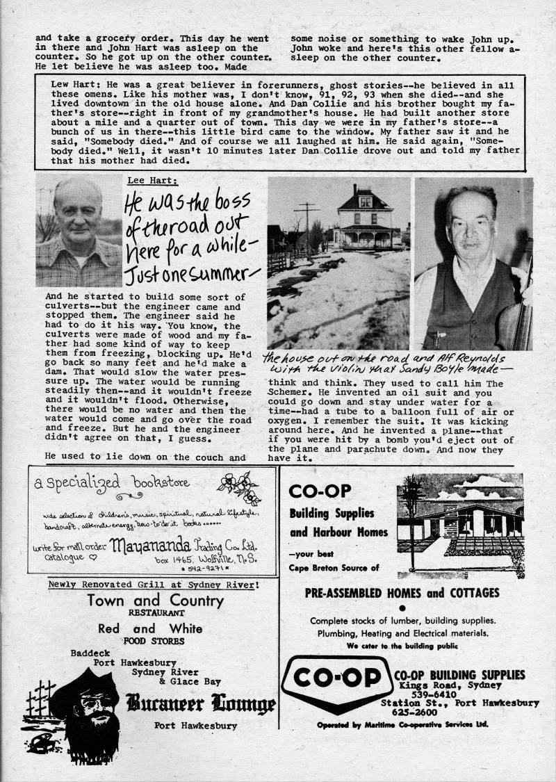 Published by Ronald Caplan on 1976/12/1 (380 reads)and take a grocery order. This day he went in there and John Hart was asleep on the counter. So he got up on the other counter. He let believe he was asleep too. Made some noise or something to wake John up. John woke and here's this other fellow a- sleep on the other counter. Lew Hart: He was a great believer in forerunners, ghost stories • he believed in all these omens. Like his mother was, I don't know, 91, 92, 93 when she died • and she lived downtown in the old house alone. And Dan Collie and his brother bought my fa? ther's store • right in front of my grandmother's house. He had built another store about a mile and a quarter out of town. This day we were in my father's store • a bunch of us in there • this little bird came to the window. My father saw it and he said, "Somebody died." And of course we all laughed at him. He said again, "Some? body died." Well, it wasn't 10 minutes later Dan Collie drove out and told my father that his mother had died. Lee Hart; And he started to build some sort of culverts • but the engineer came and stopped them. The engineer said he had to do it his way. "You know, the culverts were made of wood and my fa? ther had some kind of way to keep them from freezing, blocking up. He'd go back so many feet and he'd make a dam. That would slow the water pres? sure up. The water would be running steadily then--and it wouldn't freeze and it wouldn't flood. Otherwise, there would be no water and then the water would come and go over the road and freeze. But he and the engineer didn't agree on that, I guess. He used to lie down on the couch and M '/M ''' i/z'o/'iAJ 'a.}' Sa'd<' /3oY/e y'H'i'e • think and think. They used to call him The Schemer. He invented an oil suit and you could go down and stay under water for a time • had a tube to a balloon full of air or oxygen. I remember the suit. It was kicking around here. And he invented a plane • that if you were hit by a bomb you'd eject out of the plane and parachute down. And now they have it. Newly Renovated Grill at Sydney RiverI Town and Country RESTAURANT Red dnd White FOOD STORES Baddeck Port Hawkesbury Sydney River & Glace Bay Port Hawkesbury CO-OP Building Supplies and Harbour Homes • your bast Cape Breton Source of PRE-ASSEMBLED HOMES and COHAGES • Complete stocks of lumber, building supplies. Plumbing, Heating and Electcical materials. W? c??t?r to th? building public 'Cn.'DXCO-OP BUILDING SUPPIIES '' '' '' ' 1 Kings Road, Sydney ' 539-6410 Station St*, Fort HsMkesbary 625-2600 OpMrafad by JMarMm* Co opwaHv SwvkM INL