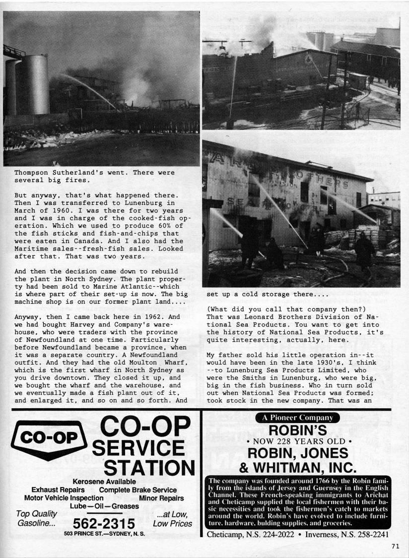 Published by Ronald Caplan on 1995/8/1 (236 reads)Thompson Sutherland's went. There were several big fires. But anyway, that's what happened there. Then I was transferred to Lunenburg in March of 1960. I was there for two years and I was in charge of the cooked-fish op? eration. Which we used to produce 60% of the fish sticks and fish-and-chips that were eaten in Canada. And I also had the Maritime sales--fresh-fish sales. Looked after that. That was two years. And then the decision came down to rebuild the plant in North Sydney. The plant proper? ty had been sold to Marine Atlantic--which is where part of their set-up is now. The big machine shop is on our former plant land.... Anyway, then I came back here in 1962. And we had bought Harvey and Company's ware? house, who were traders with the province of Newfoundland at one time. Particularly before Newfoundland became a province, when it was a separate country. A Newfoundland outfit. And they had the old Moulton Wharf, which is the first wharf in North Sydney as you drive downtown. They closed it up, and we bought the wharf and the warehouse, and we eventually made a fish plant out of it, and enlarged it, and so on and so forth. And set up a cold storage there.... (What did you call that company then?) That was Leonard Brothers Division of Na? tional Sea Products. You want to get into the history of National Sea Products, it's quite interesting, actually, here. My father sold his little operation in--it would have been in the late 1930's, I think --to Lunenburg Sea Products Limited, who were the Smiths in Lunenburg, who were big, big in the fish business. Who in turn sold out when National Sea Products was formed; took stock in the new company. That was an CO-OP SERVICE STATION Kerosene Available Exhaust Repairs Complete Brake Service Motor Vehicle Inspection Minor Repairs Lube • Oil • Greases Top Quality ...at Low, Gasoline... 562-2315 Low Prices 503 PRINCE ST. • SYDNEY, N. S. A Pioneer Company ROBIN'S • NOW 228 YEARS OLD • ROBIN, JONES & WHITMAN, INC. The company was founded around 1766 by the Robin fami ly from the islands of Jersey and Guernsey in the English Channel. These French-speaking immigrants to Arichat and Cheticamp supplied the local fishermen with their ba? sic necessities and took the fishermen's catch to markets around the world. Robin's have evolved to include furni? ture, hardware, bulding supplies, and groceries. Cheticamp, N.S. 224-2022 • Invemess, N.S. 258-2241