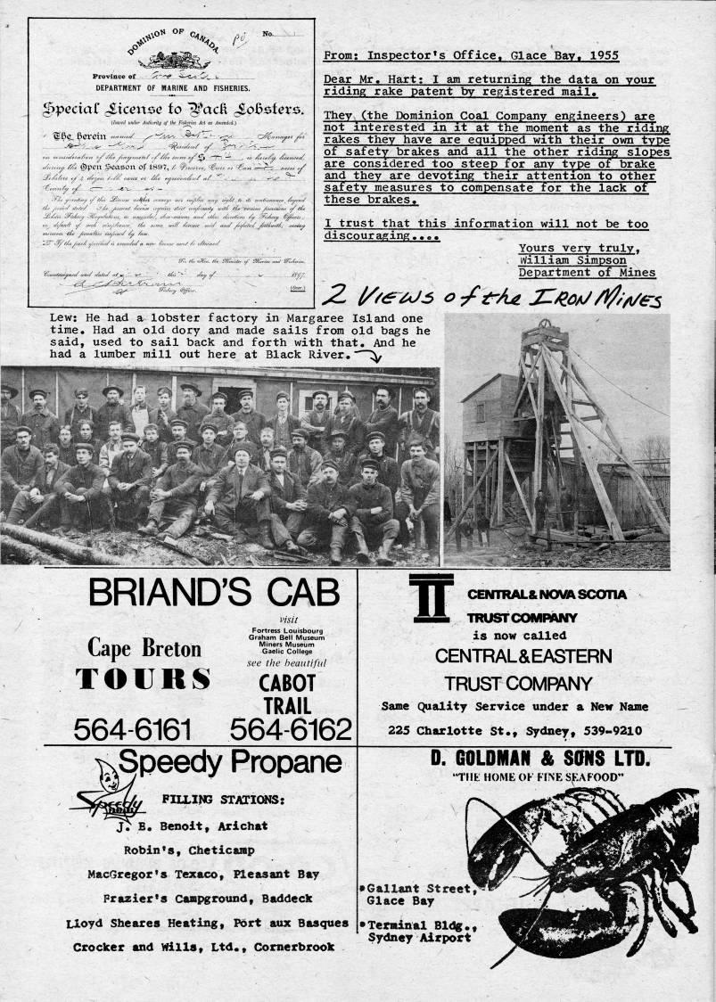 Published by Ronald Caplan on 1976/12/1 (455 reads)Province of, ' -Oif >ir-c-5.:.i!!> • ..i, DEPARTMENT OF MARINE AND FISHERIES. No.. 'pectaf 'icem'e to ''ac' S'ob'tex'. ' ff?' herein .-' ''' _ / (V)pcu',>.a .uo' i-r .-. J/,/../,uU,'.u • .,/,>.ue../e./a ,, ' r , 7t , % . ,/ _." ,,',v'' -; "-/ 9Rr., • • W PT,/-,,,,. - From; Inspector's Office, Glace Bay. 1955 Dear Mr. Hart; I am returning the data on your riding rake patent by registered mail. They (the Dominion Coal Company engineers) are not interested m it at the moment as the riding rakes they have are equipped with their own type of safety brakes and all the other riding slopes are considered too steep for any type of brake and they are devoting their attention to other safety measures to compensate for the lack of these brakes. I trust that this information will not be too discouraging.... Yours very truly. tVilliam Simpson Department of Mines Z V'e''s o -/t'Ajg. 2Z/i.o/J/l'/fi/ez Lew; He had a lobster factory in Margaree Island one time. Had an old dory and made sails from old bags he said, used to sail back and forth with that. And he had a lumber mill out here at Black River. BRIAND'S CAB Cape Breton TOURS Fortress Louisbourg Graham Bell Museum Miners Museum Gaelic College see the beautiful CABOT TRAIL 564-6161 564-6162 Speedy Propane FILLING STATIONS: J' B. Benoit, Arichat Robin's, Cheticanp MacGregor's Texaco, Pleasant Bay Prazier's Campgroiind, Baddeck Lloyd Sheares Heating, Port aux Basques Crocker and Wills, Ltd., Comerbrook nj'r CEIMTRAL& NOVA SCOTIA JUi TRUStCOMRANY is now called CENTRAL&EASTERN; TRUST COMR'NY Same Quality Service under a New Name 225 Charlotte St., Sydney, 539-9210 0. GOLDMAN & SONS LTD. "Tilt HOME OK FINE SEAFOOD" ??Gallant Street Glace Bay • Terninal Bldg*, Sydney Airport