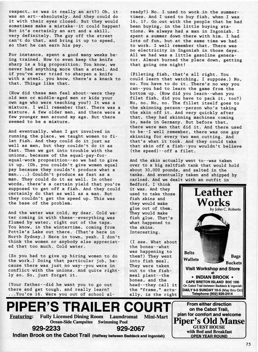 Published by Ronald Caplan on 1995/8/1 (203 reads)respect, or was it really an art?) Oh, it was an art--absolutely. And they could do it with their eyes closed. But they would sometimes make a mistake--it could happen! But it's certainly an art and a skill, very definitely. The guy off the street can't do that, and bring it up to speed, so that he can earn his pay. For instance, spent a good many weeks be? ing trained. How to even keep the knife sharp is a big proposition. You know, we never had anything more than a steel. And if you've ever tried to sharpen a knife with a steel, you know, there's a knack to that. Things like that. (How did these men feel about--were they old men or middle-aged men or kids your own age who were teaching you?) It was a mixture. I well remember that. There was a mixture. A few older men, and there were a few younger men around my age. But there seemed to be a mixture. And eventually, when I got involved in running the place, we taught women to fi? let fish. And they could do it just as well as men, but they couldn't do it as fast. Then we got into trouble with the unions, because of the equal-pay-for- equal-work proposition--so we had to give it up. (Oh, you couldn't give women equal pay because they couldn't produce what a man....) Couldn't produce as fast as a man. They could do it as well. In other words, there's a certain yield that you're supposed to get off a fish. And they could certainly do that as well as a man. But they couldn't get the speed up. This was the base of the problem. And the water was cold, my dear. Cold wa? ter coming in with these--everything was flumed by water, right out of the taps. You know, in the wintertime, coming from Pottle's Lake out there. (That's here in North Sydney.) Here in town, yeah. I don't think the women or anybody else appreciat? ed that too much. Cold water. (So you had to give up hiring women to do the work.) Doing that particular job, be? cause there was just no way-ryou were in conflict with the unions. And quite right? ly so. So, just forget it. (Your father--did he want you to go out there and get tough, and really learn? ...You're 16. Were you out of school al? ready?) No. I used to work in the summer? times. And I used to buy fish, when I was 16, 17. Go out with the people that he had been buying, in the little buying sta? tions. We always had a man in Ingonish. I spent a summer down there with him. I had lots of fun, but at the same time we had to work. I well remember that. There was no electricity in Ingonish in those days. All we had was a little gasoline genera? tor. Almost burned the place down, getting that going one night! (Fileting fish, that's all right. You could learn that watching, I suppose.) No, no. You have to do it. There's no way you can--you had to learn the game from the bottom up. (How did you learn--when you filet fish, did you have to pack it, too?) No, no. No, no. The fillet itself goes to the skinning person--person who's taking the skin off it. And very quickly after that, they had skinning machines coming in, made in Germany. But before that, there were men that did it. And there used to be--I well remember, there was one guy skinning for every two men cutting. And that's what it took. And they could take that skin off a fish--you wouldn't believe (the speed)--off a filet. And the skin actually went to--was taken over to a big saltfish tank that would hold about 30,000 pounds, and salted in the tanks. And eventually taken and shipped by carload. And we dealt with an outfit in Bedford, I think it was. And they used to take those fish skins and they would make glue out of them. They would make fish glue. That's what happened to the skins. Interesting. (I see. What about the bones--what was happening to them?) They went into fish meal. They were taken out to the fish- meal plant--the bones, and the head--they call it the "frame," actu? ally, is the right Leather Works by John C. Roberts Buckets Visit Workshop and Store at • INDIAN BROOK • CAPE BRETON ISLAND BOC IHO On Cabot Trail between Baddeck & Ingonish DAILY 9-5 SUNDAY 10-5 (May thru Oct] Telephone (902) 929-2414 PIPER'S TRAILER COURT Featuring: Fully Licensed Dining Room Laundromat Mini-Mart Ocean-Side Campsites Swimming Pool 929-2233 929-2067 Indian Brook on the Cabot Trail (Halfway between Baddeck and ingonish) From either direction on the Cabot Trail, plan for comfort and welcome Piper's Old Manse GUESTHOUSE with Bed and Breakfast , OPEN YEAR ROUND ,