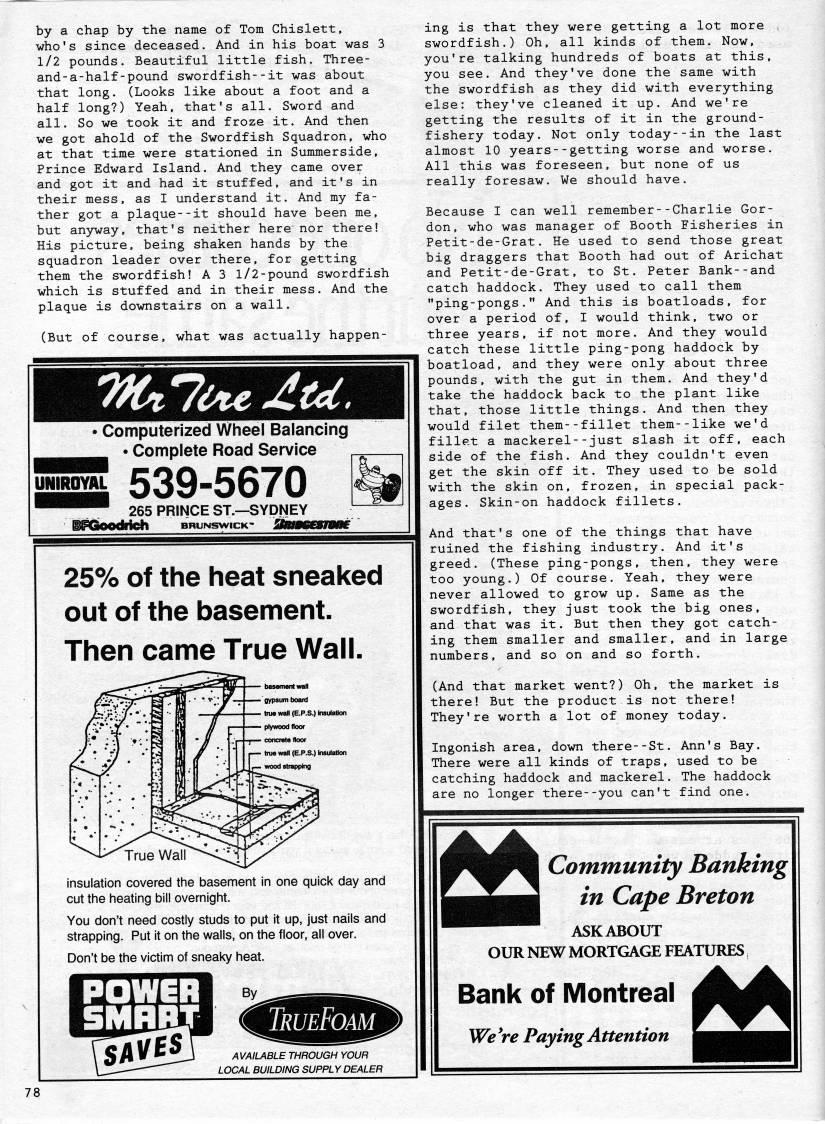 Published by Ronald Caplan on 1995/8/1 (176 reads)by a chap by the name of Tom Chislett, who's since deceased. And in his boat was 3 1/2 pounds. Beautiful little fish. Three- and-a-half -pound swordfish--it was about that long. (Looks like about a foot and a half long?) Yeah, that's all. Sword and all. So we took it and froze it. And then we got ahold of the Swordfish Squadron, who at that time were stationed in Summerside, Prince Edward Island. And they came over and got it and had it stuffed, and it's in their mess, as I understand it. And my fa? ther got a plaque--it should have been me, but anyway, that's neither here nor there! His picture, being shaken hands by the squadron leader over there, for getting them the swordfish! A 3 1/2-pound swordfish which is stuffed and in their mess. And the plaque is downstairs on a wall. (But of course, what was actually happen- TfCtlou JLtd. > Computerized Wheel Balancing > Complete Road Service BSL 539-5670 '''' 265 PRINCE ST. • SYDNEY BPGOOdtteh BRUNSWICK-* 25% of the heat sneaked out of the basement. Then came True Wall. insulation covered the basement in one quick day and cut the heating bill overnight. You don't need costly studs to put it up, just nails and strapping. Put it on the walls, on the floor, all over. Don't be the victim of sneaky heat. By TrueFoam AVAIUBLE THROUGH YOUR LOCAL BUILDING SUPPLY DEALER ing is that they were getting a lot more swordfish.) Oh, all kinds of them. Now, you're talking hundreds of boats at this, you see. And they've done the same with the swordfish as they did with everything else: they've cleaned it up. And we're getting the results of it in the ground- fishery today. Not only today--in the last almost 10 years--getting worse and worse. All this was foreseen, but none of us really foresaw. We should have. Because I can well remember--Charlie Gor? don, who was manager of Booth Fisheries in Petit-de-Grat. He used to send those great big draggers that Booth had out of Arichat and Petit-de-Grat, to St. Peter Bank--and catch haddock. They used to call them "ping-pongs." And this is boatloads, for over a period of, I would think, two or three years, if not more. And they would catch these little ping-pong haddock by boatload, and they were only about three pounds, with the gut in them. And they'd take the haddock back to the plant like that, those little things. And then they would filet them--fillet them--like we'd fillet a mackerel--just slash it off, each side of the fish. And they couldn't even get the skin off it. They used to be sold with the skin on, frozen, in special pack? ages. Skin-on haddock fillets. And that's one of the things that have ruined the fishing industry. And it's greed. (These ping-pongs, then, they were too young.) Of course. Yeah, they were never allowed to grow up. Same as the swordfish, they just took the big ones, and that was it. But then they got catch? ing them smaller and smaller, and in large numbers, and so on and so forth. (And that market went?) Oh, the market is there! But the product is not there! They're worth a lot of money today. Ingonish area, down there--St. Ann's Bay. There were all kinds of traps, used to be catching haddock and mackerel. The haddock are no longer there--you can't find one. tt Community Banking in Cape Breton ASK ABOUT OUR NEW MORTGAGE FEATURES Bank of Montreal We*re Paying Attention 78