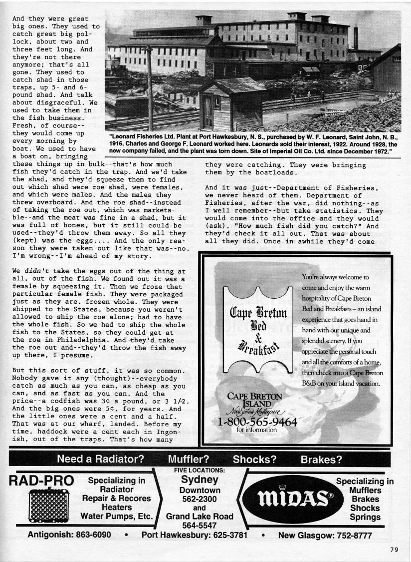 Published by Ronald Caplan on 1995/8/1 (162 reads)And they were great big ones. They used to catch great big pol? lock, about two and three feet long. And they're not there an3nnore; that's all gone. They used to catch shad in those traps, up 5- and 6- pound shad. And talk about disgraceful. We used to take them in the fish business. Fresh, of course-- they would come up every morning by boat. We used to have a boat on, bringing these things up in bulk--that's how much fish they'd catch in the trap. And we'd take the shad, and they'd squeeze them to find out which shad were roe shad, were females, and which were males. And the males they threw overboard. And the roe shad--instead of taking the roe out, which was marketa? ble- -and the meat was fine in a shad, but it was full of bones, but it still could be used--they'd throw them away. So all they (kept) was the eggs.... And the only rea? son they were taken out like that was--no, I'm wrong--I'm ahead of my story. We didn't take the eggs out of the thing at all, out of the fish. We found out it was a female by squeezing it. Then we froze that particular female fish. They were packaged just as they are, frozen whole. They were shipped to the States, because you weren't allowed to ship the roe alone; had to have the whole fish. So we had to ship the whole fish to the States, so they could get at the roe in Philadelphia. And -they'd take the roe out and--they'd throw the fish away up there, I prestime. But this sort of stuff, it was so common. Nobody gave it any (thought)--everybody catch as much as you can, as cheap as you can, and as fast as you can. And the price--a codfish was 3C a pound, or 3 l/'2. And the big ones were 5<:, for years. And the little ones were a cent and a half. That was at our wharf, landed. Before my time, haddock were a cent each in Ingon? ish, out of the traps. That's how many "Leonard Fisheries Ltd. Plant at Port Hawkesbury, N. S., purchased by W. F. Leonard, Saint John, N. B., 1916. Charles and George F. Leonard worked here. Leonards sold their interest, 1922. Around 1928, the new company failed, and the plant was torn down. Site of Imperial Oil Co. Ltd. since December 1972." they were catching. They were bringing them by the boatloads. And it was just--Department of Fisheries, we never heard of them. Department of Fisheries, after the war, did nothing--as I well remember--but take statistics. They would come into the office and they would (ask), "How much fish did you catch?" And they'd check it all out. That was about all they did. Once in awhile they'd come (Happ Irrtnn M You're always welcome to come and enjoy the wami hospitality of Cape Breton Bed and Breakfasts - an island experience that goes hand in hand with our unique and splendid scenery. If you appreciate the personal touch and all the comforts of a home, then check into a Cape Breron B&B; on your island vacation. Cape Breton ' ISLAND 1-800-565-9464 forinftirination Need a Radiator? Muffler? Shocks? Brakes? RAD-PRO Specializing in Radiator Repair & Recores Heaters Water Pumps, Etc. FIVE LOCATIONS: Sydney Downtown 562-2300 and Grand Lake Road 564-5547 tniDAS jSpecializing in l/lufflers Brakes Shocks Springs Antigonish: 863-6090 • Port Hawkesbury: 625-3781 New Glasgow: 752-8777