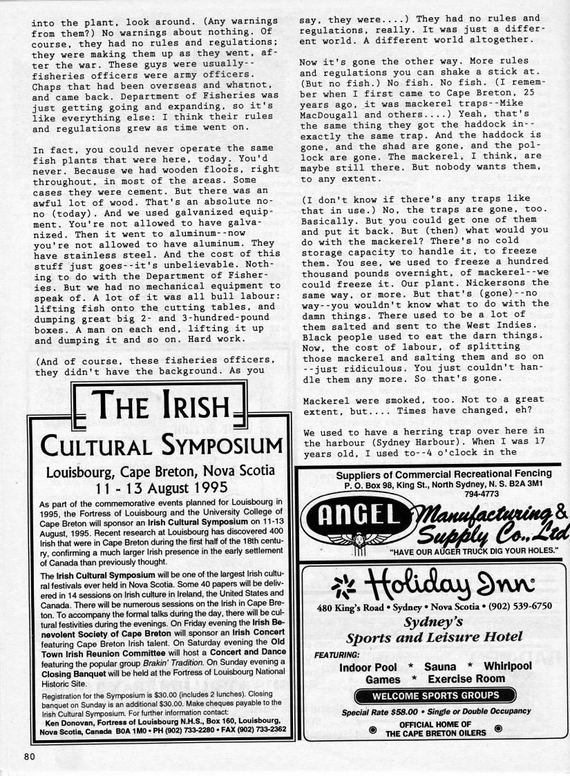 Published by Ronald Caplan on 1995/8/1 (162 reads)into the plant, look around. (Any warnings from them?) No warnings about nothing. Of course, they had no rules and regulations; they were making them up as they went, af? ter the war. These guys were usually-- fisheries officers were army officers. Chaps that had been overseas and whatnot, and came back. Department of Fisheries was just getting going and expanding, so it's like everything else: I think their rules and regulations grew as time went on. In fact, you could never operate the same fish plants that were here, today. You'd never. Because we had wooden floors, right throughout, in most of the areas. Some cases they were cement. But there was an awful lot of wood. That's an absolute no- no (today). And we used galvanized equip? ment. You're not allowed to have galva? nized. Then it went to aluminum--now you're not allowed to have aluminum. They have stainless steel. And the cost of this stuff just goes--it's unbelievable. Noth? ing to do with the Department of Fisher? ies . But we had no mechanical equipment to speak of. A lot of it was all bull labour: lifting fish onto the cutting tables, and dumping great big 2- and 3-hundred-pound boxes. A man on each end, lifting it up and dumping it and so on. Hard work. (And of course, these fisheries officers, they didn't have the background. As you LThe IrishJ Cultural Symposium Louisbourg, Cape Breton, Nova Scotia 11 -13 August 1995 As part of the commemorative events planned for Louisbourg in 1995, the Fortress of Louisbourg and the University College of Cape Breton will sponsor an Irish Cultural Symposium on 11-13 August, 1995. Recent research at Louisbourg has discovered 400 Irish that were in Cape Breton during the first half of the 18th centu? ry, confirming a much larger Irish presence in the early settlement of Canada than previously thought. The Irish Cultural Symposium will be one of the largest Irish cultu? ral festivals ever held in Nova Scotia. Some 40 papers will be deliv? ered in 14 sessions on Irish culture in Ireland, the United States and Canada. There will be numerous sessions on the Irish in Cape Bre? ton. To accompany the formal talks during the day, there will be cul? tural festivities during the evenings. On Friday evening the Irish Be? nevolent Society of Cape Breton will sponsor an Irish Concert featuring Cape Breton Irish talent. On Saturday evening the Old Town Irish Reunion Committee will host a Concert and Dance featuring the popular group Brakin' Tradition. On Sunday evening a Closing Banquet will be held at the Fortress of Louisbourg National Historic Site. Registration for the Symposium is $30.00 (includes 2 lunches). Closing banquet on Sunday is an additional $30.00. Make cheques payable to the Irish Cultural Symposium. For further information contact: Ken Donovan, Fortress of Louisbourg N.H.S., Box 160, Louisbourg, Nova Scotia, Canada BOA 1 MO • PH (902) 733-2280 • FAX (902) 733-2362 say, they were....) They had no rules and regulations, really. It was just a differ? ent world. A different world altogether. Now it's gone the other way. More rules and regulations you can shake a stick at. (But no fish.) No fish. No fish. (I remem? ber when I first came to Cape Breton, 25 years ago, it was mackerel traps--Mike MacDougall and others....) Yeah, that's the same thing they got the haddock in-- exactly the same trap. And the haddock is gone, and the shad are gone, and the pol? lock are gone. The mackerel, I think, are maybe still there. But nobody wants them, to any extent. (I don't know if there's any traps like that in use.) No, the traps are gone, too. Basically. But you could get one of them and put it back. But (then) what would you do with the mackerel? There's no cold storage capacity to handle it, to freeze them. You see, we used to freeze a hundred thousand pounds overnight, of mackerel--we could freeze it. Our plant. Nickersons the same way, or more. But that's (gone)--no way--you wouldn't know what to do with the damn things. There used to be a lot of them salted and sent to the West Indies. Black people used to eat the darn things. Now, the cost of labour, of splitting those mackerel and salting them and so on --just ridiculous. You just couldn't han? dle them any more. So that's gone. Mackerel were smoked, too. Not to a great extent, but.... Times have changed, eh? We used to have a herring trap over here in the harbour (Sydney Harbour). When I was 17 years old, I used to--4 o'clock in the Suppliers of Commercial Recreational Fencing p. O. Box 98, King St., North Sydney, N. S. B2A 3M1 794-4773 HAVE OUR AUGER TRUCK DIG YOUR HOLES." J??i -Ho'iuiax) a ;'?? yva: 480 King's Road • Sydney • Nova Scotia • (902) 539-6750 Sydney's Sports and Leisure Hotel FEATURING: Indoor Pool * Sauna * Whirlpool Games * Exercise Room WELCOME SPORTS GROUPS Special Rate $58.00 • Single or Double Occupancy ? OFFICIAL HOME OF THE CAPE BRETON OILERS 80