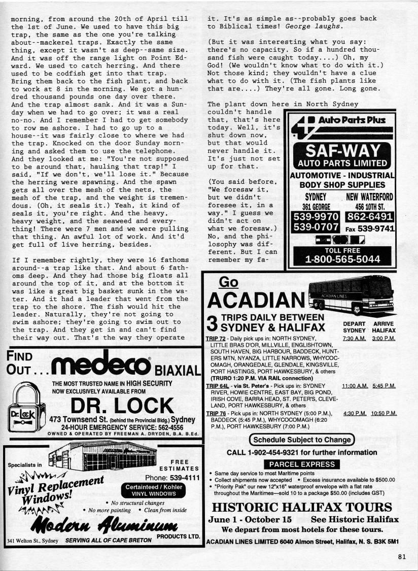 Published by Ronald Caplan on 1995/8/1 (162 reads)morning, from around the 20th of April till the 1st of June. We used to have this big trap, the same as the one you're talking about--mackerel traps. Exactly the same thing, except it wasn't as deep--same size. And it was off the range light on Point Ed? ward. We used to catch herring. And there used to be codfish get into that trap. Bring them back to the fish plant, and back to work at 8 in the morning. We got a hun? dred thousand pounds one day over there. And the trap almost sank. And it was a Sun? day when we had to go over; it was a real no-no. And I remember I had to get somebody to row me ashore. I had to go up to a house--it was fairly close to where we had the trap. Knocked on the door Sunday morn? ing and asked them to use the telephone. And they looked at me: "You're not supposed to be around that, hauling that trap!" I said, "If we don't, we'll lose it." Because the herring were spawning. And the spawn gets all over the mesh of the nets, the mesh of the trap, and the weight is tremen? dous. (Oh, it seals it.) Yeah, it kind of seals it, you're right. And the heavy, heavy weight, and the seaweed and every? thing! There were 7 men and we were pulling that thing. An awful lot of work. And it'd get full of live herring, besides. If I remember rightly, they were 16 fathoms around--a trap like that. And about 6 fath? oms deep. And they had those big floats all around the top of it, and at the bottom it was like a great big basket sunk in the wa? ter. And it had a leader that went from the trap to the shore. The fish would hit the leader. Naturally, they're not going to swim ashore; they're going to swim out to the trap. And they get in and can't find their way out. That's the way they operate Out ... ineUeCO BIAXIAL THE MOST TRUSTED NAME IN HIGH SECURITY NOW EXCLUSIVELY AVAILABLE FROM DR. LOCK 473 Townsend St. (behind the provincial eidg.) Sydney 24-HOUR EMERGENCY SERVICE: 562-4556 OWNED & OPERATED BY FREEMAN A. DRYDEN, B.A. B.Ed. FREE ESTIMATES Phone: 539-4111 Specialists in Certainteed / Kohler VINYL WINDOWS • No structural changes No more painting • Clean from inside it. It's as simple as--probably goes back to Biblical times! George laughs. (But it was interesting what you say: there's no capacity. So if a hundred thou? sand fish were caught today....) Oh, my God! (We wouldn't know what to do with it.) Not those kind; they wouldn't have a clue what to do with it. (The fish plants like that are....) They're all gone. Long gone. ?? AyloPoifsPhn The plant down here in North Sydney couldn't handle that, that's here today. Well, it's shut down now, but that would never handle it. It's just not set up for that. (You said before, "We foresaw it, but we didn't foresee it, in a way." I guess we didn't act on what we foresaw.) No, and the phi? losophy was dif? ferent . But I can remember my fa- 4 SAF-WAY AUTO PARTS LIMITED AUTOMOTIVE - INDUSTRIAL BODY SHOP SUPPLIES SYDNEY 361 GEORGE NEW WATERFORD 45610THST. 539-99701862-6491 539-0707 Fax 539-9741 341 Welton St., Sydney SERVING ALL OF CAPE BRETON PRODUCTS LTD. TOLL FREE 1-800-565-5044 ACADIAN STRIPS DAILY BETWEEN SYDNEY & HAUFAX TRIP 72 - Daily pick ups in: NORTH SYDNEY, LITTLE BRAS D'OR, MILLVILLE, ENGLISHTOWN, SOUTH HAVEN, BIG HARBOUR, BADDECK, HUNT? ERS MTN, NYANZA, LITTLE NARROWS, WHYCOC? OMAGH, ORANGEDALE, GLENDALE, KINGSVILLE, PORT HASTINGS, PORT HAWKESBURY, & others (TRURO 1:20 P.M. VIA RAIL connection) TRIP 64L - via St. Peter's - Pick ups in: SYDNEY RIVER, HOWIE CENTRE, EAST BAY, BIG POND, IRISH COVE, BARRA HEAD, ST PETER'S, CLEVE? LAND, PORT HAWKESBURY, & others TRIP 76 - Pick ups in: NORTH SYDNEY (5:00 P.M.), BADDECK (5:45 P.M.), WHYCOCOMAGH (6:20 P.M.), PORT HAWKESBURY (7:00 P.M.) ARRIVE HALIFAX 7:30 A.M. 3:00 P.M. 11:00 A.M. 5:45 P.M. 4:30 P.M, 10;5QP-M, (schedule Subject to Change} CALL 1-902-454-9321 for further Information PARCEL EXPRESS • Same day service to most Maritime points • Collect shipments now accepted • Excess insurance available to $500.00 • "Priority Pak" our new 12"x16" waterproof envelope with aflat rate throughout the Maritimes • sold 10 to a package $50.00 (includes GST) HISTORIC HALIFAX TOURS June 1 - October 15 See Historic Halifax We depart from most hotels for these tours. ACADIAN LINES LIMITED 6040 Almon Street, Halifax, N. S. B3K 5M1