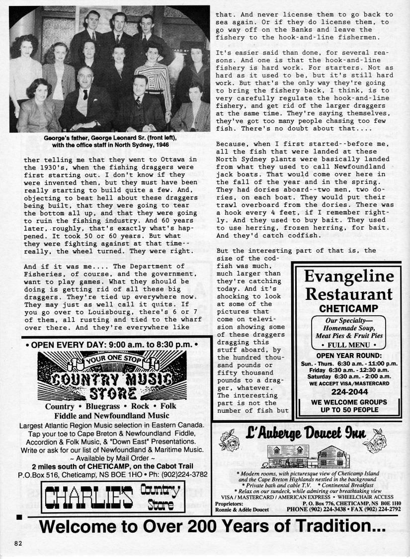 Published by Ronald Caplan on 1995/8/1 (180 reads)George's father, George Leonard Sr. (front left), with the office staff in North Sydney, 1946 ther telling me that they went to Ottawa in the 1930's, when the fishing draggers were first starting out. I don't know if they were invented then, but they must have been really starting to build quite a few. And, objecting to beat hell about these draggers being built, that they were going to tear the bottom all up, and that they were going to ruin the fishing industry. And 60 years later, roughly, that's exactly what's hap? pened. It took 50 or 60 years. But what they were fighting against at that time-- really, the wheel turned. They were right. And if it was me.... The Department of Fisheries, of course, and the government, want to play games. What they should be doing is getting rid of all these big draggers. They're tied up everywhere now. They may just as well call it quits. If you go over to Louisbourg, there's 6 or 7 of them, all rusting and tied to the wharf over there. And they're everywhere like • OPEN EVERY DAY: 9:00 a.m. to 8:30 p.m. _ j'i'''i!0mmmiiiiB&m;>j'}' ' mmrmmmm ''':'mt] Country • JBluegrass • Rock • Folk Fiddle and Newfoundland Music Largest Atlantic Region Music selection in Eastem Canada. Tap your toe to Cape Breton & Newfoundland Fiddle, Accordion & Folk Music, & "Down East" Presentations. Write or asl< for our list of Newfoundland & Maritime Music. ~ Available by Mail Order ~ 2 miles south of CHETICAMP, on the Cabot Trail P.O.Box516, Cheticamp, NS BOE IHO • Ph: (902)224-3782 that. And never license them to go back to sea again. Or if they do license them, to go way off on the Banks and leave the fishery to the hook-and-line fishermen. It's easier said than done, for several rea? sons. And one is that the hook-and-line fishery is hard work. For starters. Not as hard as it used to be, but it's still hard work. But that's the only way they're going to bring the fishery back, I think, is to very carefully regulate the hook-and-line fishery, and get rid of the larger draggers at the same time. They're saying themselves, they've got too many people chasing too few fish. There's no doubt about that.... Because, when I first started--before me, all the fish that were landed at these North Sydney plants were basically landed from what they used to call Newfoundland jack boats. That would come over here in the fall of the year and in the spring. They had dories aboard--two men, two do? ries, on each boat. They would put their trawl overboard from the dories. There was a hook every 4 feet, if I remember right? ly. And they used to buy bait. They used to use herring, frozen herring, for bait. And they'd catch codfish. But the interesting size of the cod? fish was much, much larger than they're catching today. And it's shocking to look at some of the pictures that come on televi? sion showing some of these draggers dragging this stuff aboard, by the hundred thou? sand pounds or fifty thousand pounds to a drag- ger, whatever. The interesting part is not the number of fish but part of that is, the Evangeline Restaurant CHETICAMP Our Specialty • Homemade Soup, Meat Pies & Fruit Pies • FULL MENU • OPEN YEAR ROUND: Sun. - Thurs. 6:30 a.m. -11:00 p.m. Friday 6:30 a.m. -12:30 a.m. Saturday 6:30 a.m. - 2:00 a.m. WE ACCEPT VISA/MASTERCARD 224-2044 WE WELCOME GROUPS UP TO 50 PEOPLE ??'Aiik • e Diuieei 9iiii * Modem rooms, with picturesque view of Cheticamp Island and the Cape Breton Highlands nestled in the background * Private bath and cable T. V. * Continental Brealrfast * Relax on our sundeck, while admiring our breathtaking view VISA/MASTERCARD/AMERICAN EXPRESS • WHEELCHAIR ACCESS Proprietors: P. O. Box 776, CHETICAMP, NS BOE IHO Ronnie & Adele Doucet PHONE (902) 224-3438 • FAX (902) 224-2792 Welcome to Over 200 Years of Tradition... 82