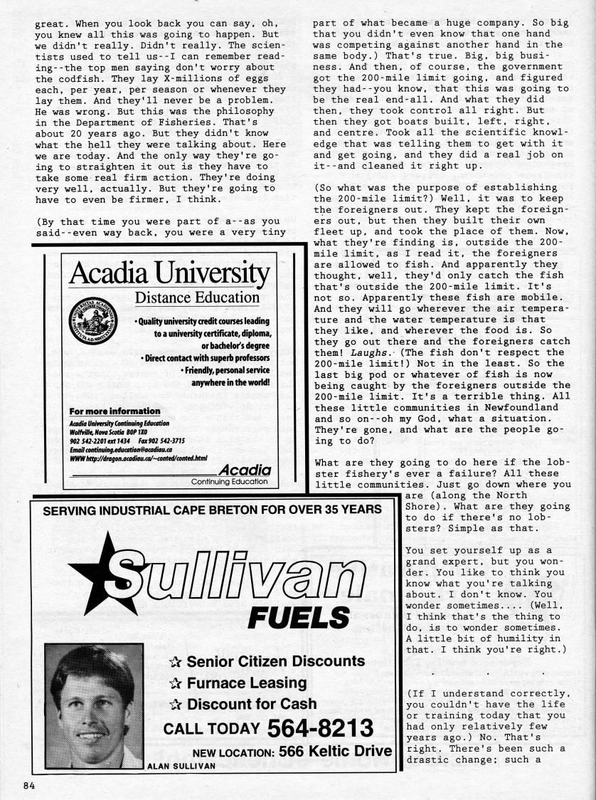 Published by Ronald Caplan on 1995/8/1 (152 reads)great. When you look back you can say, oh, you knew all this was going to happen. But we didn't really. Didn't really. The scien? tists used to tell us--I can remember read? ing- -the top men saying don't worry about the codfish. They lay X-millions of eggs each, per year, per season or whenever they lay them. And they'll never be a problem. He was wrong. But this was the philosophy in the Department of Fisheries. That's about 20 years ago. But they didn't know what the hell they were talking about. Here we are today. And the only way they're go? ing to straighten it out is they have to take some real firm action. They're doing very well, actually. But they're going to have to even be firmer, I think. (By that time you were part of a--as you said--even way back, you were a very tiny Acadia University Distance Education • Quality university credit courses leading to a university certificate, diploma, or bachelor's degree • Direct contact with superb professors • Friendly, personal service anywhere in the world! For more information A • adia University Con ingEduaition WofMlle, Now Scotia BOP 1X0 902 542-2201 ext 1434 Fax 902 542 3715 [mail(ontinuittg,edutation'cadiau.a WWWhttp-y/dmgott.a