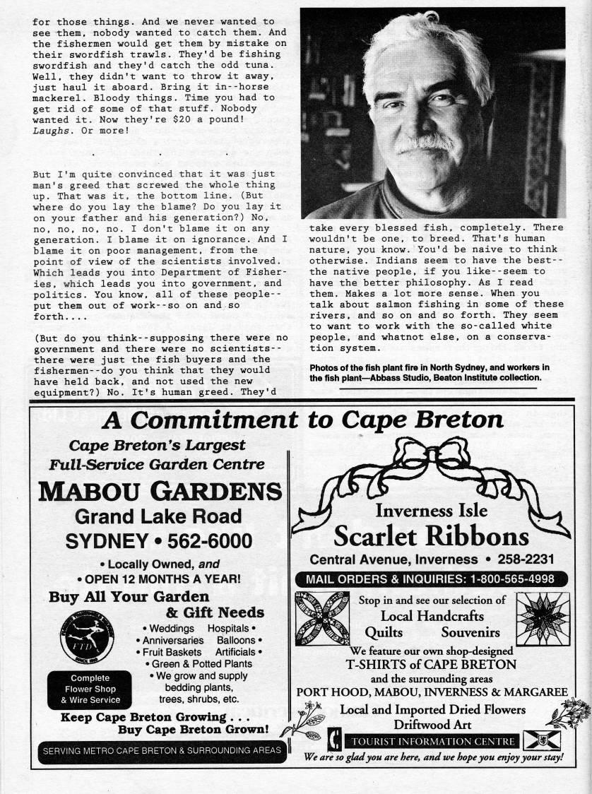 Published by Ronald Caplan on 1995/8/1 (168 reads)for those things. And we never wanted to see them, nobody wanted to catch them. And the fishermen would get them by mistake on their swordfish trawls. They'd be fishing swordfish and they'd catch the odd tuna. Well, they didn't want to throw it away, just haul it aboard. Bring it in--horse mackerel. Bloody things. Time you had to get rid of some of that stuff. Nobody wanted it. Now they're $20 a pound! Laughs. Or more! But I'm quite convinced that it was just man's greed that screwed the whole thing up. That was it, the bottom line. (But where do you lay the blame? Do you lay it on your father and his generation?) No, no, no, no, no. I don't blame it on any generation. I blame it on ignorance. And I blame it on poor management, from the point of view of the scientists involved. Which leads you into Department of Fisher? ies, which leads you into government, and politics. You know, all of these people-- put them out of work--so on and so forth.... (But do you think--supposing there were no government and there were no scientists-- there were just the fish buyers and the fishermen--do you think that they would have held back, and not used the new equipment?) No. It's human greed. They'd take every blessed fish, completely. There wouldn't be one, to breed. That's human nature, you know. You'd be naive to think otherwise. Indians seem to have the best-- the native people, if you like--seem to have the better philosophy. As I read them. Makes a lot more sense. When you talk about salmon fishing in some of these rivers, and so on and so forth. They seem to want to work with the so-called white people, and whatnot else, on a conserva? tion system. Photos of the fish plant fire In North Sydney, and workers in the fish plant • Abbass Studio, Beaton Institute collection. A Commitment to Cape Breton Cape Bretones Largest Full-Service Garden Centre MABOU GARDENS Grand Lake Road SYDNEY • 562-6000 • Locally Owned, and • OPEN 12 MONTHS A YEAR! Buy All Your Garden & Gift Needs • Weddings Hospitals • • Anniversaries Balloons • • Fruit Baskets Artificials • • Green & Potted Plants • We grow and supply bedding plants, trees, shrubs, etc. Complete Flower Shop & Wire Service Keep Cape Breton Growing . . . Buy Cape Breton Grown! Inverness Isle Scarlet Ribbons Central Avenue, Inverness • 258-2231 MAIL ORDERS & INQUIRIES: 1-800-565-4998 Stop in and see our selection of Local Handcrafts Quilts Souvenirs We feature our own shop-designed T-SHIRTS of CAPE BRETON and the surrounding areas PORT HOOD, MABOU, INVERNESS & MARGAREE Local and Imported Dried Flowers Driftwood Art TOURIST INFORMATION CENTRE We are so glad you are here, and we hope you enjoy your stayi