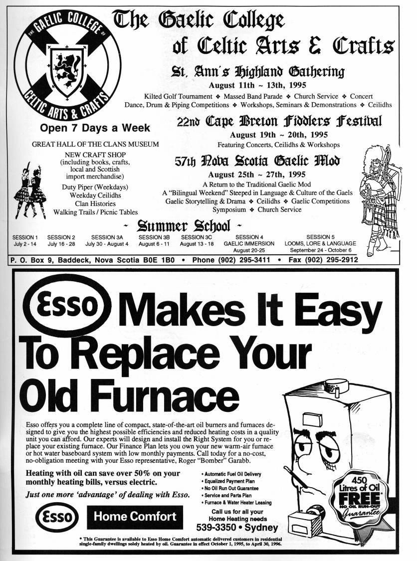 Published by Ronald Caplan on 1995/8/1 (130 reads)tOje ??aellc College of Celtic 'ns B. tvalts August 11th ~ 13th, 1995 Kilted Golf Tournament Massed Band Parade Church Service Concert Dance, Drum & Piping Competitions Workshops, Seminars & Demonstrations CeiUdhs Open 7 Days a Week GREAT HALL OF THE CLANS MUSEUM NEW CRAFT SHOP (including books, crafts, local and Scottish import merchandise) Duty Piper (Weekdays) Weekday Ceilidhs Clan Histories Walking Trails / Picnic Tables 22ttir Capt Mvmn fMtvs ftniM August 19th ~ 20th, 1995 Featuring Concerts, Ceilidhs & Workshops 57th 3eot? Stoila ??atlit J$lo' August 25th ~ 27th, 1995 A Retum to the Traditional GaeUc Mod A "Bilingual Weekend" Steeped in Language & Culture of the Gaels Gaelic Storytelling & Drama Ceilidhs Gaelic Competitions Symposium Church Service - Sttmmtr ScW SESSION 1 July 2-14 SESSION 2 July 16-28 SESSION 3A July 30 - August 4 SESSION SB August 6-11 SESSION 3C August 13-18 SESSION 4 GAELIC IMMERSION August 20-25 SESSION 5 LOOMS, LORE & LANGUAGE September 24 - October 6 P. 0. Box 9, Baddeck, Nova Scotia BOE 1B0 * Phone (902) 295-3411 • Fax (902) 295-2912 ' Makes It ToReplace Your OM :> Esso offers you a complete line of compact, state-of-the-art oil burners and furnaces de? signed to give you the highest possible efficiencies and reduced heating costs in a quality unit you caii afford. Our experts v/ill design and install the Right System for you or re? place your existing furnace. Our Finance Plan lets you own your new warm-air furnace or hot water baseboard system with low monthly payments. Call today for a no-cost, no-obligation meeting with your Esso representative, Roger "Bomber" Garabb. Heating with oil can save over 50% on your monthly heating bills, versus electric. Just one more 'advantage* of dealing with Esso. Cssdj • Automatic Fuel Oil Delivery • Equalized Payment Plan • No Oil Run Out Guarantee • Service and Parts Plan • Furnace & Water Heater Leasing Call us for all your Home Heating needs 539-3350 • Sydney * This Guarantee is available to Esso Home Comfort automatic delivered customers in residential single-family dwellings solely heated by oil. Guarantee hi effect October 1,1995, to April 30,1996. Home Comfort