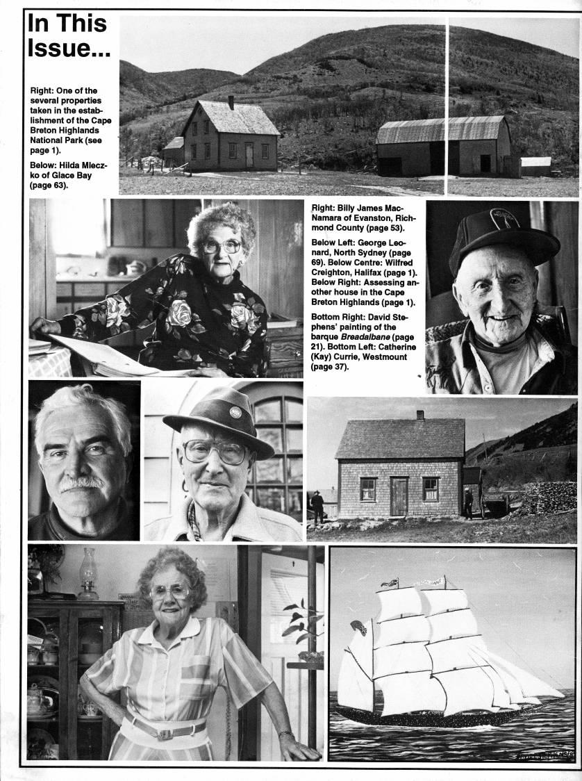 Published by Ronald Caplan on 1995/8/1 (152 reads)In This Issue... Right: One of the several properties taken In the estab? lishment of the Cape Breton Highlands National Park (see page 1). Below: Hilda MIecz? ko of Glace Bay (page 63). Right: Billy James Mac? Namara of Evanston, Rich? mond County (page 53). Below Left: George Leo? nard, North Sydney (page 69). Below Centre: Wilfred Creighton, Halifax (page 1). Below Right: Assessing an? other house In the Cape Breton Highlands (page 1). Bottom Right: David Ste? phens' painting of the barque Breadalbane (page 21). Bottom Left: Catherine (Kay) Currie, Westmount (page 37).