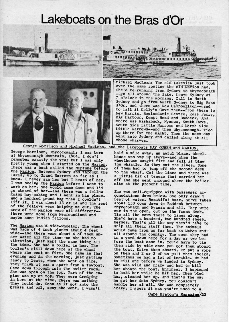 Published by Ronald Caplan on 1976/12/1 (998 reads)Lakeboats on the Bras d'Or 1% i'jvn ??,e. Michael MacLean; The old Lakeview just took over the same routine the old Marion had. She'd be running from Sydney to Whycocomagh • go all around the lake. Leave Sydney at 7 o'clock in the morning. Call in North Sydney and go from North Sydney to Big Bras d'Or. And there was New Campbellton • used to call it Kelly's Cove then • from there to New Harris, Boulardarie Centre, Ross Ferry, Big Harbour, Kempt Head and Baddeck. And there was Washabuck, Nyanza, South Cove, South Side Little Narrows and North Side Little Narrows • and then Whycocomagh. Tied up there for the night. Then the next day went into Sydney and called along at all those wharves. George Morrison and Michael MacLean, and the Lakeboats MAY QUEEN and MARION. George Morrison, Whycocomagh; I was born at Whycocomagh Mountain, 1904. I don't remember exactly the year but I was only pretty young when I started on the Marion. There was a boat called the Neptune before the Marion. Between Sydney eind through the lakes, up to Grand Narrows as far as I know. I never saw her but I heard of her. I was seeing the Marion before I went to work on her. She would come down and I'd go aboard of her • and there was a fellow going hay-making and I went in his place. And a hundred pound bag then I couldn't lift it. I was about 13 or 14 and the rest of the fellows were helping me out. The crew of the Marion were all different • there were some from Newfoundland and maybe some Indian fellows. The Marion was a side-wheeler. The wheel was made of 4 inch planks about 4 feet wide • and there were about 4 of them un? der water all the time • so she had no vibration, just kept the same thing all the time. She had a boiler in her. The boiler's still down here at the wharf where she went on fire. She came in that evening and in the morning, just getting ready to leave, when she went on fire. They think it was a spark from a towboat. Came down through into the boiler room. She was open on the top. Part of the en? gine was up on top. They were dredging in here at the time. There was nothing they could do. Soon as it got into the grease and oil, away she went. I wasn't half a mile away. An awful blaze. iVheel- house was way up above • and when the wheelhouse caught fire and fell it blew the whistle. So they cut the lines. Some of them had to jump off the second deck to the wharf. Cut the lines and there was a little bit of breeze that carried her off and she went aground where the boiler sits at the present time. She was well-equipped with passenger ac? comodations down below. She only drew 4 feet of water. Beautiful boat, ife've taken about 150 cows down to Baddeck between liftiycocomagh and Nyanza and all. They were out in the open, out on the front deck. Tie all the cows there to lines along. She'd have a hundred, two hundred sheep. H<>rses. That's all the way they'd haVe to ship all their stuff then. The animals would come from as far back as Mabou and all around the country. The cows they had in a yard down here for a day or two be? fore the boat came in. You'd have to tie them side by side once you got them aboard the boat. Drive them aboard. Or put a rope on them and 2 or 3 of us pull them aboard. Sometimes we had a lot of trouble. We had to kill one before xve landed in Sydney. She was wild and crazy and had to kill her aboard the boat. Engineer. I happened to hold her while he hit her. Then bled her, cleaned her up. And that's the way he got her into Sydney. You couldn't handle her at all. She was completely crazy. I guess it was you're used to a Cape Breton's Magazine/23
