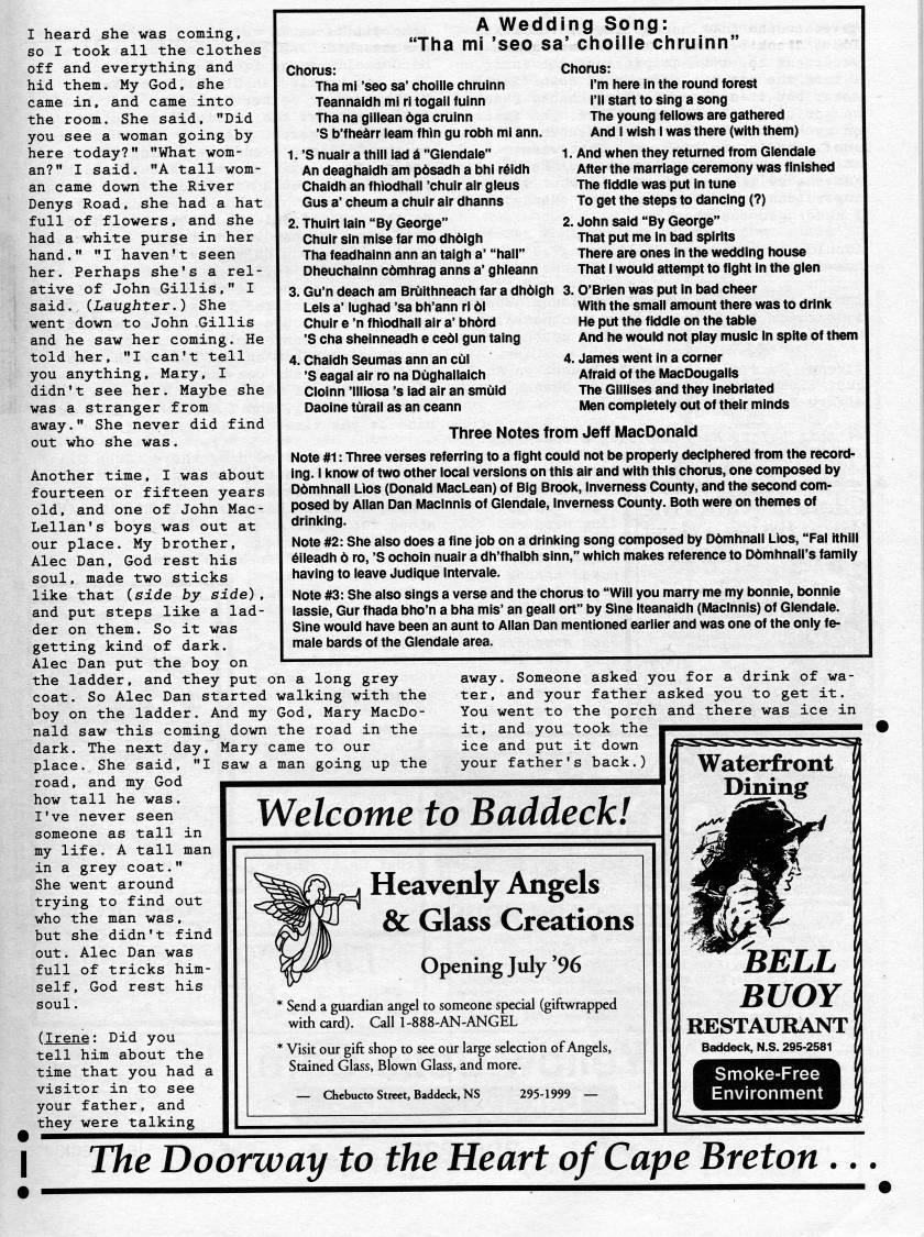 Published by Ronald Caplan on 1996/6/1 (256 reads)I heard she was coming, so I took all the clothes off and everything and hid them. My God, she came in, and came into the room. She said, "Did you see a woman going by here today?" "What wom? an?" I said. "A tall wom? an came down the River Denys Road, she had a hat full of flowers, and she had a white purse in her hand." "I haven't seen her. Perhaps she's a rel? ative of John Gillis," I said. (Laughter.) She went down to John Gillis and he saw her coming. He told her, "I can't tell you anything, Mary, I didn't see her. Maybe she was a stranger from away." She never did find out who she was. Another time, I was about fourteen or fifteen years old, and one of John Mac- Lellan's boys was out at our place. My brother. Alec Dan, God rest his soul, made two sticks like that (side by side), and put steps like a lad? der on them. So it was getting kind of dark. Alec Dan put the boy on the ladder, and they put coat. So Alec Dan started boy on the ladder. And my nald saw this coming down dark. The next day, Mary place. She said, "I saw a road, and my God how tall he was. I've never seen someone as tall in my life. A tall man in a grey coat." She went around trying to find out who the man was, but she didn't find out. Alec Dan was full of tricks him? self, God rest his soul. A Wedding Song: "Tha mi 'seo sa' chollle chruinn" Chorus: Tha mi 'sec sa' choille chruinn Teannaidh mi ri togail fuinn Tha na gillean 6ga cruinn 'S b'fhedrr leam fhin gu robh mi ann. 1. 'S nuair a thill lad d "Glendale" An deaghaidh am pdsadh a bhi r'idh Chaidh an fhiodhall 'chuir air gleus Gus a' cheum a chuir air dhanns 2. Thuirt lain "By George" Chuir sin mise far mo dhbigh Tha feadhainn ann an taigh a' "hall" Dheuchainn cdmhrag anns a' ghleann 3. Gu'n deach am Briiithneach far a dhbigh Leis a' lughad 'sa bh'ann ri 61 Chuir e 'n fhiodhall air a' bhdrd 'S cha sheinneadh e cedl gun taing 4. Chaidh Seumas ann an cul '8 eagai air ro na DCighailaich Cloinn 'llliosa 's lad air an smiiid Daoine tOrail as an ceann Chorus: I'm here in the round forest I'll start to sing a song The young fellows are gathered And I wish I was there (with them) 1. And when they returned from Glendale After the marriage ceremony was finished The fiddle was put in tune To get the steps to dancing (?) 2. John said "By George" That put me In bad spirits There are ones in the wedding house That I would attempt to fight In the glen 3. O'Brien was put in bad cheer With the small amount there was to drink He put the fiddle on the table And he would not play music in spite of them 4. James went in a corner Afraid of the MacDougalis The Gillises and they inebriated Men completely out of their minds Three Notes from Jeff MacDonald Note #1: Three verses referring to a fight could not be properly deciphered from the record? ing. I know of two other local versions on this air and with this chorus, one composed by Ddmhnall Lios (Donald MacLean) of Big Brook, Inverness County, and the second com? posed by Allan Dan Maclnnis of Glendale, Inverness County. Both were on themes of drinking. Note #2: She also does a fine job on a drinking song composed by Dbmhnaii Lios, "Fal ithill 6ileadh 6 ro, 'S ochoin nuair a dh'fhaibh sinn," which makes reference to Ddmhnail's family having to leave Judique Intervale. Note #3: She also sings a verse and the chorus to "Will you marry me my bonnie, bonnie lassie, Gur fhada bho'n a bha mis' an geall ort" by Sine Iteanaidh (Maclnnis) of Glendale. Sine would have been an aunt to Allan Dan mentioned earlier and was one of the only fe? male bards of the Glendale area. on a long grey walking with the God, Mary MacDo- the road in the came to our man going up the away. Someone asked you for a drink of wa? ter, and your father asked you to get it. You went to the porch and there was ice in it, and you took the ice and put it down your father's back.) (Irene: Did you tell him about the time that you had a visitor in to see your father, and they were talking Welcome to Baddeck! Heavenly Angels & Glass Creations Opening July '96 * Send a guardian angel to someone special (giftwrapped widi card). Call 1-888-AN-ANGEL * Visit our gift shop to see our large selection of Angels, Stained Glass, Blown Glass, and more. Chcbucto Street, Baddeck, NS 295-1999 • Waterfront Dining BELL BUOY RESTAURANT Baddeck, N.S. 295-2581 Sinoke-Free Environment I The Doorway to the Heart of Cape Breton ...