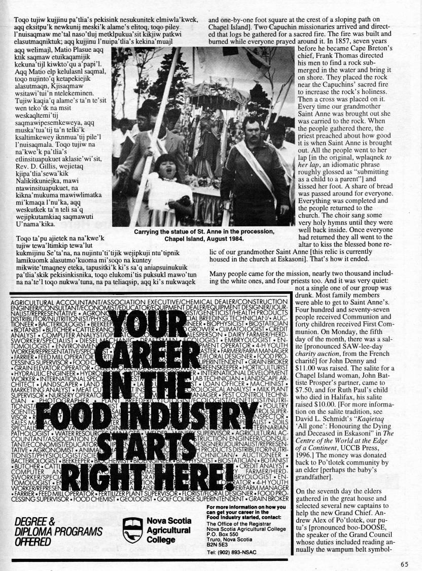 Toqo tujiw kujjinu pa'tlia's pekisink nesukunitek elmiwla'kwek, aqq eksitpu'k newkunij meski'k alame's ehtoq, toqo piley I'nuisaqmaw me'tal naso'tluj metklpukua'sit lokjiw patkwi elasutmaqniktuk; aqq kujjinu I'nuipa'tlia's kekina'muajl aqq welimajl, Matio Plasue aqq ktik saqmaw etuikaqamijik kekuna'tijl kiwkto'qu a'papi'l. Aqq Matio elp kelulasnl saqmal, toqo nujinto'q ketapekiejik alasutmaqn, Kjisaqmaw wsitawi'tui'n ntelekeminen. Tujiw kaqia'q alame's ta'n te'sit wen teko'tk na msit weskaqltemi'tij saqmawipesemkeweya, aqq muska'tua'tij ta'n telki'k ksaltimkewey iknmua'tij pile'l I'nuisaqmala. Toqo tujiw na na'kwe'kpa'tha's etlinsituapukuet aklasie'wi'sit. Rev. D. Gillis, wejietaq kjipa'tlia'sewa'kik NaJikitkuniejka, mawi ntawinsituapukuet, na kikna'mukuma mawiwlimatka mi'kmaqa I'nu'ka, aqq weskutkek ta'n teh sa'q wejipkutamkiaq saqmawuti U'nama'kika. Toqo ta'pu ajietek na na'kwe'k tujiw tewa'ltimkip tewa'lut kukmijinu Se'ta'na, na nujintu'ti'tijik wejipkuji ntu'tipnik lamikuomk alasutmo'kuoma mi'soqo na kuntey mikwite'tmaqney eteka, tapusitki'k ki's sa'q aniapsuinukuik pa'tlia'skik pekisinkisnika, toqo elukomi'tis puksukl mawo'tun na na'.te'l toqo nukwa'tuna, na pa teliaqsip, aqq ki's nukwaqek Carrying the statue of St. Anne in the procession, Chapel Island, August 1984. and one-by-one foot square at the crest of a sloping path on Chapel Island]. Two Capuchin missionaries arrived and direct? ed that logs be gathered for a sacred fire. The fire was built and burned while everyone prayed around it. In 1857, seven years before he became Cape Breton's chief, Frank Thomas directed his men to find a rock sub? merged in the water and bring it on shore. They placed the rock near the Capuchins' sacred fire to increase the rock's holiness. Then a cross was placed on it. Every time our grandmother Saint Anne was brought out she was carried to the rock. When the people gathered there, the priest preached about how good it is when Saint Anne is brought out. All the people went to her lap [in the original, wplaqnek to her lap, an idiomatic phrase roughly glossed as "submitting as a child to a parent"] and kissed her foot. A share of bread was passed around for everyone. Everything was completed and the people returned to the church. The choir sang some very holy hymns until they were well back inside. Once everyone had retumed they all went to the altar to kiss the blessed bone re? lic of our grandmother Saint Anne [this relic is currently housed in the church at Eskasoni]. That's how it ended. AGRICULTURAL ACCOUNTANT/ASSOCIATION EXECUTIVE/CHEMICAL DEALER/CONSTRUCTION ENGINEER/CONSULTANT/ECONO/ NALIST/REPRESENTATIVE. AGRON< DISTRIBUTOR/N UTRITIONIST/PH YSlL TIONEER.BACTERIOLOGIST.BEEKEEI . . BOTANIST. BUTCHER • CATTLE RANCl ANALYST. COMPUTER ANALYST/OPi SWORKER/SPECIALIST. DIESEL TOMOLOGIST • ENVIRONMENL . WORKER/REPRESENTATIVE/SPECfcr .FARRIER. FEED MILLOPERATORWTII CESSING SUPERVISOR. FOODCH" ??" . GRAIN ELEVATOR OPERATOR. L. . HYDRAULIC ENGINEER. HYDROL WORKER. INTERNATIONAL SPECL CHITECT. LANDSCAPER . LAND : MARKETING ANALYST. MEAT CU' SUPERVISOR. NURSERY OPERATOI CIAN , TIONIST/ SCIENTIS VISOR. R SALES M, SPECIALL PATHOLOGIST. WATER RESOUR( COUNTANT/ASSOCIATION E;' TANT/ECONOMIST/EDUCATOI TATIVE. AGRONOMIST. ANIM- TIONIST/PHYSIOLOGIST/SCIEl BACTERIOLOGIST. BEEKEEPER." . BUTCHER . CATTL[ COMPUTER AN SWORKER/SPECL TOMOLOGIST. El WORKER/REPRESEh . FARRIER. FEED MILLOPERATOR Many people came for the mission, nearly two thousand includ? ing the white ones, and four priests too. And it was very quiet: not a single one of our group was drunk. Most family members were able to get to Saint Anne's. Four hundred and seventy-seven people received Communion and forty children received First Com? munion. On Monday, the fifth day of the month, there was a sal- ite [pronounced SAW-lee-day charity auction, from the French charite] for John Denny and $11.00 was raised. The salite for a Chapel Island woman, John Bat? tiste Prosper's partner, came to $7.50, and for Ruth Paul's child who died in Halifax, his saHte raised $10.00. [For more informa? tion on the salite tradition, see David L. Schmidt's "'Kaqietaq 'All gone': Honouring the Dying and Deceased in Eskasoni" in The Centre of the World at the Edge of a Continent, UCCB Press, 1996.] The money was donated back to Po'tlotek community by an elder [perhaps the baby's grandfather]. IIPMENT DEALER/EQUIPMENT DESIGNER/JOUR- '.IST/GENETICIST/HEALTH PRODUCTS JAL BREEDING TECHNICIArV' AUC- fNEER. BIOPHYSICIST • BIOSTATICIAN GROWER. CLIMATOLOGIST. CREDIT 'lESPERSON . DAIRY FARMER/HERD- '"LOGIST . EMBRYOLOGIST . EN- '"'MENT OPERATOR • 4-H YOUTH ' ?? STER. FARMER/FARM MANAGER ;T/FL0RAL DESIGNER • FOOD PRO- ;yPERINTENDENT. GRAIN BROKER ,iREENSKEEPER. HORTICULTURIST ;R . INTERNATIONAL DEVELOPMENT LAB TECHNICIAN . LANDSCAPE AR- 'T. LOAN OFFICER . MACHINIST . ROLOGICAL ANALYST. MILK PLANT iANAGER. PEST CONTROL TECHNI- ST/NUTRI POULTRY , ROLSUPER- fNSPECTOR. ALIST. SOILS ..._ JTERINARIAN SUPERVISOR. AGRICULTURAL AC- TRUCTION ENGINEER/CONSUL- ESIGNER/JOURNALIST/REPRESEN- H PRODUCTS DISTRIBUTOR/NUTRI- ECHNICIAN/. AUCTIONEER . SICIST. BIOSTATICIAN. BOTANIST CREDIT ANALYST. Y FARMER/HERD- BRYOLOGIST. EN- 'ATOR. 4-H YOUTH _ '.iER/FARM MANAGER IALDESIGNER. FOOD PRO? CESSING SUPERVISOR. FOOD CHEMIST. GEOLOGIST. GOLF COURSE SUPERINTENDENT. GRAIN BROKER For more information on how you can get your career in the Food industry started, contact: The Office of the Registrar Nova Scotia Agricultural College P.O. Box 550 Truro, Nova Scotia B2N 5E3 DEGREE& DIPLOMA PROGRAMS OFFERED Nova Scotia Agricultural College Tel: (902) 893-NSAC On the seventh day the elders gathered in the great house and selected several new captains to help the new Grand Chief An? drew Alex of Po'tlotek, our pu- tu's [pronounced boo-DOOSE, the speaker of the Grand Council whose duties included reading an? nually the wampum belt symbol-