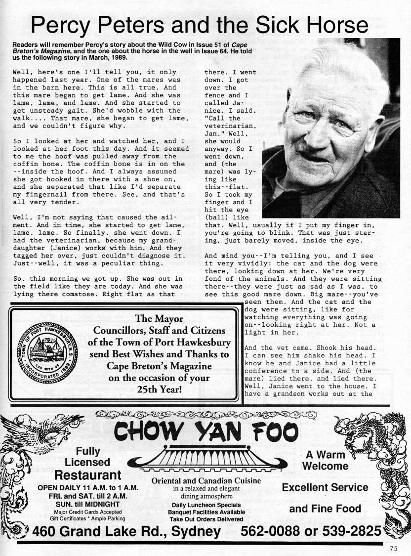 Published by Ronald Caplan on 1996/12/1 (166 reads)Percy Peters and the Sick Horse ers will remember Percy's story about the Wild Cow In issue 51 of Cape ''% Readers will remember Percy's story about the Wild Cow In issue 51 of Cape Breton's Magazine, and the one about the horse in the well in issue 64. He told us the following story In March, 1989. Well, here's one I'll tell you, it only happened last year. One of the mares was in the barn here. This is all true. And this mare began to get lame. And she was lame, lame, and lame. And she started to get unsteady gait. She'd wobble with the walk.... That mare, she began to get lame, and we couldn't figure why. So I looked at her and watched her, and I looked at her foot this day. And it seemed to me the hoof was pulled away from the coffin bone. The coffin bone is in on the --inside the hoof. And I always assumed she got hooked in there with a shoe on, and she separated that like I'd separate my fingernail from there. See, and that's all very tender. Well, I'm not saying that caused the ail? ment. And in time, she started to get lame, lame, lame. So finally, she went down. I had the veterinarian, because my grand? daughter (Janice) works with him. And they tagged her over, just couldn't diagnose it. Just--well, it was a peculiar thing. So, this morning we got up. She was out in the field like they are today. And she was lying there comatose. Right flat as that The Mayor Councillors, Staff and Citizens of the Town of Port Hawkesbury send Best Wishes and Thanks to Cape Breton's Magazine on the occasion of your 25th Year! there. I went down. I got over the fence and I called Ja? nice. I said, "Call the veterinarian, Jan." Well, she would anyway. So I went down, and (the mare) was ly? ing like this--flat. So I took my finger and I hit the eye (ball) like that. Well, usually if I put my finger in, you're going to blink. That was just star? ing, just barely moved, inside the eye. And mind you--I'm telling you, and I see it very vividly: the cat and the dog were there, looking down at her. We're very fond of the animals. And they were sitting there--they were just as sad as I was, to see this good mare down. Big mare--you've seen them. And the cat and the dog were sitting, like for watching everything was going on--looking right at her. Not a light in her. And the vet came. Shook his head. I can see him shake his head. I know he and Janice had a little conference to a side. And (the mare) lied there, and lied there. Well, Janice went to the house. I have a grandson works out at the CflOW VAN f00 Fully Licensed Restaurant ??y'mnmml' OPEN DAILY 11 A.M. to 1 A.M. FRI. and SAT. till 2 A.M. SUN. till MIDNIGHT Major Credit Cards Accepted Gift Certificates * Ample Parking Oriental and Canadian Cuisine in a relaxed and elegant dining atmosphere Dally Luncheon Specials Banquet Facilities Available Take Out Orders Delivered A Warm Welcome Excellent Service and Fine Food ' 460 Grand Lake Rd., Sydney 562-0088 or 539-2825