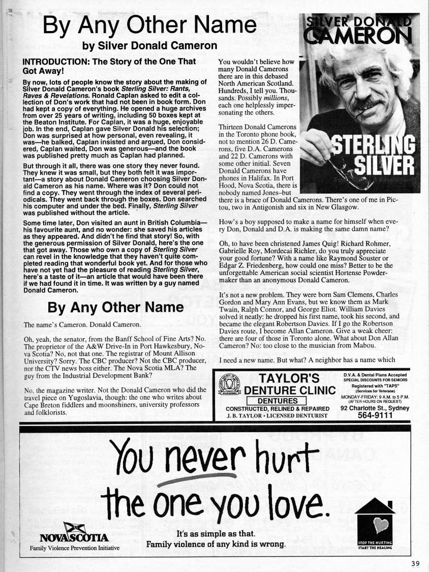Published by Ronald Caplan on 1997/6/1 (688 reads)By Any Other Name |B|S'?55' by Silver Donald Cameron fiJ'IVICIxWi' by Silver Donald Cameron INTRODUCTION: The Story of the One That Got Away! By now, lots of people know the story about the making of Silver Donald Cameron's book Sterling Silver: Rants, Raves & Revelations. Ronald Caplan asked to edit a col? lection of Don's work that had not been in book form. Don had kept a copy of everything. He opened a huge archives from over 25 years of writing, including 50 boxes kept at the Beaton Institute. For Caplan, it was a hu'e, enjoyable job. In the end, Caplan gave Silver Donald his selection; Don was surprised at how personal, even revealing, It was • he balked, Caplan insisted and argued, Don consid? ered, Caplan waited, Don was generous • and the book was published pretty much as Caplan had planned. But through it all, there was one story they never found. They knew it was small, but they both felt it was impor? tant • a story about Donald Cameron choosing Silver Don? ald Cameron as his name. Where was it? Don could not find a copy. They went through the index of several peri? odicals. They went back through the boxes. Don searched his computer and under the bed. Finally, Sterling Silver was published without the article. Some time later, Don visited an aunt In British Columbia • his favourite aunt, and no wonder: she saved his articles as they appeared. And didn't he find that story! So, with the generous permission of Silver Donald, here's the one that got away. Those who own a copy of Sterling Silver can revel in the knowledge that they haven't quite com? pleted reading that wonderful book yet. And for those who have not yet had the pleasure of reading Sterling Silver, here's a taste of it • an article that would have been there if we had found it in time. It was written by a guy named Donald Cameron. By Any Othier Name The name's Cameron. Donald Cameron. Oh, yeah, the senator, from the Banff School of Fine Arts? No. The proprietor of the A&W; Drive-In in Port Hawkesbury, No? va Scotia? No, not that one. The registrar of Mount Allison University? Sorry. The CBC producer? Not the CBC producer, nor the CTV news boss either. The Nova Scotia MLA? The guy from the Industrial Development Bank? No. the magazine writer. Not the Donald Cameron who did the travel piece on Yugoslavia, though: the one who writes about Cape Breton fiddlers and moonshiners, university professors and folklorists. You wouldn't believe how many Donald Camerons there are in this debased North American Scotland. Hundreds, I tell you. Thou? sands. Possibly millions, each one helplessly imper? sonating the others. Thirteen Donald Camerons in the Toronto phone book, not to mention 26 D. Came? rons, five D.A. Camerons and 22 D. Camerons with some other initial. Seven Donald Camerons have phones in Halifax. In Port Hood, Nova Scotia, there is | nobody named Jones-but there is a brace of Donald Camerons. There's one of me in Pic? tou, two in Antigonish and six in New Glasgow. How's a boy supposed to make a name for himself when eve? ry Don, Donald and D.A. is making the same damn name? Oh, to have been christened James Quig! Richard Rohmer, Gabrielle Roy, Mordecai Richler, do you truly appreciate your good fortune? With a name like Raymond Souster or Edgar Z. Friedenberg, how could one miss? Better to be the unforgettable American social scientist Hortense Powder- maker than an anonymous Donald Cameron. It's not a new problem. They were born Sam Clemens, Charles Gordon and Mary Ann Evans, but we know them as Mark Twain, Ralph Connor, and George Eliot. William Davies solved it neatly: he dropped his first name, took his second, and became the elegant Robertson Davies. If I go the Robertson Davies route, I become Allan Cameron. Give a weak cheer: there are four of those in Toronto alone. What about Don Allan Cameron? No: too close to the musician from Mabou. I need a new name. But what? A neighbor has a name which ' TAYLOR'S 'm DENTURE CLINIC "dentures I CONSTRUCTED, RELINED & REPAIRED J. B. TAYLOR • LICENSED DENTURIST D.V.A. & Dental Plans Accepted SPECIAL DISCOUNTS FOR SENIORS Registered with "TAPS" (Services for Veterans) MONDAY-FRIDAY: 9 A.M. to 5 P.M. (AFTER HOURS ON REQUEST) 92 Charlotte St., Sydney 564-9111 Family Violence Prevention Initiative You jieyer hurt 1he one you love. It's as simple as that. Family violence of any kind is wrong. START THE HEAIINC 39
