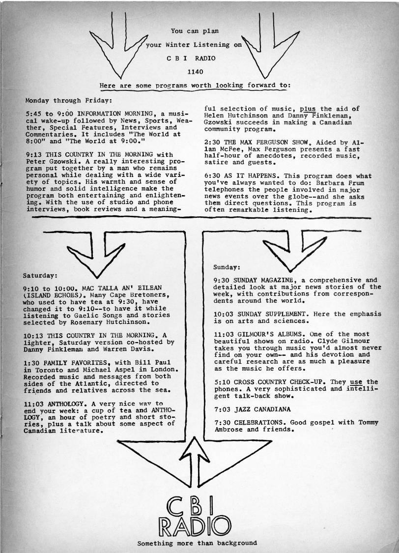 Published by Ronald Caplan on 1973/1/1 (598 reads)You can plan 'your Winter Listening on CBI RADIO 1140 Here are some programs worth looking forward to: Monday through Friday: 5:45 to 9:00 INFORMATION MORNING, a musi? cal wake-up followed by News, Sports, Wea ther, Special Features, Interviews and Commentaries. It includes "The World at 8:00" and "The World at 9:00." 9:13 THIS COUNTRY IN THE MORNING with Peter Gzowski. A really interesting pro? gram put together by a man who remains personal while dealing with a wide vari? ety of topics. His warmth and sense of humor and solid intelligence make the program both entertaining and enlighten? ing. With the use of studio and phone interviews, book reviews and a meaning? ful selection of music, plus the aid of Helen Hutchinson and Danny Finkleman, Gzowski succeeds in making a Canadian community program. 2:30 THE MAX FERGUSON SHOW' Aided by Al? lan McFee, Max Ferguson presents a fast half-hour of anecdotes, recorded m.usic, satire and guests. 6:30 AS IT HAPPENS. This program does what you've always wanted to do: Barbara Frum telephones the people involved in major news events over the globe • and she asks them direct questions. This program is often remarkable listening. Saturday: 9:10 to 10:00. MAC TALLA AN' EILEAN USLAND ECHOES). Many Cape Bretoners, who used to have tea at 9:30, have changed it to 9:10 • to have it while listening to Gaelic Songs and stories selected by Rosemary Hutchinson. 10:13 THIS COUNTRY IN THE MORNING. A lighter, Saturday version co-hosted by Danny Finkleman and Warren Davis. 1:30 FAMILY FAVORITES, with Bill Paul in Toronto and Michael Aspel in London. Recorded music and messages from both sides of the Atlantic, directed to friends and relatives across the sea. 11:03 ANTHOLOGY. A very nice wav to end your week: a cup of tea and ANTHO? LOGY, an hour of poetry and short sto? ries, plus a talk about some aspect of Canadian literature. Sunday: 9:30 SUNDAY MAGAZINE, a comprehensive and detailed look at major news stories of the week, with contributions from correspon? dents around the world. 10:03 SUNDAY SUPPLEMENT. Here the emphasis is on arts and sciences. 11:03 GILMOUR'S ALBUMS. One of the most beautiful shows on radio. Clyde Gilmour takes you through music you'd almost never find on your own • and his devotion and careful research are as much a pleasure as the music he offers. 5:10 CROSS.COUNTRY CHECK-UP. They use the phones. A very sophisticated and intelli? gent talk-back show. 7:03 JAZZ CANADIANA 7:30 CELEBRATIONS. Good gospel with Tommy Ambrose and friends. Something more than background