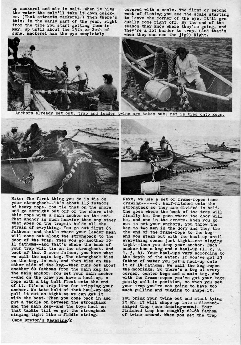 Published by Ronald Caplan on 1977/8/1 (459 reads)up mackerel and mix in salt. When it hits the water the salt'11 take it down quick? er. (That attracts mackerel.) Then there's this: in the early part of the year, right from the time you start getting them in May, up until about the 15th or 2oth of June, mackerel has the eye completely covered with a scale. The first or second week of fishing you see the scale starting to leave the comer of the eye. It'll gra? dually come right off. By the end of the season they know where they're going, and they're a lot harder to trap. (And that's when they can see the jig?) Right. Anchors already set out, trap and leader twine are taken out; net is tied onto kegs. Mike: The first thing you do is tie on your strongback • it's about 115 fathoms of heavy rope. You tie that on the shore and go straight out off of the shore with this rope with a main anchor on the end. That anchor is much heavier than any other that goes on th*e trap;it holds all the strain of evrything. You go out first 65 fathoms • and that's where your leader mesh will come out along the strongback to the door of the trap. Then you go another 10- 11 fathoms • and that's where the back of your trap will tie on the strongback. And back of that 2 more fathom, you have what we c'l the main keg. The strongback ties on the keg, is cut, and then ties on the other side of the keg • then runs out about another 60 fathoms from the main keg to the main anchor. You set your main anchor • and on the claw you have a haul-up, a rope with a big ball float onto the end of it. It's a trip line for tripping your anchor. We take hold of that haul-up and pull it out as tight as we can get it with the boat. Then you come back in and put a tackle on between the strongback and the main keg • and the boys haul on that tackle till we get the strongback singing tight like a fiddle string. Cape Breton's Maga2ine/2 .''''J'''''w ~ Next, we use a set of frame-ropes (see drawing -) , half-hitched onto the strongback so they are divided in half. One goes where the back of the trap will finally be. One goes where the door will be, and one in the centre. When you go out to set your anchors, you throw the keg to two men in the dory and they tie the end of the frame-rope to the keg • and you steam out with the haul-up until everything comes just tight • not singing tight • then you drop your anchor. Each anchor has a keg and a haul-up (1, 2, 3, 4, 5f 6). Your haul-ups vary according to the depth of the water. If you've got I3 fathom of water you put a haul-up onto it of 14 fathoms. We call the keg ropes the moorings. So there's a keg at every corner, center kegs and a main keg. And with the frame-ropes you've got your kegs pretty well in position, so when you set your trap you're not going to have too much pulling and tugging to shape it. You bring your twine out and start tying it on. It will shape up into a diamond- shaped trap (see drawing-o-o-o'). Your finished trap has roughly 62-64 fathom of twine around. When you get the trap