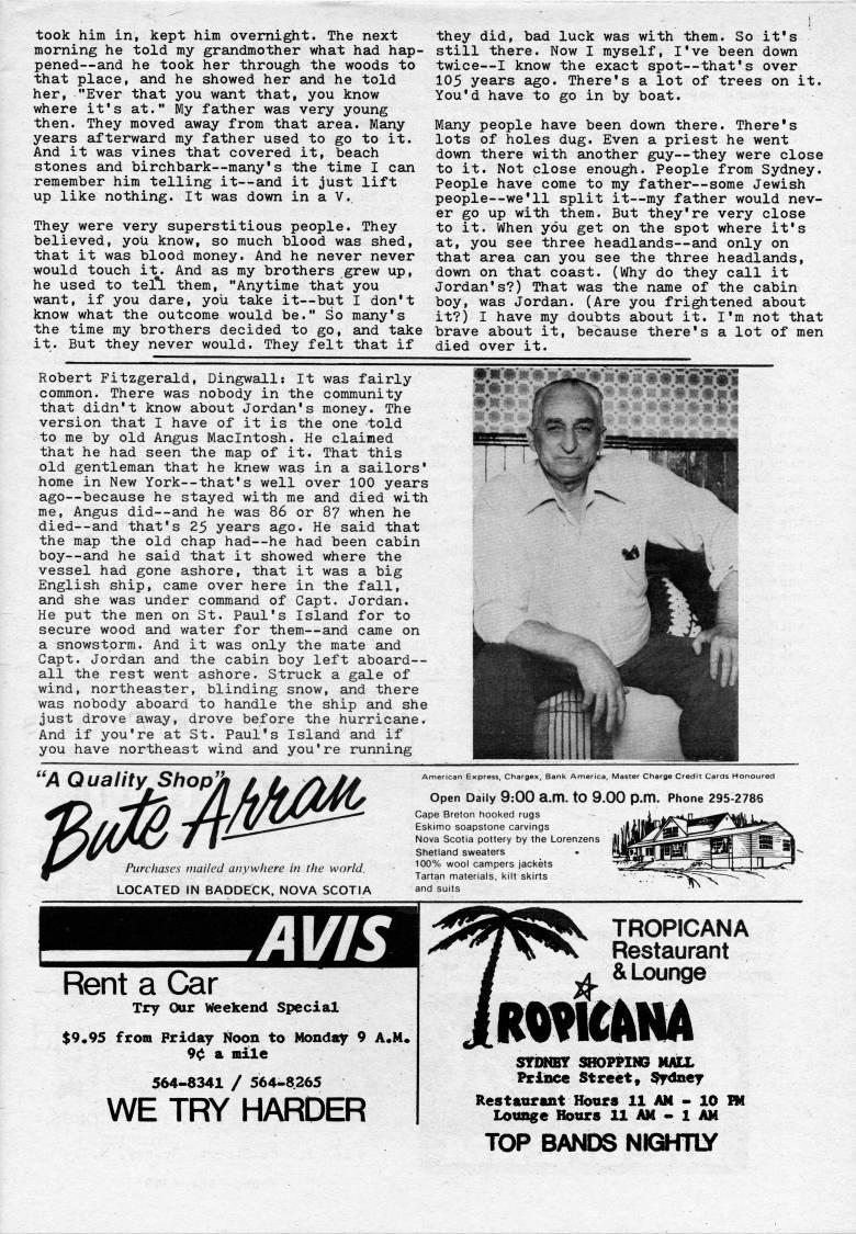Published by Ronald Caplan on 1977/8/1 (618 reads)took him in, kept him overnight. The next morning he told my grajidmother what had hap? pened • and he took her through the woods to that place, and he showed her and he told her, "Ever that you want that, you know where it's at." My father was very young then. They moved away from that area. Many years afterward my father used to go to it. And it was vines that covered it, beach stones and birchbark • many's the time I can remember him telling it • and it just lift up like nothing. It was down in a V. They were very superstitious people. They believed, you know, so much blood was shed, that it was blood money. And he never never would touch it. And as my brothers grew up, he used to tel*L them, "Anytime that you want, if you dare, you take it • but I don't know what the outcome would be." So many's the time my brothers decided to go, and take it. But they never would. They felt that if they did, bad luck was with them. So it's still there. Now I myself, I've been down twice • I know the exact spot • that's over 105 years ago. There's a lot of trees on it. You'd have to go in by boat. Many people have been down there. There's lots of holes dug. Even a priest he went down there with another guy • they were close to it. Not close enough. People from Sydney. People have come to my father • some Jewish people • we'll split it • my father would nev? er go up with them. But they're very close to it. When you get on the spot where it's at, you see three headlands • and only on that area can you see the three headlands, down on that coast. (Why do they call it Jordan's?) That was the name of the cabin boy, was Jordan. (Are you frightened about it?) I have my doubts about it. I'm not that brave about it, because there's a lot of men died over it. Robert Fitzgerald, Dingwall: It was fairly common. There was nobody in the community that didn't know about Jordan's money. The version that I have of it is the one told to me by old Angus Macintosh. He claimed that he had seen the map of it. That this old gentleman that he knew was in a sailors' home in New York--that's well over 100 years ago • because he stayed with me and died with me, Angus did • and he was 86 or 87 when he died • and that's 25 years ago. He said that the map the old chap had • he had been cabin boy • and he said that it showed where the vessel had gone ashore, that it was a big English ship, came over here in the fall, and she was under command of Capt. Jordan. He put the men on St. Paul's Island for to secure wood and water for them • and came on a snowstorm. And it was only the mate and Capt. Jordan and the cabin boy left aboard • all the rest went ashore. Struck a gale of wind, northeaster, blinding snow, and there was nobody aboard to handle the ship and she just drove away, drove before the hurricane. And if you're at St. Paul's Island and if you have northeast wind and you're running "iA Quality Shop'k k America, Master Charge Credit Card Open Daily 9:00 a.m. tO 9.00 p.m. Phone 295-2786 Purchases mailed anywhere in the world. LOCATED IN BADDECK, NOVA SCOTIA Cape Breton hooked rugs Eskimo soapstone carvings Nova Scotia pottery by the Lorenzens Shetland sv /eaters 100% wool campers jackets Tartan materials, kilt skirts and suits AVIS Rent a Car Try Our Weekend Special $9.95 from Friday Noon to Monday 9 A.M. 9C a mile 564-8341 / 564-8265 WE TRY HARDER TROPICANA Restaurant &Lounge; ROmi'MA STDNSr SHOPPINS MALL PriiDce St reet 9 Sydney Restaurant Hours 11 AM - 10 PM Lounge Hours 11 AM - 1 AM TOP BANDS NIGHTiy