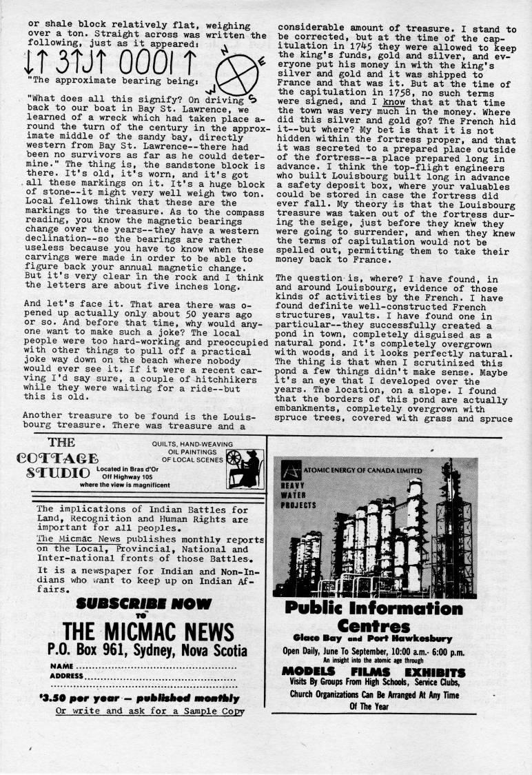 Published by Ronald Caplan on 1977/8/1 (1116 reads)or shale block relatively flat, weighing over a ton. Straight across was written the following, just as it appeared: it 3TJt 0001T "The approximate bearing being: "What does all this signify? On driving ' back to our boat in Bay St. Lawrence, we learned of a wreck which had taken place a- round the turn of the century in the approx? imate middle of the sandy bay, directly western from Bay St. Lawrence • there had been no survivors as far as he could deter? mine." The thing is, the sandstone block is there. It's old, it's worn, and it's got .all these markings on it. It's a huge block of stone • it might very well weigh two ton. Local fellows think that these are the markings to the treasure. As to the compass reading, you know the magnetic bearings change over the years • they have a western declination • so the bearings are rather useless because you have to know when these carvings were made in order to be able to figure back your annual magnetic change. But it's very clear in the rock and I think the letters are about five inches long. And let's face it. That area there was o- pened up actually only about 50 years ago or so. And before that time, why would any? one want to make such a joke? The local people were too hard-working and preoccupied with other things to pull off a practical joke way down on the beach where nobody would ever see it. If it were a recent car? ving I'd say sure, a couple of hitchhikers while they were waiting for a ride • but this is old. Another treasure to be found is the Louis? bourg treasure. There was treasure and a considerable amount of treasure. I stand to be corrected, but at the time of the cap? itulation in 1745 they were allowed to keep the king's funds, gold and silver, and ev? eryone put his money in with the king's silver and gold and it was shipped to Framce and that was it. But at the time of the capitulation in 1758, no such terms were signed, and I know that at that time the town was very much in the money. Where did this silver and gold go? The French hid it • but where? My bet is that it is not hidden within the fortress proper, and that it was secreted to a prepared place outside of the fortress • a place prepared long in advance. I think the top-flight engineers who built Louisbourg built long in advance a safety deposit box, where your vsLLuables could be stored in case the fortress did ever fall. My theory is that the Louisbourg treasure was taken out of the fortress dur? ing the seige, just before they kneW they were going to surrender, and when they knew the tenns of capitulation would not be spelled out, permitting them to take their money back to France. The question-is, where? I have found, in and around Louisbourg, evidence of those kinds of activities by the French. I have found definite well-constructed French structures, vaults. I have found one in particular • they successfully created a pond in town, completely disguised as a natural pond. It's completely overgrown with woods, and it looks perfectly natural. The thing is that when I scrutinized this pond a few things didn't make sense. Maybe it's an eye that I developed over the years. The location, on a slope. I found that the borders of this pond are actually embankments, completely overgrown with spruce trees I covered with grass and spruce THE STUDIO QUILTS, HAND-WEAVING OIL PAINTINGS OF LOCAL SCENES Located in Bras d'Or Off Highway 105 where the view is magnificent The implications of Indian Battles for Land, Recognition and Human Rights are important for all peoples. The Micmac News publishes monthly reports on the Local, Provincial, National and Inter-national fronts of those Battles. It is a newspaper for Indian and Non-In? dians who want to keep up on Indian Af? fairs. StfBSCIIIBI MOW THE MICMAC NEWS P.O. Box 961, Sydney, Nova Scotia NAME ADDRESS *3.S0 pmr ymmr ' pyhlhkmd mpmfkly Or write and ask for a Sample Copy Public Information Centres Glace Bay and Port Hawkesbury Open Daily, June To September, 10:00 a.m.- 6:00 p.m. An insight into the atomic age through MODELS FILMS EXHIBITS Visits By Groups From High Schools, Service Qubs, Church Organizations Can Be Arranged At Any Time Of The Year