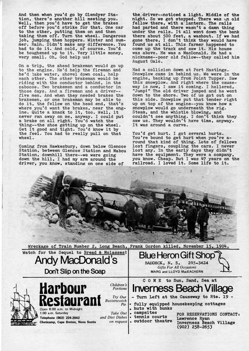 Published by Ronald Caplan on 1978/6/1 (344 reads)And then when you'd go by Glendyer Sta? tion, there's another hill meeting you. Well, then you'd have to get the brakes off before you'd strike for that. One car to the other, putting them on and then taking them off. Turn the wheel. Dangerous job, jumping them hoppers. Winter and sum? mer. Rain. Didn't make any difference. You had to do it. And cold, of course. You'd be toughened up to it. Very little money, very small. Oh, God help us J On a trip, the ahead brakeman would go up to the engine. He'd help the fireman and he'd take water, shovel down coal, help each other. The other brakeman would be riding with the conductor behind, in the caboose. Two brakemen and a conductor in those days. And a fireman and a driver • five men. And when they needed brakes the brakemen, or one brakeman may be able to do it, the fellow on the head end, that's where you'd want the brakes," near the eng? ine. Quite a knack to it, too. Well, it never ran away on me, anyway. I could put a brake on all right. You'd watch the thing • the shoe getting up on the wheel. Get it good and tight. You'd know it by the feel. You had to really pull on that wheel. Coming from Hawkesbury, down below Glencoe Station, between Glencoe Station and Mabou Station, downhill there • we were going down the hill, I had my arm around the driver, you know, standing on one side of the driver • noticed a light. Middle of the night. So we got stopped. There was >.jn old fellow there, with a lantern. The rails had parted and there wasn't a damn thing under the rails. It all went down the bank there about 500 feet, a washout. If we had gone there, I don't think they would have found us at all. This farmer happened to come up the track and saw it. His house was above. He was a MacDonald. He had a nickname • poor old fellow • they called him August Gale. Had a collision down at Port Hastings. Snowplow came in behind us. We were in the engine, backing up from Point Tupper. Saw this snowplow. And right where the cause? way is now, I saw it coming. I hollered, "JumpI" The old driver jumped and he went down to the shore. Two of us got out on this side. Snowplow put that tender right up on top of the engine • you know how a snowplow would go underneath the rig. Steam, and the whistle blowing, and couldn't see anything. I don't think they saw us. They wouldn't have time, anyway. It was around a curve. You'd get hurt. I got several hurts. You're bound to get hurt when you're a- round that kind of thing. Lots of fellows lost fingers, coupling the cars. I never lost any. In the early days they didn't have the equipment. They were a company, you know. Cheap. But I was '7 years on the railroad. I loved it. Some life to it. Wreckage of Train Number 2. Long Beach, Frank Gordon killed, November 15, 1904. Watch for the Sequel to Bread & Molassest Andy MacDonald's Don't Slip on the Soap Blue Heron Gift Shop BADDECK, N. S. 295-3424 Gifts For A It Occasions MARG and LLOYD MacEACHERN Harbour Restaurant Children's Portions Try Our Butterscotch Pie Open 8:00 a.m. to Midnight 1:00 a.m. Saturday Telephone (902) 224-2042 Cheticamp, Cape Breton, Nova S Take Out and Diet Dishes on request COME to Sun, Sand, Sea at Inverness Beach Village - Turn Left at the Causeway to Rte. 19 - fully equipped housekeeping cottages , huts with bunks , campsites pQj' RESERVATIONS CONTACT: . tennis courts Lawrence Ryan .outdoor theatre mvemess Beach Village (902) 258-2653