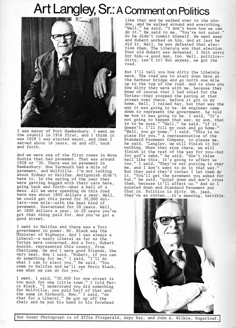 Published by Ronald Caplan on 1980/6/1 (680 reads)Art Langley Sr: a Comment on Politics I was mayor of Port Hawkesbury. I went on the council in 1916 first, and I think it was 1929 I was elected mayor, and then I served about 16 years, on and off, back and forth. And we were one of the first towns in Nova Scotia that had pavement. That was around 1928 or '30. There was no pavement in Hawkesbury. Now Yarmouth had a mile of pavement, and Wolfville. I'm not talking about Sydney or Halifax, Antigonish didn't have it. In the spring of the year they were getting bogged with their cars here, going back and forth--what a hell of a mess. All we were spending on this road here was about 1800 dollars a year. Well, we could get this paved for 30,000 dol- lars--one mile--with the best kind of pavement. Guaranteed for 20 years. Well, at 1800 dollars a year, in 20 years you've got that thing paid for. And you've got a good street. I went to Halifax and there was a Tory government in power. Mr. Black was the Minister of Highways. And I was always a Liberal--a nasty Liberal as far as the Tories were concerned. And a Tory, Hubert Aucoin, represented this county, from Cheticamp. He and I were good friends, the very best. Now I said, "Hubert, if you can do something for me," I said, "I'll do what I can to elect you." He said, "You come to Halifax and we'll see Percy Black, see what we can do for you." I went. I said, "30,000 for one street is too much for one little town." I told Per? cy Black, "I understand you did something for Wolfville, you paid half of that and the same in Yarmouth. Now," I said, "do that for a Liberal." He got up off the chair and he put his hand to his forehead like that and he walked over to the win? dow, and he walked around and everything. "Well," he said, "I don't know how we can do it." He said to me, "You're not quiet." So he didn't commit himself. We went away and Hubert worked on him. And at last he did it. Well, he was defeated that elec? tion then. The Liberals won that election. Poor old Hubert was defeated. I felt sorry for him--a good man, too. Well, politics-- dirty, isn't it? But anyway, we got the road. But I'll tell you how dirty the Liberals were. The road was to start down here at the harbour bridge and go north one mile up to the top of the road. And to show you how dirty they were with me, because they knew of course that I had voted for the Tories--they stopped the paving at that street over there, before it got to my home. Well, I raised hay, but that was the way it was going to be. An engineer came down to represent the government, he told me how it was going to be. I said, "It's not going to happen that way, my son, that is to be sure." "Well," he said, "if it doesn't, I'll fill my coat and go home." "Well, you go home," I said. "This is no place for you." A representative of the Standard Pavement Company, to please me, he said, "Langley, we will finish it for nothing. When they stop there, we will finish it the rest of the way for you--but for god's sake," he said, "don't raise hell like this. It's going to affect us too." I said, "They're not putting it over me, and I don't want to do it that way." But they said they'd rather I let them do it. "You'll get the pavement you asked for but," he said, "quiet down and don't cross them, because it'll affect us." And so I quieted down and Standard Pavement put that in. Politics is dirty. Oh, jeez, they're as rotten ... it's amazing, terrible. Our Cover Photograph is of Effie Fitzgerald, Aspy Bay, and John A. Wilkie, Sugarloaf.