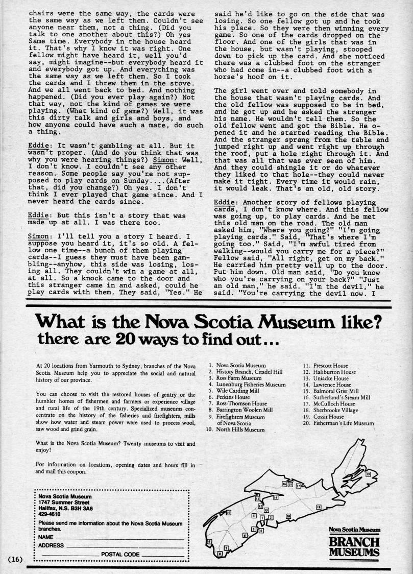 Published by Ronald Caplan on 1980/6/1 (393 reads)chairs were the same way, the cards were the same way as we left them. Couldn't see anyone near them, not a thing. (Did you talk to one another about this?) Oh yes Same time. Everybody in the house heard it. That's why I know it was right. One fellow might have heard it, well you'd say, might imagine • but everybody heard it and everybody got up. And everything was the same way as we left them. So I took the cards and I threw them in the stove. And we all went back to bed. And nothing happened. (Did you ever play again?) Not that way, not the kind of games we were playing. (What kind of game?) Well, it was this dirty talk and girls and boys, and how anyone could have such a mate, do such a thing. Eddie: It wasn't gambling at all. But it wasn't proper. (And do you think that was why you were hearing things?) Simon: Well, I don't know. I couldn't see any other reason. Some people say you're not sup? posed to play cards on Sunday....(After that, did you change?) Oh yes. I don't think I ever played that game since. And I never heard the cards since. Eddie: But this isn't a story that was made up at all. I was there too. Simon: I'll tell you a story I heard. I suppose you heard it, it's so old. A fel? low one time • a bunch of them playing cards--I guess they must have been gam? bling • anyhow, this side was losing, los? ing all. They couldn't win a game at all, at all. So a knock came to the door and this stranger came in and asked, could he play cards with them. They said, "Yes." He said he'd like to go on the side that was losing. So one fellow got up and he took his place. So they were then winning every game. So one of the cards dropped on the floor. And one of the girls that was in the house, but wasn't playing, stooped down to pick up the card. And she noticed there was a clubbed foot on the stranger who had come in • a clubbed foot with a horse's hoof on it. The girl went over and told somebody in the house that wasn't playing cards. And the old fellow was supposed to be in bed, and he got up and he asked the stranger his name. He wouldn't tell them. So the old fellow went and got the Bible. He o- pened it and he started reading the Bible. And the stranger sprang from the table and jumped right up and went right up through the roof, put a hole right through it. And that was all that was ever seen of him. And they could shingle it or do whatever they liked to that hole • they could never make it tight. Every time it would rain, it would leak. That's an old, old story. Eddie: Another story of fellows playing cards, I don't know where. And this fellow was going up, to play cards. And he met this old man on the road. The old man asked him, "Where you going?" "I'm going playing cards." Said, "That's where I'm going too." Said, "I'm awful tired from walking--would you carry me for a piece?" Fellow said, "All right, get on my back." He carried him pretty well up to the door. Put him down. Old man said, "Do you know who you're carrying on your back?" "Just an old man," he said. "I'm the devil," he said. "You're carrying the devil now. I What is the Nova Scotia Museum like? there are 20 v'ays to find out... (16) At 20 locations from Yarmouth to Sydney, branches of the Nova Scotia Museum help you to appreciate the social and natural history of our province. You can choose to visit the restored houses of gentry or the humbler homes of fishermen and farmers or experience village and rural hfe of the 19th century. Specialized museums con? centrate on the history of the fisheries and firefighters, mills show how water and steam power were used to process wool, saw wood and grind grain. What is the Nova Scotia Museum? Twenty museums to visit and enjoy! For information on locations, opening dates and hours fill in and mail this coupon. : Nova Scotia Museum : 1747 Summer Street • Halifax, N.S. B3H 3A6 : 429-4610 ; Please send me inlbmiation about the Nova Scotia Museum > branches. I NAME : ADDRESS POSTAL CODE 1. Nova Scotia Museum 2. History Branch, Citadel Hill 3. Ross Farm Museum 4. Lunenburg Fisheries Museum 5. Wile Carding Mill 6. Perkins House 7. Ross-Thomson House 8. Barrington Woolen Mill 9. Firefighters Museum of Nova Scotia 10. North Hills Museum 11. Prescott House 12. Haliburton House 13. Uniacke House 14. Lawrence House 15. Balmoral Grist Mill 16. Sutherland's Steam Mill 17. McCulloch House 18- Sherbrooke Village 19. Cossit House 20. Fisherman's Life Museum