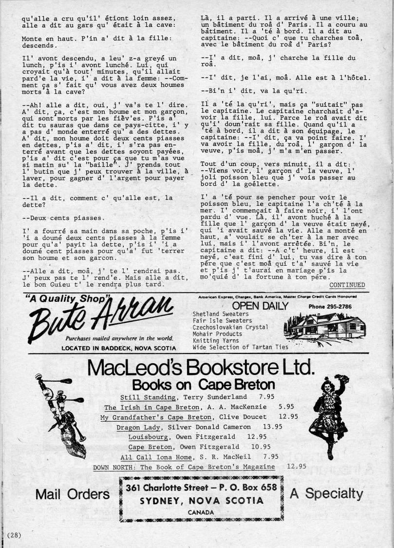 Published by Ronald Caplan on 1980/6/1 (333 reads)qu'alle a cru qu'il' etiont loin assez, alle a dit au gars qu' etait a la cave: Monte en haut. P'in descends. a' dit a la fille: La, il a parti. II a arrive a une ville; un batiment du roa d' Paris. II a couru au batiment. II a 'te a bord. II a dit au capitaine: --Quoi c' que tu charches toa, avec le batiment du roa d' Paris? II' avont descendu, a leu' z-a greye un lunch, p'is i' avont lunche. Lui, qui croyait qu'a tout' minutes, qu'il allait pard'e la vie, i' a dit a la femme: --Com? ment ca s' fait qu' vous avez deux houmes morts'a la cave? --Ah! alle a dit, oui, j' va's te 1' dire. A' dit, ca, c'est mon houme et mon garcon, qui sont'morts par les fiev'es. P'is a dit tu sauras que dans ce pays-citte, i' y a pas d' monde enterr' qu' a des dettes. A' dit, mon houme doit deux cents piasses en dettes, p'is a' dit, i' s'ra pas en- terre avant que les dettes soyont payees, p'is a' dit c'est pour ca que tu m'as vue si matin su' la "bailie . J' prends tout 1' butin que j' peux trouver a la ville, a laver, pour gagner d' 1'argent pour payer la dette. --I' roa. a dit, moa, j' charche la fille du -I' dit, je I'ai, moa. Alle est a 1'hotel. • Bi'n 1' dit, va la qu'ri. --I1 a dit, dette? comment c' qu'alle est, la --Deux cents piasses. I' a fourre sa main dans sa poche, p'is i' 'i a doune deux cents piasses a la femme pour'qu'a' payit la dette, p'is i' 'i,a doune cent piasses pour qu'a' fut 'terror son houme et son garcon. --Alle a dit, moa, j' te 1' rendrai pas. J' peux pas te 1' rend'e. Mais alle a dit, le bon Guieu t' le rendra plus tard. II a 'te la qu'ri', mais 9a "suitait" pas le capitaine. Le capitaine charchait d'a- voir la fille, lui. Parce le roi avait dit qu'i' doun'rait sa fille. Quand qu'il a 'te a bord, il a dit a son equipage, le capitaine: --I' dit, 9a va point faire. I' va avoir la fille, du roa, 1' garcon d' la veuve, p'is moa, j' m'a m'en passer. Tout d'un coup, vers minuit, il a dit: --Viens voir, 1' gar9on d' la veuve, 1' joli poisson bleu que j' vols passer au bord d' la goelette. I' a 'te pour se pencher pour voir le poisson bleu, le capitaine I'a ch'te a la mer. I' commen9ait a faire noir, i' I'ont pardu d' vue. La, il' avont huche a la fille que 1' garcon d' la veuve etait neye, qui 'i avait sauve la vie. Alle a monte en haut, a' voulait se ch'ter a la mer avec lui, mais i' 1'avont arretee. Bi'n, le capitaine a dit: • A c't' heure, il est neye, c'est fini d' lui, tu vas dire a ton pere que c'est moa qui t'a' sauve la vie et p'is j' t'aurai en mariage p'is la mo'quie d' la fortune a ton pere. CONTINUED "A Quality St'op American Express, Charjiax, Bank America, Master Charge Credit Cards Honpurad Purchases mailed anywhere in the world. LOCATED IN BADDECK; NOVA SCOTIA OPEN DAILY Shetland Sweaters Fair Isle Sweaters Czechoslovakian Crystal Mohair Products Knitting Yarns Wide Selection of Tartan Ties Phone 295-2786 MacLeod's Bookstore Ltd. Books on Caoe Breton Still Standing, Terry Sunderland 7.95 The Irish in Cape Breton, A. A. MacKenzie 5.95 My Grandfather's Cape Breton, Clive Doucet 12.95 Dragon Lady, Silver Donald Cameron 13.95 Louisbourg, Owen Fitzgerald 12.95 Cape Breton, Owen Fitzgerald 10.95 Al-1 Call lona Home, S. R. MacNeil 7.95 DOWN NORTH: The Book of Cape Breton's Magazine 12.95 r Kn 1 r '' I 361 Charlotte Street - P. O. Box 658 i j' o ' %'ii. Mali Orders | '''''' '''' ,,',,' | A Specialty I CANADA I (28)