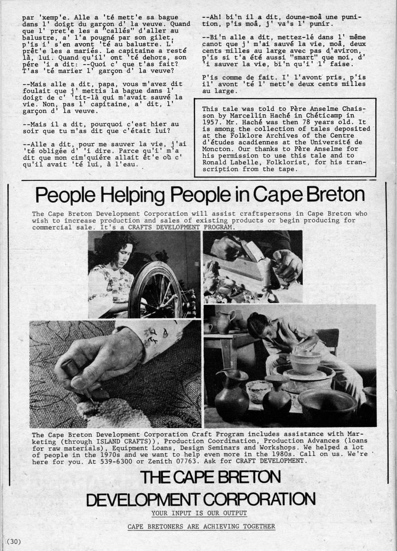 Published by Ronald Caplan on 1980/6/1 (361 reads)par 'xemp'e. Alle a 'te mett'e sa bague dans 1' doigt du garcon d ' la veuve. Quand que 1' pret'e les a calles" d'aller au balustre, a' I'a pougne par son gilet, p'is i' s'en avont 'te au balustre. L' pret'e les a maries. Le capitaine a reste la, lui. Quand qu'il' ont 'te dehors, son pere 'i a dit: • Quoi c' que t'as fait? T'as 'te marier 1' garden d' la veuve? • Mais alle a dit, papa, vous m'avez dit foulait que j' mettis la bague dans 1' doigt de c' 'tit-la qui m'avait sauve la vie. Non, pas 1' capitaine, a' dit, 1' garcon d' la veuve. --Mais il a dit, pourquoi c'est hier au soir que tu m'as dit que c'etait lui? • Alle a dit, pour me sauver la vie, j'ai 'te obligee d' 'i dire. Parce qu'i' m'a dit que mon cim'quiere allait et'e oli c' qu'il avait 'te lui, a I'eau. --Ah! bi'n il a dit, doune-moa une puni- tion, p'is moa, j' va's 1' punir. • Bi'n alle a dit, mettez-le dans 1' meme canot que j' m'ai sauve la vie, moa, deux cents milles au large avec pas d/aviron, p'is si t'a ete aussi "smart" que moi, d' 'i sauver la vie, bi'n qu'i' 1' false. P'is comme de fait. I' I'avont pris, p'is il' avont 'te 1' mett'e deux cents milles au large. This tale was told to Pere Anselme Chais- son by Marcellin Hache in Cheticamp in 1957. Mr. Hache was then 78 years old. It is among the collection of tales deposited at the Folklore Archives of the Centre d'etudes acadiennes at the Universite de Moncton. Our thanks to P're Anselme for his permission to use this tale and to Ronald Labelle, Folklorist, for his tran? scription from the tape. People Helping People in Cape Breton The Cape Breton Development Corporation will assist craftspersons in Cape Breton who wish to increase production and sales of existing products or begin producing for commercial sale. It's a CRAFTS DEVELOPMENT PROGRAM. The Cape Breton Development Corporation Craft Program includes assistance with Mar? keting (through ISLAND CRAFTS)), Production Coordination, Production Advances (loans for raw materials). Equipment Loans, Design Seminars and Workshops. We helped a lot of people in the 1970s and we want to help even more in the 1980s. Call on us. We're here for you. At 539-6300 or Zenith 07763. Ask for CRAFT DEVELOPMENT. THE CAPE BRETON DEVELOPMENT CXDFPORATIO' YOUR INPUT IS OUR OUTPUT CAPE BRETONERS ARE ACHIEVING TOGETHER (30)