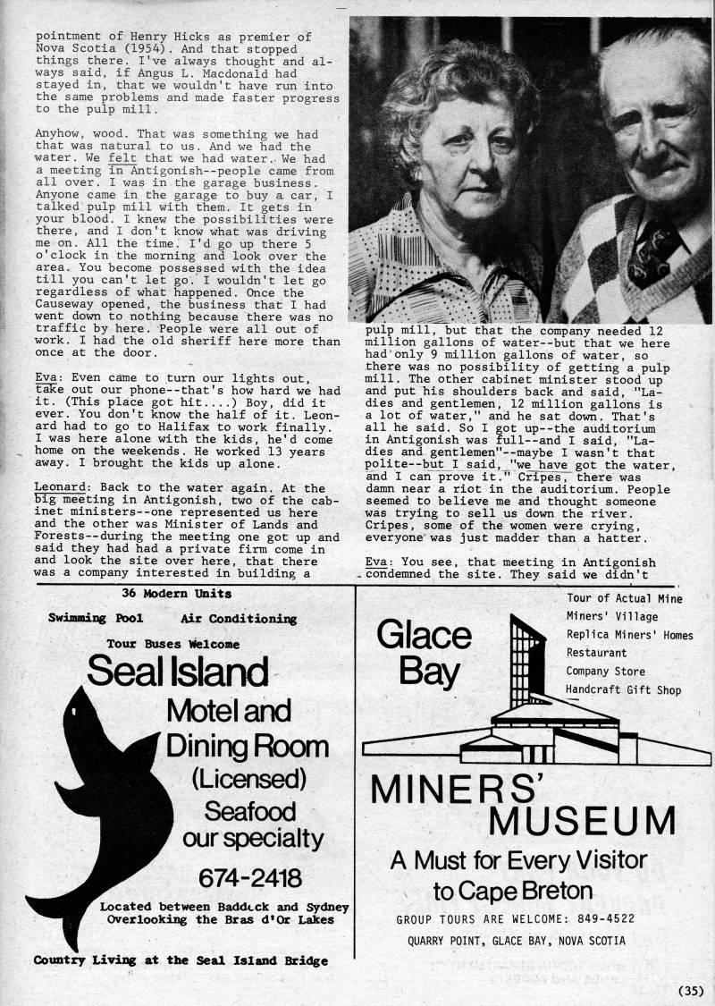 Published by Ronald Caplan on 1980/6/1 (320 reads)pointment of Henry Hicks as premier of Nova Scotia (1954). And that stopped things there. I've always thought and al? ways said, if Angus L. Macdonald had stayed in, that we wouldn't have run into the same problems and made faster progress to the pulp mill. Anyhow, wood. That was something we had that was natural to us. And we had the water. We felt that we had water.. We had a meeting in Antigonish--people came from all over, I was in the garage business. Anyone came in the garage to buy a car, I talked pulp mill with them. It gets in , your blood. I knew the possibilities were there, and I don't know what was driving me on. All the time. I'd go up there 5 o'clock in the morning and look over the area. You become possessed with the idea till you can't let go. I wouldn't let go regardless of what happened. Once the Causeway opened, the business that I had went down to nothing because there was no traffic by here. People were all out of work. I had the old sheriff here more than once at the door. Eva: Even came to turn our lights out, take out our phone--that's how hard we had it. (This place got hit....) Boy, did it ever. You don't know the half of it. Leon? ard had to go to Halifax to work finally. I was here alone with the kids, he'd come home on the weekends. He worked 13 years away. I brought the kids up alone. Leonard: Back to the water again. At the big meeting in Antigonish, two of the cab? inet ministers--one represented us here and the other was Minister of Lands and Forests • during the meeting one got up and said they had had a private firm come in and look the site over here, that there was a company interested in building a pulp mill, but that the company needed 12 million gallons of water--but that we here had'only 9 million gallons of water, so there was no possibility of getting a pulp mill. The other cabinet minister stood up and put his shoulders back and said, "La? dies and gentlemen, 12 million gallons is a lot of water," and he sat down. That's all he said. So I got up--the auditorium in Antigonish was full • and I said, "La? dies and gentlemen"--maybe I wasn't that polite--bju'I said, "we_have'got the water, and I can prove it." Cripes, there was damn near a riot in the auditorium. People seemed to believe me and thought someone was trying to sell us down the river. Cripes, some of the women were crying, everyone was just madder than a hatter, Eva: You see, that meeting in Antigonish 'condemned the site. They said we didn't 36 Modern Units Swimming Pool Air Conditioning Tour Buses Welcome Seal Island A Moteland ''' Dining Room ''''L (Licensed) '''B Seafood ''V our specialty ''' 674-2418 '[''''r Loc at ed ''''m Overlooki] Country Living at the Seal Island Bridge Located between Baddeck and Sydney Overlooking the Bras d*Qr Lakes Tour of Actual Mine Miners' Village Replica Miners' Homes Restaurant Company Store Handcraft Gift Shop MINERS' MUSEUM A Must for Every Visitor to Cape Breton GROUP TOURS ARE WELCOME: 849-4522 QUARRY POINT, GLACE BAY, NOVA SCOTIA (35)