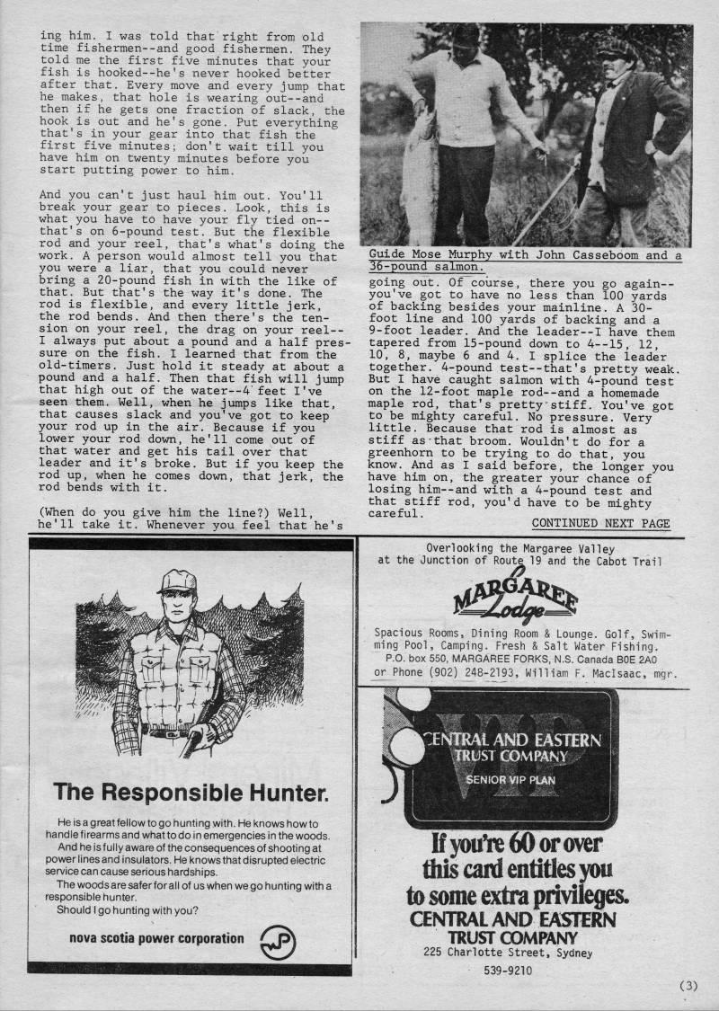 Published by Ronald Caplan on 1980/8/1 (332 reads)ing him, I was told that' right from old time fishermen--and good fishermen. They told me the first five minutes that your fish is hooked--he's never hooked better after that. Every move and every jump that he makes, that hole is wearing out--and then if he gets one fraction of slack, the hook is out and he's gone. Put everything that's in your gear into that fish the first five minutes; don't wait till you have him on twenty minutes before you start putting power to him. And you can't just haul him out. You'll break your gear to pieces. Look, this is what you have to have your fly tied on-- that's on 6-pound test. But the flexible rod and your reel, that's what's doing the work. A person would almost tell you that you were a liar, that you could never bring a 20-pound fish in with the like of that. But that's the way it's done. The rod is flexible, and every little jerk, the rod bends. And then there's the ten? sion on your reel, the drag on your reel-- I always put about a pound and a half pres? sure on the fish. I learned that from the old-timers. Just hold it steady at about a pound and a half. Then that fish will jump that high out of the water--4"feet I've seen them. Well, when he jumps like that, that causes slack and you've got to keep your rod up in the air. Because if you lower your rod down, he'll come out of that water and get his tail over that leader and it's broke. But if you keep the rod up, when he comes down, that jerk, the rod bends with it. (When do you give him the line?) Well, he'll take it. Whenever you feel that he's Guide Mose Murphy with John Casseboom and a 36-pound salmon. going out. Of course, there you go again-- you've got to have no less than 100 yards of backing besides your mainline. A 30- foot line and 100 yards of backing and a 9-foot leader. And the leader--I have them tapered from 15-pound down to 4--15, 12, 10, 8, maybe 6 and 4. I splice the leader together. 4-pound test--that's pretty weak. But I have caught salmon with 4-pound test on the 12-foot maple rod--and a homemade maple rod, that's pretty stiff. You've got to be mighty careful. No pressure. Very little. Because that rod is almost as stiff as that broom. Wouldn't do for a greenhorn to be trying to do that, you know. And as I said before, the longer you have him on, the greater your chance of losing him • and with a 4-pound test and that stiff rod, you'd have to be mighty careful. CONTINUED NEXT PAGE The Responsible Hunter. He is a great fellow to go hunting with. He Icnows how to handle firearms and what to do in emergencies in the woods. And he is fully aware of the consequences of shooting at power lines and insulators. He knows that disrupted electric service can cause serious hardships. The woods are safer for all of us when we go hunting with a responsible hunter. Should I go hunting with you? nova scotia power corporation Overlooking the Margaree Valley at the Junction of Route 19 and the Cabot Trail Spacious Rooms, Dining Room & Lounge. Golf, Swim? ming Pool, Camping. Fresh & Salt Water Fishing. P.O. box 550, MARGAREE FORKS, N.S. Canada BOE 2A0 or Phone (902) 248-2193, William F. Maclsaac, mgr. :ENTRAI AND EASTERN TRUST CX>Mf'NY SENIOR VfP PIAH IfyMi1re60wover this canl entitles yMi to some extra privileges. CEIMTRAL AND EASTERN TRUSTCOMPANY 225 Charlotte Street, Sydney 539-9210 (3)