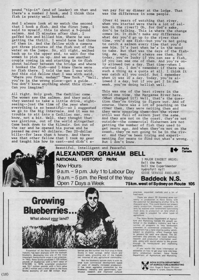 Published by Ronald Caplan on 1980/8/1 (300 reads)pound "tip-it" (end of leader) on that and there's a number 2 hook, and I think this fish is pretty well hooked. And I always look at my watch the second that I hook a fish. And the first jump, I said to myself, this is about a 9-pound salmon. And 25 minutes after that, I gaffed him and killed him. Where he was getting the thrill, I would have had three of them in. And the fellow with a camera got three pictures of the fish out of the water on the jumps. So, all right, walked back up to the upper end, to wait for the women to pick us. up. And we saw another couple coming in and starting in to fish about halfway between the bridge and where I hooked the fish--and I-knew there were no fish there. I told the man I was with. And this old fellow that I was with said, "Where you from, madam?" "New York." "Well, you're in the wrong place--get a guide. You don't know anything about this river." Can you imagine? All right. Holy gosh. The Cadillac came. The women saw the salmon. And they said they wanted to take a little drive, sight- seeing--just the time of the year when everything is so beautiful--so I suggested we go to the Big Intervale. And it was no trouble to sit into a Cadillac car, you know, not a bit. Well, they thought that was glorious, out of the world altogether. Came back down to the' Kilmuir. Got out of the car and he opened his purse and he passed me over 40 dollars. Two 20-dollar bills--for less than 4 hours. And there was that other fellow that I took my gear and taught him how to cast • and didn't e- ven pay for my dinner at the lodge. That was the difference in some people. (Over 41 years of watching that river, when you started were there a lot of sal? mon in the river?) Oh, for God's sake, don't be talking. This is where the change comes in. It didn't make any difference what day you'd go up to the river that time, you'd see fish--but you're not going to catch a salmon every time that you'd see him. It's just when he's in the mood to take. But that was the days of the fish? ing. Aw, man, you'd always see them. But today, you're lucky if you can see a fish, if you can see one of them. And you're on? ly allowed two a day. That time--when I started in, I don't remember if there was such a thing as a quota at all. I think it was catch all you could. But I remember when it was 10 a day. Today, you're al? lowed 2 a day, but if you get 2 in the week, you're doing hellish well. This was one of the best rivers in the world one time, the Margaree River here. (What changed it?) Well, that's the ques? tion they're trying to figure out. And of course, there was a lot of poaching on the river then, they were netting them and they were spearing them--but the river still was full of salmon just the same. And they are not on the coast, they're not outside--the commercial fishermen are not getting the number of fish they used to get years ago. And when they're not on the coast, they're not going to be in the riv? er. And they've been trying and experi? menting for years to find out what's wrong. But I don't know. Beautiful, Intelligent and Peaceful ALEXANDER GRAHAM BELL Ni'lONAL HISTORIC PARK New Hours: 9 a.m. - 9 p.m. July 1 to Labour Day 9 a.m. - 5 p.m. the Rest of the Year 1' Parks Canada Open 7 Days a Week 3 MAJOR EXHIBIT AREAS: Bell the Man Bel! the Experimenter Hydrofoil Hall GUIDE SERVICE AVAILABLE Baddeck N.S. TSkin.west of Sydney on Route 105 Growing Blueberries... What about your land? (10) Expansion of the Nova Scotia blueberry industry has been dramatic with the lowbush blueberry developing into one of the most important horticultural crops in our province. In 1953, Nova Scotia produced 1.125 million pounds of blueberries with a farm value of $152,000. In 1979, provincial production was 10.7 million pounds with a farm value of $4.2 million and a total value to the Nova Scotia economy of over $8 million. Blue? berries are the number one fruit crop in Nova Scotia in total acreage, dollar return and export sales, providing one of the highest net incomes of any agricultural commodity. But the blueberry success story is with its large scale commercial development based on years of steadily increased production. It has taken aggressive promotion by the blueberry industry and government, con? tinuous research and improved cultural practices, expanded markets and a lot of hard work. There are about 20 thousand acres cur? rently in production in Nova Scotia with the potential for developing another 10 to 15 thousand acres This could double our present yearly production. However, expansion will only be realized with landowners committing more acres to production on land which in most cases is unsuited for other types of agriculture. The Nova Scotia Department of Agricul? ture and Marketing realizes the growth po? tential in the blueberry industry and has a number of programs to help landowners interested in commercial production. The Department has a land clearing policy which, subject to eligibility, offers financial help to growers for each acre cleared. The De? partment also provides the latest technical, research and production information avail? able, along with sound advice to the grower through its horticultural and marketing specialists. If you would like more information or assistance on how to get your land into blue? berry production contact: Nova Scotia Department of Agriculture and Marketing. NOVA SCOTIA DEPARTMENT OF AGRICULTURE & MARKETING Hon. Roger S. Bacon, Minister Walter V. Grant, Deputy Minister
