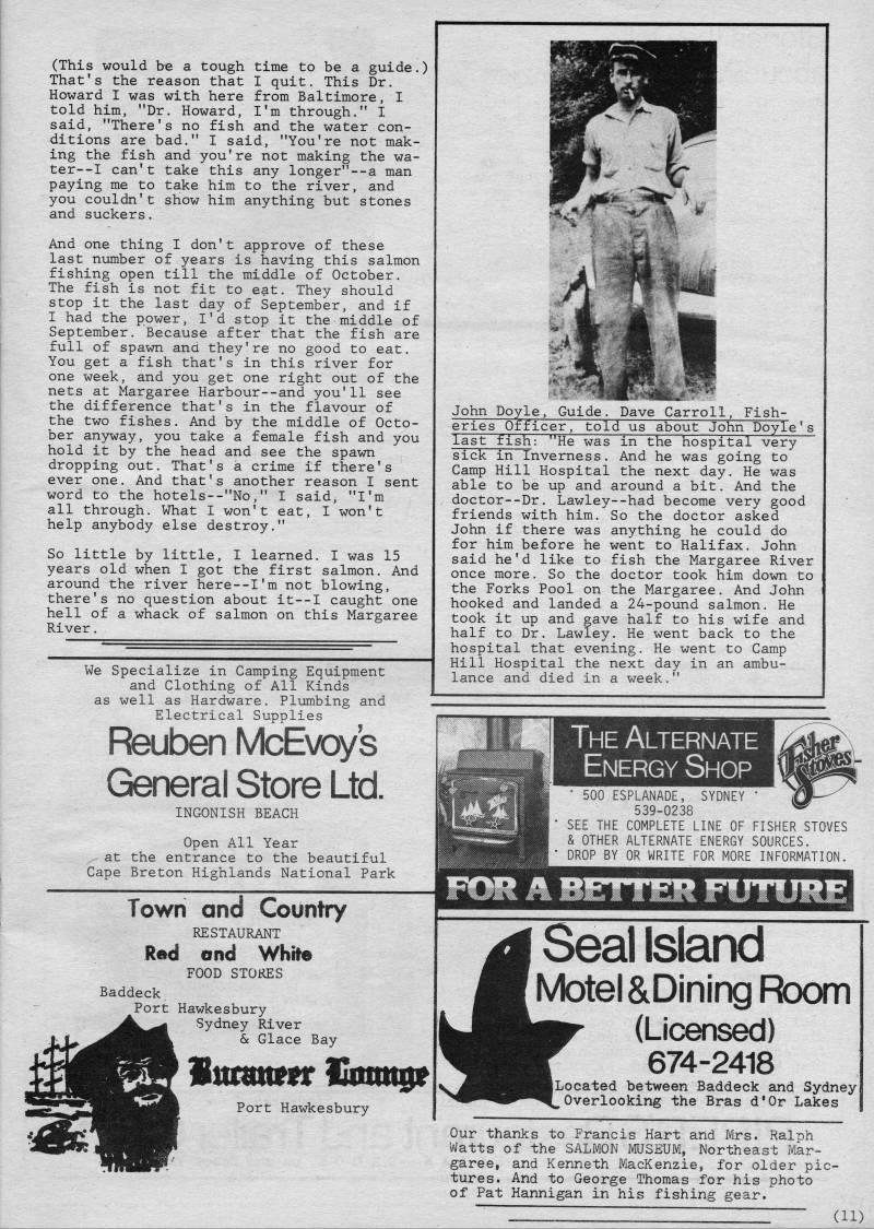 Published by Ronald Caplan on 1980/8/1 (385 reads)(This would be a tough time to be a guide.) That's the reason that I quit. This Dr. Howard I was with here from Baltimore, I told him, "Dr. Howard, I'm through." I said, "There's no fish and the water con? ditions are bad." I said, "You're not mak? ing the fish and you're not making the wa- ter--I can't take this any longer"--a man paying me to take him to the river, and you couldn't show him anything but stones and suckers. And one thing I don't approve of these last number of years is having this salmon fishing open till the middle of October. The fish is not fit to eat. They should stop it the last day of September, and if I had the power, I'd stop it the middle of September. "Because after that the fish are full of spawn ana they're no good to eat. You get a fish that's in this river for one week, and you get one right out of the nets at Margaree Harbour--and you'll see the difference that's in the flavour of the two fishes. And by the middle of Octo? ber anyway, you take a female fish and you hold it by the head and see the spawn dropping out. That's a crime if there's ever one. And that's another reason I sent word to the hotels--"No," I said, "I'm. all through. What I won't eat, I won't help anybody else destroy." So little by little, I learned. I was 15 years old when I got the first salmon. And around the river here--I'm not blowing, there's no question about it • I caught one hell of a whack of salmon on this Margaree River. We Specialize in Camping Equipment and Clothing of All Kinds as well as Hardware. Plumbing and Electrical Supplies Fteuben McEvoys General Store Ltd. INGONISH BEACH Open All Year at the entrance to the beautiful Cape Breton Highlands National Park Town and Country RESTAURANT Red ond White FOOD STOKES Baddeck Port Hawkesbury Sydney River 6e Glace Bay llmwxnt Vxamgit Port Hawkesbury John Doyle, Guide. Dave Carroll, Fish? eries Officer, told us about John Doyle's last fish: "He was in the hospital very sick in Inverness. And he was going to Camp Hill Hospital the next day. He was able to be up and around a bit. And the doctor--Dr. Lawley--had become very good friends with him. So the doctor asked John if there was anything he could do for him before he went to Halifax. John said he'd like to fish the Margaree River once more. So the doctor took him down to the Forks Pool on the Margaree. And John hooked and landed a 24-pound salmon. He took it up and gave half to his wife and half to Dr. Lawley. He went back to the hospital that evening. He went to Camp Hill Hospital the next day in an ambu? lance and died in a week." Seal Island Motel &Dining; Room (Licensed) 674-2418 Located between Baddeck and Sydney 'Overlooking the Bras d'Or Lakes Our thanks to Francis Hart and Mrs. RalDh Watts of the SALMON IVIUSEUM, Northeast Mar? garee, and Kenneth MacKenzie, for older pic? tures. And to George Thomas for his photo of Pat Hannigan in his fishing gear. ZZZZZZZZIZZIZIZZZZ (11)