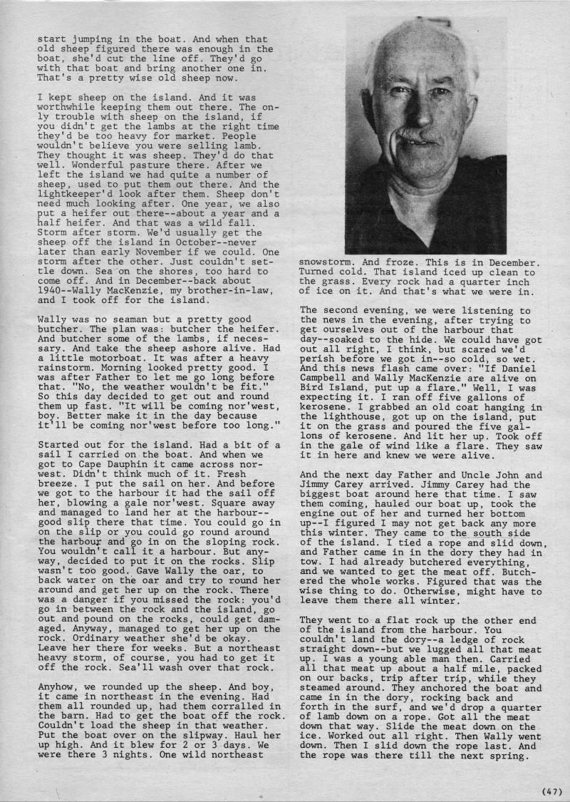Published by Ronald Caplan on 1980/8/1 (278 reads)start jumping in the boat. And when that old sheep figured there was enough in the boat, she'd cut the line off. They'd go with that boat and bring another one in. That's a pretty wise old sheep now. I kept sheep on the island. And it was worthwhile keeping them out there. The on? ly trouble with sheep on the island, if you didn't get the lambs at the right time they'd be too heavy for market. People wouldn't believe you were selling lamb. They thought it was sheep. They'd do that well. Wonderful pasture there. After we left the island we had quite a number of sheep, used to put them out there. And the lightkeeper'd look after them. Sheep don't need much looking after. One year, we also put a heifer out there--about a year and a half heifer. And that was a wild fall. Storm after storm. We'd usually get the sheep off the island in October--never later than early November if we could. One storm after the other. Just couldn't set? tle down. Sea on the shores, too hard to come off. And in December--back about 1940--Wally MacKenzie, my brother-in-law, and I took off for the island. Wally was no seaman but a pretty good butcher. The plan was: butcher the heifer. And butcher some of the lambs, if neces? sary. And take the sheep ashore alive. Had a little motorboat. It was after a heavy rainstorm. Morning looked pretty good. I was after Father to let me go long before that. "No, the weather wouldn't be fit." So this day decided to get out and round them up fast. "It will be coming nor'west, boy. Better make it in the day because it'll be coming nor'west before too long." Started out for the island. Had a bit of a sail I carried on the boat. And when we got to Cape Dauphin it came across nor- west. Didn't think much of it. Fresh breeze. I put the sail on her. And before we got to the harbour it had the sail off her, blowing a gale nor'west. Square away and managed to land her at the harbour-- good slip there that time. You could go in on the slip or you could go round around the harbouj: and go in on the sloping rock. You wouldn't call it a harbour. But any? way, decided to put it on the rocks. Slip wasn't too good. Gave Wally the oar, to back water on the oar and try to round her around and get her up on the rock. There was a danger if you missed the rock: you'd go in between the rock and the island, go out and pound on the rocks, could get dam? aged. Anyway, managed to get her up on the rock. Ordinary weather she'd be okay. Leave her there for weeks. But a northeast heavy storm,, of course, you had to get it off the rock. Sea'11 wash over that rock. Anyhow, we rounded up the sheep. And boy, it came in northeast in the evening. Had them all rounded up, had them corralled in the barn. Had to get the boat off the rock. Couldn't load the sheep in that weather. Put the boat over on the slipway. Haul her up high. And it blew for 2 or 3 days. We were there 3 nights. One wild northeast snowstorm. And froze. This is in December. Turned cold. That island iced up clean to the grass. Every rock had a quarter inch of ice on it. And that's what we were in. The second evening, we were listening to the news in the evening, after trying to get ourselves out of the harbour that day • soaked to the hide. We could have got out all right, I think, but scared we'd perish before we got in--so cold, so wet. And this news flash came over: "If Daniel Campbell and Wally MacKenzie are alive on Bird Island, put up a flare." Well, I was expecting it. I ran off five gallons of kerosene. I grabbed an old coat hanging in the lighthouse, got up on the island, put it on the grass and poured the five gal? lons of kerosene. And lit her up. Took off in the gale of wind like a flare. They saw it in here and knew we were alive. And the next day Father and Uncle John and Jimmy Carey arrived. Jimmy Carey had the biggest boat around here that time. I saw them coming, hauled our boat up, took the engine out of her and turned her bottom up--I figured I may not get back any more this winter. They came to the sjouth side of the island. I tied a rope and slid down, and Father came in in the dory they had in tow. I had already butchered everything, and we wanted to get the meat off. Butch? ered the whole works. Figured that was the wise thing to do. Otherwise, might have to leave them there all winter. They went to a flat rock up the other end of the island from the harbour. You couldn't land the dory • a ledge of rock straight down--but we lugged all that meat up. I was a young able man then. Carried all that meat up about a half mile, packed on our backs, trip after trip, while they steamed around. They anchored the boat and came in in the dory, rocking back and forth in the surf, and we'd drop a quarter of lamb down on a rope. Got all the meat down that way. Slide the meat down on the ice. Worked out all right. Then Wally went down. Then I slid down the rope last. And the rope was there till the next spring. (47)